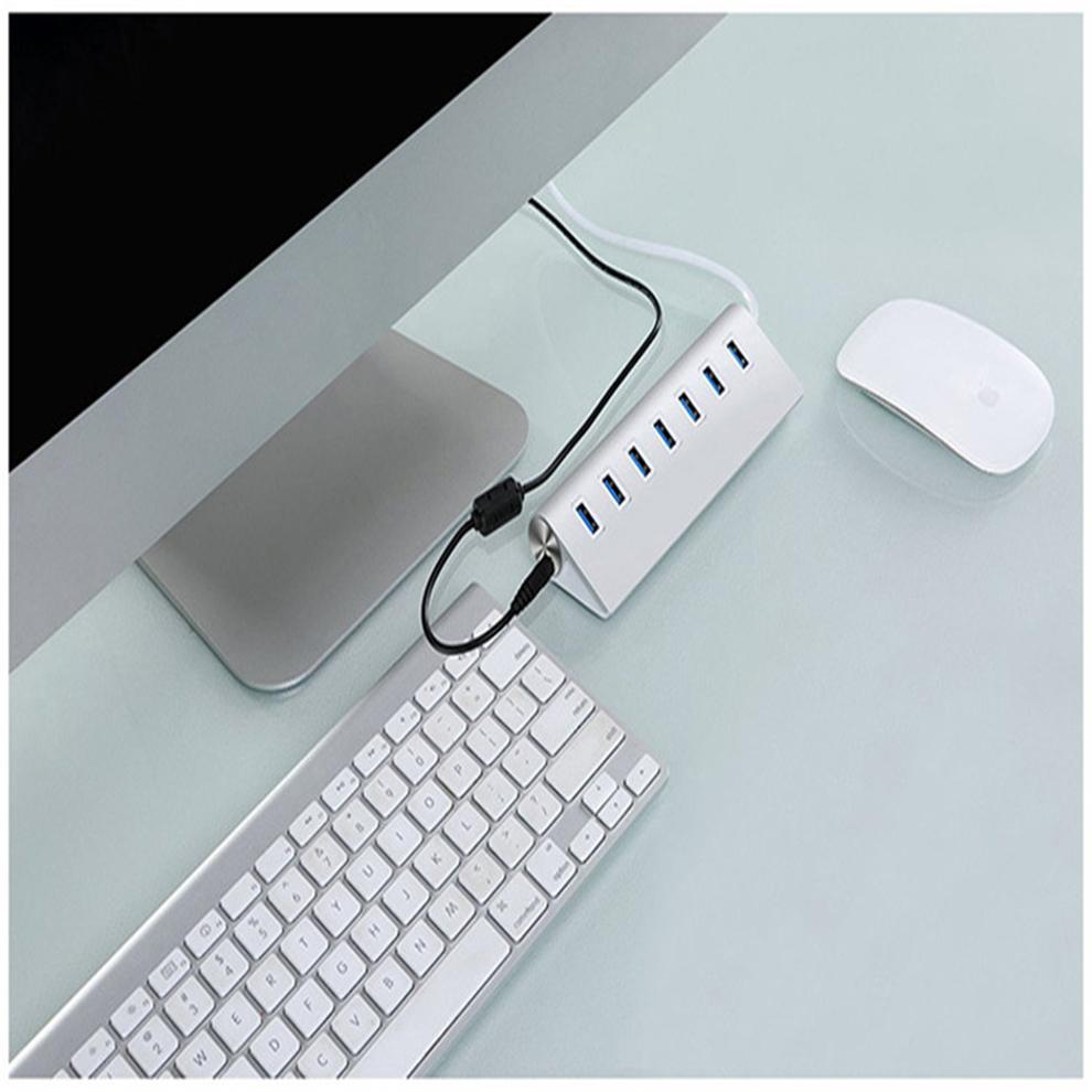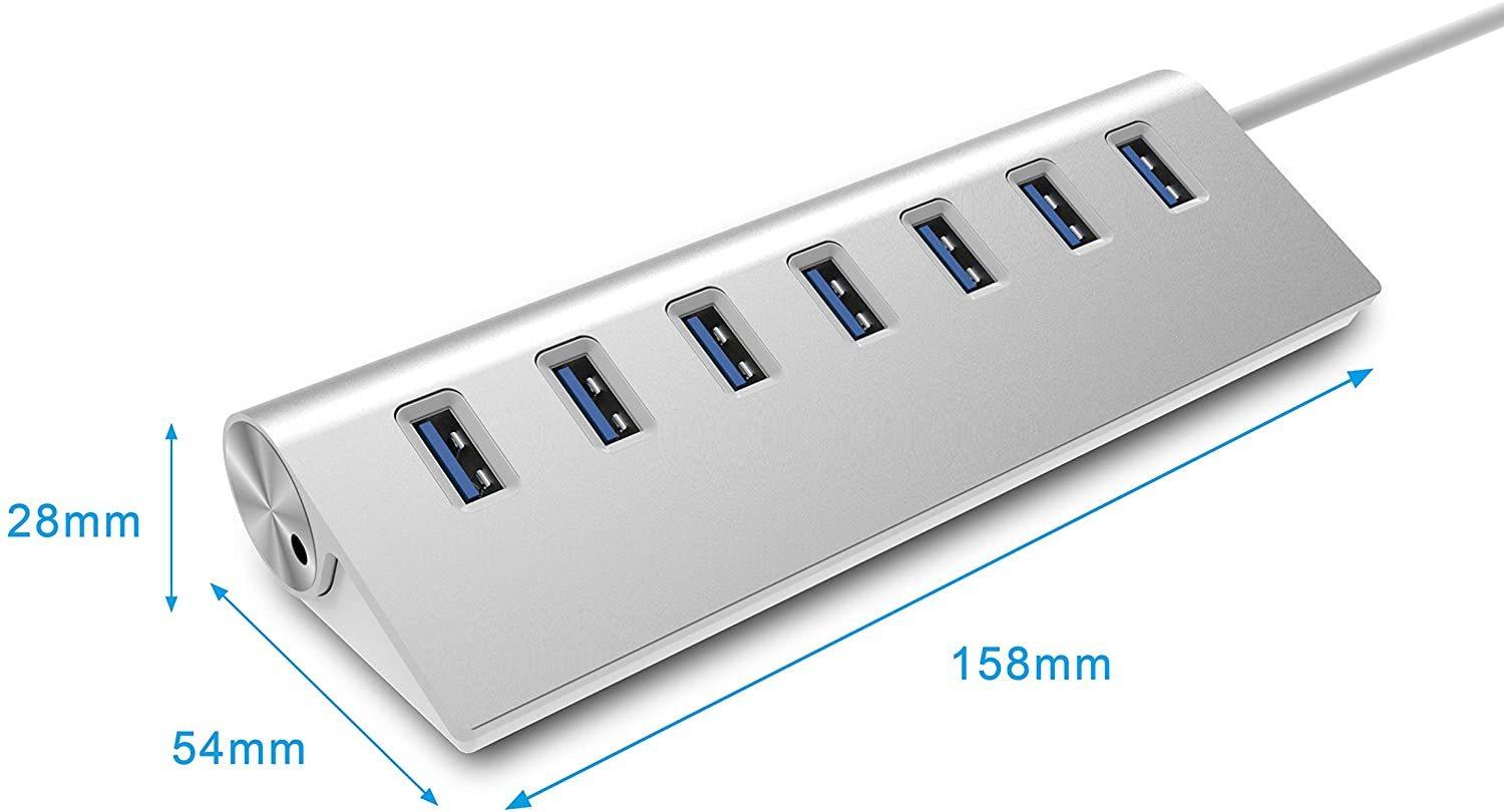 *Aluminum hub*7 USB 3.0 ports, which can easily connect peripheral devices such as mouse, keyboard, flash drive, card reader or external hard drive to PC laptop or Mac*Super high-speed data transmission*USB 3.0 port transfers photos, videos and music at up to 5Gbps, backward compatible with USB2.0 and 1.0Cord length – approx 30cmInput voltage: DC5V 1A. (input on the side)*Please Note:** This USB hub is designed for data transmission, and does not support charging.* For a stable connection, avoid connecting devices that exceed a total of 900mA.* Designed with an additional 3.5mm power jack, if using a higher power device, please connect to 5V2A power adapter (Adapter not included).