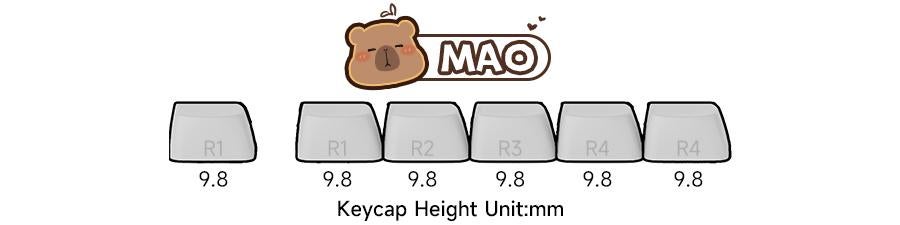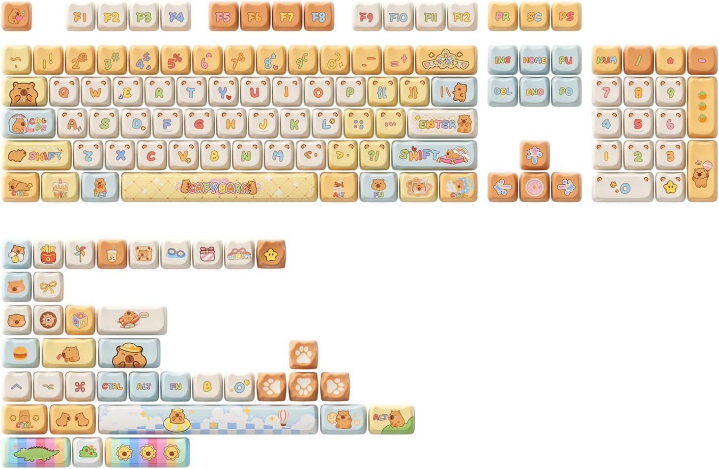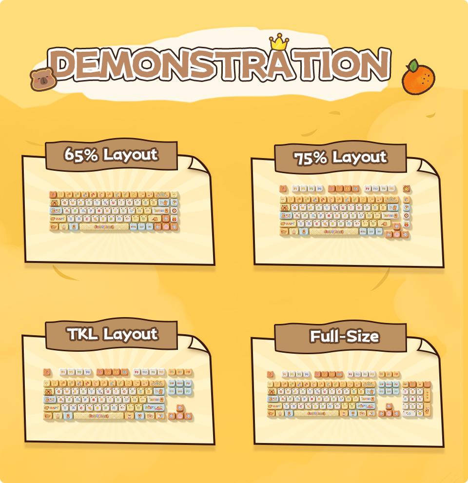 An original design by Akko team, inspired by the spirit and graceful manner of the Capybara, known for its self-soothing and caring nature.* PBT Dye-Sub Keycaps* MAO Profile* Compatible with major-sizes keyboard including but not limited to 60%, 64-key, 65%, TKL, 75%, 96%, 1800 compact, and full-size keyboards.* *PBT Dye-Sub Keycaps:* With advanced 5-sided dye sublimation technology, the keycaps feature vibrant and colorful printing across every surface. Made from durable PBT materials, the legends will not fade easily.* *MAO Profile:* The MAO Profile features a unique cat-ear shaped design with smoother edges and a stronger sense of curvature.