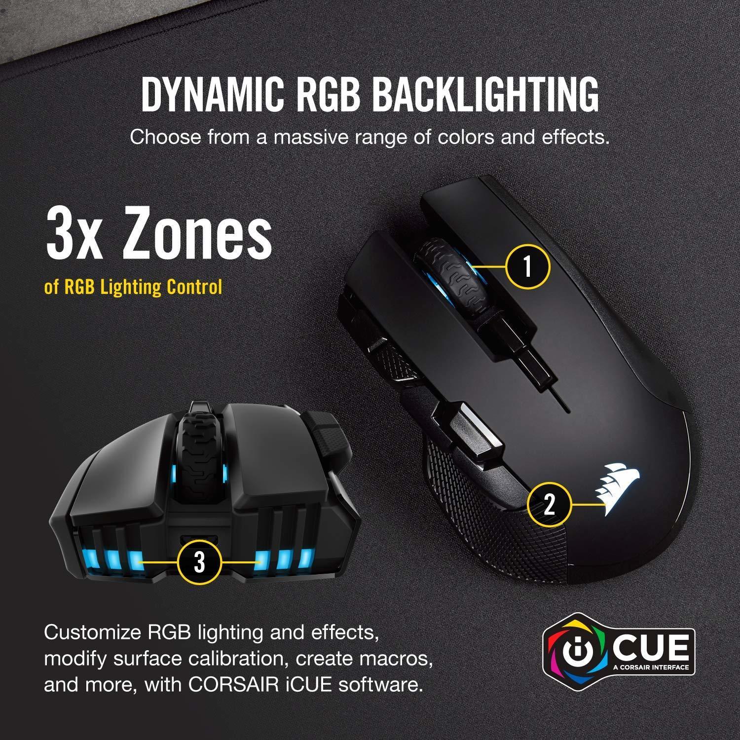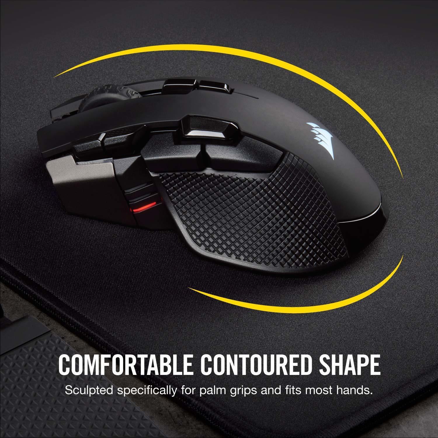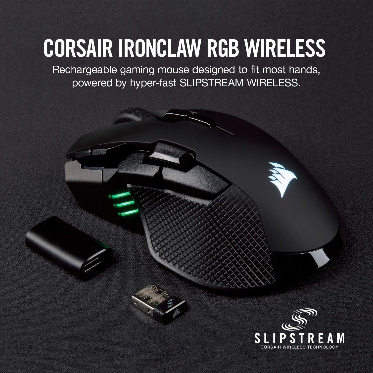 The CORSAIR IRONCLAW RGB WIRELESS Gaming Mouse combines a native 18,000 DPI optical sensor with a comfortable palm grip, connecting to your PC via hyper-fast, sub-1ms SLIPSTREAM CORSAIR WIRELESS TECHNOLOGY, Bluetooth or USB wired connection.*Features:** Three modes of connection: hyper fast, sub 1ms Slipstream Corsair Wireless technology, low latency Bluetooth, or USB wired* Contoured shape that's sculpted specifically for palm grips and larger hands, giving you comfort when it counts* Custom PixArt PMW3391 native 18, 000 DPI optical sensor with 1 DPI resolution steps for ultra accurate tracking and accuracy* Ten fully programmable buttons to customize the way you play, with powerful macros and key Remaps TO give you an in game advantage* Ultra durable Omron switches rated for more than 50 million clicks