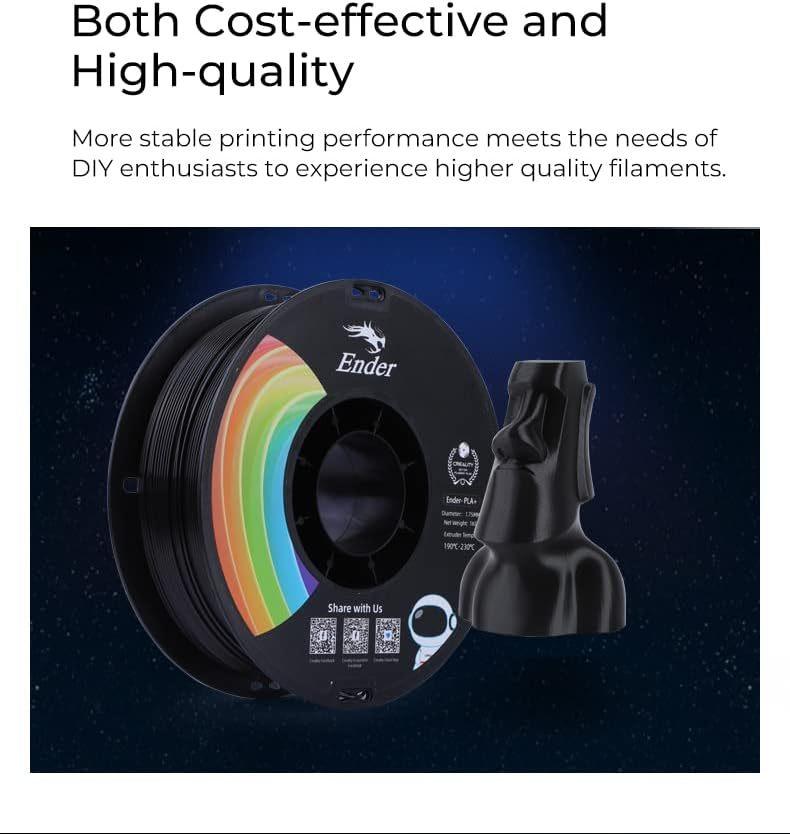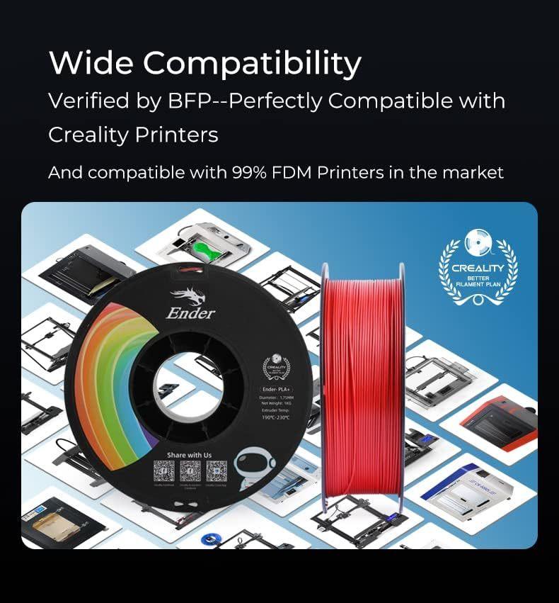 *Creality Ender 1.75mm PLA+ 3D Printing Filament 1kg** Strong Toughness without BreakageCompared with other 1.75 PLA filaments, the Official Creality Ender-PLA+ enhances the toughness of the filament. It can be repeatedly bent with less susceptibility to breakage, and the firm model is firmer and not easy to damage. The 3D filament is suitable for 99% of the needs of DIY enthusiasts.* High-quality and Easy to PrintNo clogging, no bubbling, no knotting, smooth printing! Designed and Manufactured with a Clog-Free patent to guarantee a smooth and stable printing experience. The good fluidity enables the PLA+ filament bundle to be extruded evenly and smoothly during printing. No clogging to the nozzle, and improving the printing success rate.* Accuracy & ConsistencyThe PLA Plus, 1 kg spool (2.2lbs), of 1.75mm diameter, Minimum dimensional tolerance ±0.02mm. It has wide compatibility making it suitable for almost 1.75mm FDM 3D printers due to the small diameter error.* Environmentally Friendly MaterialsMade from environmentally friendly materials, the 3D printer's filament does not have odor, pollution or toxicity during the printing.* Vacuum-sealed with DesiccantPreventing moisture absorption, allowing for high-detail resolution for more printing scenarios, such as educational toys, machine parts, home accessories and functional parts etc.*Highlights** Stronger Toughness without Breakage* High stability brings higher print quality* Neat Winding with Smooth Printing* Flow Printing without Clogging* Unlimited 3D Models and Play with 3D Printing Cloud Communities*Specifications** Filament Type: PLA+* Diameter: 1.75mm±0.02mm* Weight: 1kg/2.2lb* Recommended Nozzle Temperature: 190 °C – 230 °C* Heated Bed Temperature: 0 – 60°C* Benefits: High Toughness | No Clogging | No Bubbling | No Knotting | Smooth Printing* Recommend Print Surface: Carborundum Glass Platform, PEI Platform, Crepe Tape, PVP Glue* Certification: RoHS, REACH, MSDS