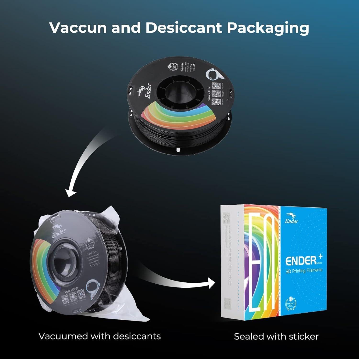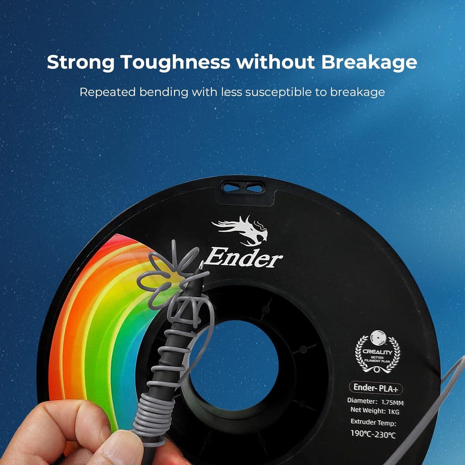 *Creality Ender 1.75mm PLA+ 3D Printing Filament 1kg** Strong Toughness without BreakageCompared with other 1.75 PLA filaments, the Official Creality Ender-PLA+ enhances the toughness of the filament. It can be repeatedly bent with less susceptibility to breakage, and the firm model is firmer and not easy to damage. The 3D filament is suitable for 99% of the needs of DIY enthusiasts.* High-quality and Easy to PrintNo clogging, no bubbling, no knotting, smooth printing! Designed and Manufactured with a Clog-Free patent to guarantee a smooth and stable printing experience. The good fluidity enables the PLA+ filament bundle to be extruded evenly and smoothly during printing. No clogging to the nozzle, and improving the printing success rate.* Accuracy & ConsistencyThe PLA Plus, 1 kg spool (2.2lbs), of 1.75mm diameter, Minimum dimensional tolerance ±0.02mm. It has wide compatibility making it suitable for almost 1.75mm FDM 3D printers due to the small diameter error.* Environmentally Friendly MaterialsMade from environmentally friendly materials, the 3D printer's filament does not have odor, pollution or toxicity during the printing.* Vacuum-sealed with DesiccantPreventing moisture absorption, allowing for high-detail resolution for more printing scenarios, such as educational toys, machine parts, home accessories and functional parts etc.*Highlights** Stronger Toughness without Breakage* High stability brings higher print quality* Neat Winding with Smooth Printing* Flow Printing without Clogging* Unlimited 3D Models and Play with 3D Printing Cloud Communities*Specifications** Filament Type: PLA+* Diameter: 1.75mm±0.02mm* Weight: 1kg/2.2lb* Recommended Nozzle Temperature: 190 °C – 230 °C* Heated Bed Temperature: 0 – 60°C* Benefits: High Toughness | No Clogging | No Bubbling | No Knotting | Smooth Printing* Recommend Print Surface: Carborundum Glass Platform, PEI Platform, Crepe Tape, PVP Glue* Certification: RoHS, REACH, MSDS