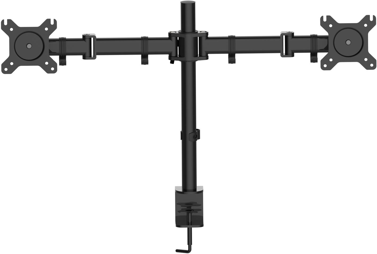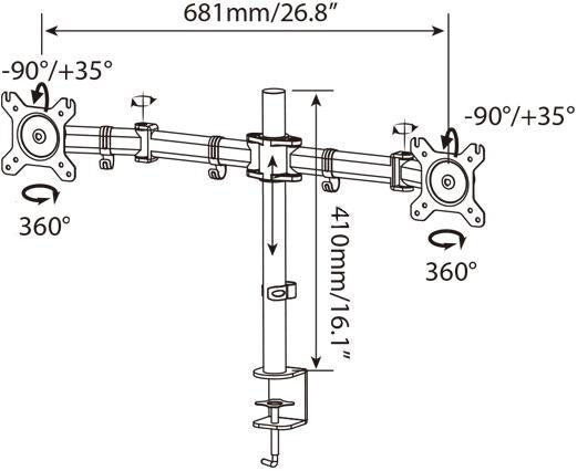 The Gorilla Arms Dual Monitor Mount allows for easy arrangement and adjustment of any workspace. Set your display at the perfect height, and adjust with ease for multiple users.*Features:** Constructed from die cast aluminum* Integrated cable management* Easy assembly and disassembly*Specifications:** *Model* – GA-014N* *Application* – 2 × 15"-27" VESA Monitors* *VESA Compatibility* – 75×75mm/100×100mm* *C-Clamp Width:* 70mm* *Weight Capacity* – 8kg per mount* *Tilt* – –90°~+35°* *Swivel* – 180°* *Rotation* – 360°* *Material* – Aluminum alloyMonitors are for display purposes only & are not included.