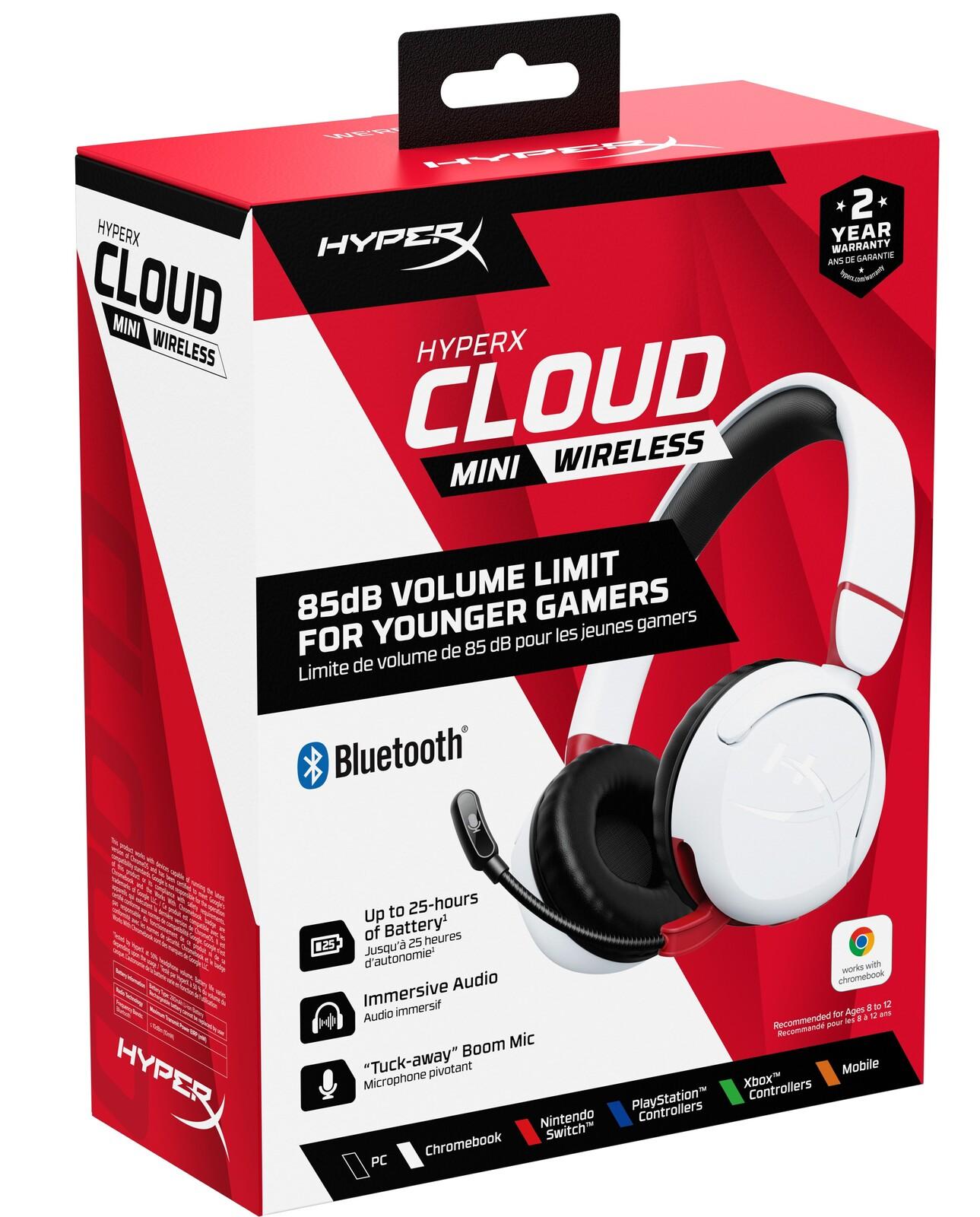 The HyperX Cloud Mini is a comfortable wireless headset built for upcoming gamers. Recommended for ages 8–12, it’s lightweight and appropriately sized for younger gamers, and more importantly, it’s designed to keep audio levels below 85dB\*. With up to 25 hours of battery life, it’s perfect for flights, or gaming sessions\*\*. Easy pairing over Bluetooth provides wireless freedom that means you won’t have to worry about cable snags and clutter. It features a clear, flip-to-mute mic so younger gamers can chat with their friends online, and it can be tucked away when not in use\*\*\*. The earcups can be rotated when it’s time to take a break, and they’re also great for easy transport or storage. Cloud Mini Wireless can easily connect to Bluetooth compatible devices, as well as any device with a 3.5mm connection\*\*\*\*. Whether your young gamer is playing on mobile, Nintendo Switch, PlayStation, PC, Chromebook, Steam Deck or elsewhere, this versatile headset will be ready for it\*\*\*\*\*Not designed or intended for use as a toy.\*\*Tested at 50% volume. Battery life varies based on volume and usage.\*\*\* Recommended for ages 8–12\*\*\*\*Detachable 3.5mm Headphone Cable included.\*\*\*\*\*Requires 3.5mm headset jack with standard CTIA connection or compatible 3.5mm adapter.Features:* Volume level below 85dB* Immersive audio* All-Day battery life* Durable tuck-away boom microphone* Lightweight wireless comfort* Adjustable, rotating earcups* Multiplatform compatible via Bluetooth and 3.5mm* Fast Pair and Works With Chromebook certifiedSpecifications:Headphone:* Driver: Custom dynamic, 30mm with neodymium magnet* Form Factor: On-ear/supra-aural, closed back* Frequency Response: 20Hz-20kHz* Impedance: 94 Ω* Sensitivity: 83dBA at 1kHz* T.H.D: <2%* Frame Type: Plastic* Ear Cushions: Memory foam and premium leatheretteMicrophone:* Element: Electret condenser microphone* Polar Pattern: Omnidirectiona* Frequency Response: 100Hz-10kHz* Sensitivity: –40.5dBV (0dB=1V/Pa at 1kHz)Connections and Features:* Audio Connection: Bluetooth, Wired 3.5mm (4-pole CTIA* Audio Controls: Bluetooth multifunction button, sidetone on/off, microphone mute* Sampling Rates: 48kHz* Bit-Depth: 16 bitBattery Specifications:* Type: Rechargeable lithium-polymer* Battery Life: 25 hours* Charge Time: 2 hoursWireless Specifications:* Type: Bluetooth* Bluetooth Version: 5.3* Wireless Range: Up to 20 metres* Supported Bluetooth Codecs: AAC, SBC* Supported Bluetooth Profiles: AVRCP, A2DP, HFP, HSP* PlayStation does not support Bluetooth audio connectionsPhysical:* Weight: 132g* Cable Length(s) and Type(s): 1.2m detachable headset cable, 0.5 USB-C to USB-A charging cableView our Headphones Return Policy [Here](https://help.mightyape.co.nz/hc/en-nz/articles/115012111088-Returns-Policy)