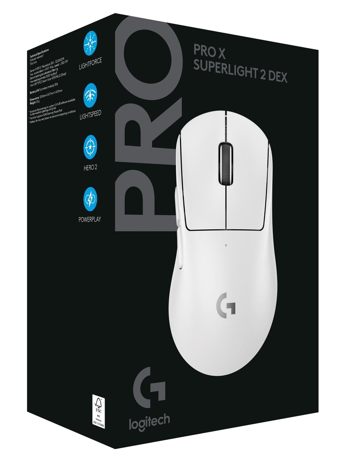 Logitech G partnered with top esports athletes to craft an ergonomically asymmetrical mouse that enhances comfort for the right hand, optimizing control with its perfect balance of shape, weight, and feel. Equipped with the advanced HERO 2 sensor, robust LIGHTSPEED wireless and LIGHTFORCE switches, PRO X SUPERLIGHT 2 DEX continues the SUPERLIGHT family legacy, celebrated for 60 g weight and unrivaled performance.Dexterity encompasses a number of physical attributes including hand-eye coordination, agility, reflexes, fine motor skills, balance and speed of movement; a high dexterity score indicates superiority in all these attributes. Dexterity affects characters with regard to initiative in combat, ranged attack rolls, armor class, saving throws, and other physical skills.Features:* Designed With Pros. Engineered To Win: Designed alongside the world’s best esports athletes, PRO X SUPERLIGHT 2 DEX wireless gaming mouse enables you to perform at your peak and unlock your potential* Engineered Comfort For Your Right Hand: The asymmetrical design and programmable side thumb buttons offer total comfort for different playing styles, enhancing dexterity and precision* Pro-Precision: The most advanced sensor in gaming. The HERO 2 has sub micron tracking at up to 32k DPI across full range of motion, and up to 888 IPS/ 88G acceleration\** Pro Connectivity: Undisturbed gaming, wherever you play. Our LIGHTSPEED wireless operates at up to 8 kHz polling for a responsive and reliable tournament-grade experience\** Play longer: Get up to 95 hours of battery life on a single charge using the included USB A to C cable, or experience nonstop play with Powerplay\*\** Pro Agility & Speed: Weighing only 60 g with bottom cover removed, move with greater precision and speed in FPS games where quick reactions and precise aiming are crucial for the winTechnical Specs:* Onboard memory* 5 buttons* Sensor: HERO 2* Resolution: 100 – 32,000 DPI* Max. acceleration: > 40G2* Max. speed: > 500 IPS2* Zero smoothing/acceleration/filtering* Max wired report rate: 1000 Hz (1ms)1* Max LIGHTSPEED report rate: 4000 Hz (0.25ms)1* Battery Life3: (constant motion): 95 h* Dimensions: 125.8mm X 67.7mm X 43.9mm* Weight: 60 gIn the box:* PRO X SUPERLIGHT 2 DEX Wireless Gaming Mouse* USB LIGHTSPEED wireless adapter* USB A to C Charging/data cable* Receiver extension adapter* Optional grip tape* Cleaning cloth* User documentation(1) Advanced features require Logitech G HUB Software available for download at logitechg.com/ghub(2) Tested on Logitech G240 Gaming Mouse Pad(3) Battery life may vary based on user and computing conditions*System Requirements*PC with Windows 10 or later and USB 2.0 port(Optional) Internet access for Logitech G HUB software