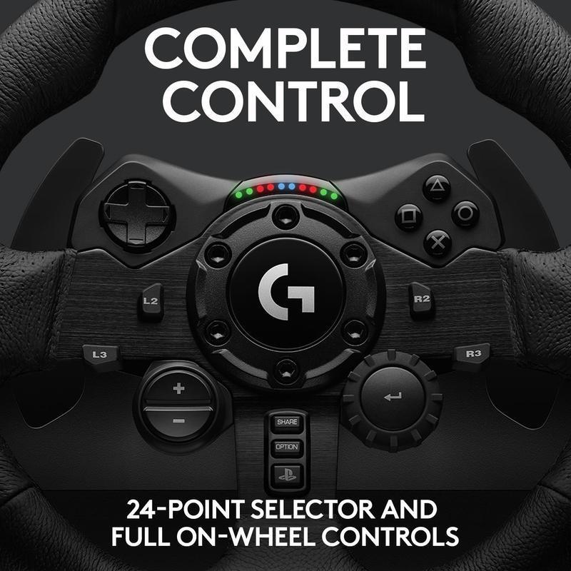Meet the next generation of racing wheels. The award-winning Logitech G design is reengineered to dial into your game physics, delivering unprecedented realism. Feel the pistons pumping, the gravel crunching, and every shift, drift, and hairpin turn like never before.*CLOSED-LOOP MOTOR CONTROL*The right current means the right torque. G923’s advanced firmware monitors all the current flowing through the wheel motors, continuously adjusting voltage to match outputs from game physics. By going beyond default settings, G923 delivers pinpoint accuracy and unprecedented realism.*MORE TRACTION. LESS SMOKE.*Get off the starting line cleaner and faster with a programmable dual clutch launch assist in supported games.*CRAFTED FOR RACING*The classic design—modernized. The new colorway, premium brushed metal, automotive-style leather stitching, and polished pedals give G923 a professional finish. Form follows function with an integrated center marker and rotary dial.*ON-WHEEL GAME CONTROLS*Complete PS5 or PS4 controls are built right into the steering wheel. No matter how you race, every command is directly at hand.*24-POINT SELECTION DIAL*Traction, torque, brake force—it’s all adjustable from an integrated dial that you control.*PROGRESSIVE BRAKE PEDAL*More responsive, more accurate. The progressive spring mimics the performance of a pressure-sensitive brake system for a real racing experience. Reposition the pedal faces for heel-toe maneuvers and even more control.*BUILT-IN REV INDICATOR*Built-in colored LEDs show your RPM range in supported games. See when you’re redline-ing—right in your line of sight.*CUSTOMIZE WITH G HUB*Take full control of your rig. Adjust wheel sensitivity, force feedback levels, and button customization via powerful G HUB Gaming Software for PC. Download at logitechG.com/downloads Custom-build multiple profiles for any game and application.Specifications:WHEEL TECHNICAL SPECIFICATIONS* Rotation: 900 degrees lock-to-lock* Hall-effect steering sensor* Dual-Motor Force Feedback with TRUEFORCE* Overheat safeguardPEDAL TECHNICAL SPECIFICATIONS* Nonlinear brake pedal* Patented carpet grip system* Textured heel grip* Self-calibratingMATERIALS* Wheel spokes: Anodized aluminum* Wheel cover Hand-stitched leather* Steering shaft: Steel* Shifter paddles: Brushed stainless steel* Mounting clamps: Glass-filled nylon* Pedal frames and arms: cold rolled steel* Pedal faces: Brushed stainless steel* Pedal piston sleeves: Polyoxymethylene thermoplastic (POM)PACKAGE CONTENTS* Steering wheel* Pedals* Power supply* User documentationWHEEL PHYSICAL SPECIFICATIONS* Height: 270 mm* Width: 260 mm* Depth: 278 mm* Weight without cables: 2.25 kgPEDALS PHYSICAL SPECIFICATIONS* Height: 167 mm* Width: 428.5 mm* Depth: 311 mm* Weight without cables: 3.1 kgWARRANTY INFORMATION* 2-Year Limited Hardware WarrantyREQUIREMENTS (PLAYSTATION 4)PlayStation 5 or PlayStation 4 systemGame that supports LogitechREQUIREMENTS (PC)* Windows® 10, 8, 8.1 & 7* 150 MB of available hard disk space* USB 2.0 port* Game that supports Logitech*Compatible with most [Racing Cockpits & Wheel Stands](/games/gaming-furniture/racing-flight-cockpits "1")*[](/games/gaming-furniture/racing-flight-cockpits "1")