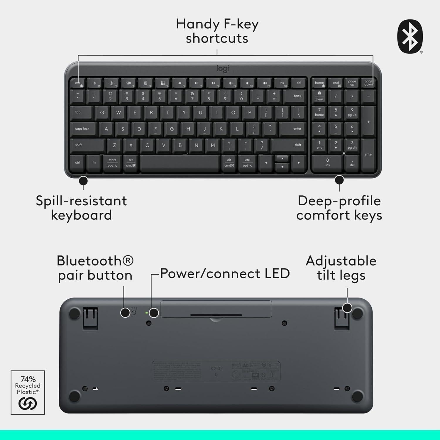 Connect easy with MK250, a combo that’s simple, full-featured, wireless, and made to last with plastic parts using a minimum of 64% recycled materials.* *Connect easy:* Meet Logitech MK250 Bluetooth® combo. Easy to connect and easy to set up with a compact and comfortable design, so you can focus on the task at hand.* *Connect in seconds:* Experience frustration-free connectivity with Bluetooth® wireless technology. Simply pair in seconds. You don’t need any dongles so you can free up USB ports for other devices.* *Durable, reliable performance:* Spill-resistant, robust, and with a 12-month battery life, MK250 is designed to withstand consistent daily use. That means more focus and peace of mind for you. Made by Logitech, a brand known for quality since 1981.* *Compact yet complete:* A combo with a small mobile mouse and space-saving keyboard that still includes a numpad and all essential keys. Ideal for tight spaces, MK250 offers efficiency without sacrificing performance or convenience.* *Optimal comfort:* Enjoy a contoured, ambidextrous mouse and responsive, deep-profile keyboard keys. The MK250 provides a familiar and consistent feel, great for accuracy so you stay focused.* *Made to last with recycled plastic:* MK250 is built from plastic parts using a minimum of 66% (mouse) and 64% (keyboard) recycled plastic in addition to uncompromising quality. At Logitech, we design for sustainability and durability.*Technical Specifications** *Dimensions:* * *Keyboard:* * *Height:* 136.9 mm * *Width:* 369.9 mm * *Depth:* 22.8 mm * *Weight:* 380 g * *Mouse:* * *Height:* 100 mm * *Width:* 60 mm * *Depth:* 38 mm * *Weight:* 76 g* *Mouse:* * *Sensor technology:* Smooth optical tracking (1,000 DPI) * *Buttons:* On/Off power buttons * *Scrolling:* Line-by-line scrolling * *Scroll wheel:* 2D, mechanical * *Connect/Power:* Long press On/Off power buttons for pairing * *Battery type:* Alkaline battery * *Battery life:* 12 months * *Wireless technology:* Bluetooth® Low Energy Technology * *Wireless operating distance:* 10 m * *Number of Batteries:* 1xAA (included) * *Indicator lights:* Connectivity LED * *Number of buttons:* 3 (Left/Right-click, Scroll-wheel with middle click)* *Keyboard:* * *Keyboard Connection Type:* Long press On/Off power buttons for pairing * *Keyboard Wireless Technology:* Bluetooth® Low Energy Technology * *Wireless range:* 10 m * *Keyboard battery type:* Alkaline battery * *Indicator Lights (LED):* Connectivity LED * *Special Keys:* On/Off power buttons * *Number of Batteries:* 2xAAA (included) * *Battery life:* 12 months * *Additional Features:* Tilt legs (for 7 degree typing angle) * *Layout:* Compact layout with number pad * *Multi OS printed layout:* Yes* *System Requirements:* * *Requirements:* Bluetooth® Low Energy wireless technology * *Compatibility:* Windows 10, 11 or later; macOS 12 or later; ChromeOS* *Warranty Information:* 1-Year Limited Hardware Warranty* *Part Number:* * *Graphite English MK250:* 920–013559 * *Off-white English MK250:* 920–013560 * *Rose English MK250:* 920–013561* *What's in the box:* * 1× keyboard with 2× AAA batteries (pre-installed) * 1× mouse with 1× AA battery (pre-installed) * 1× User documentation * 1× QSG printed on packaging