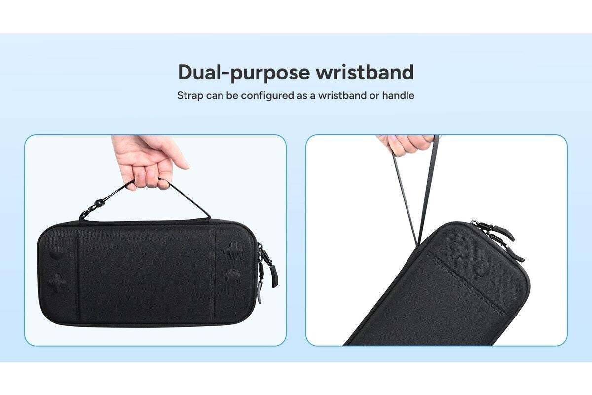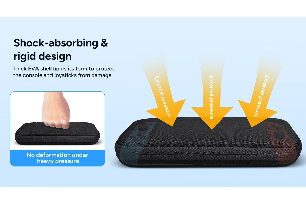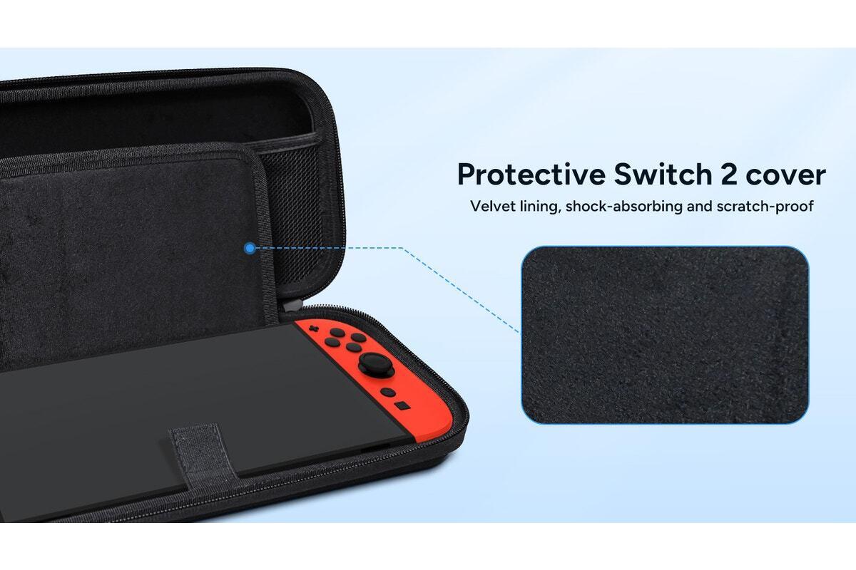 Protect your Nintendo Switch 2 with this durable waterproof carry case. Designed for gamers on the go, it features a sturdy EVA shell, soft velvet lining and ample storage for your game cards and accessories.* Waterproof EVA shell. Shields your Switch 2 from impact and the elements.* Ultra-soft velvet lining. Prevents scratches and adds a premium feel.* 10 game card slots. Stores and protects your favourite games.* Mesh accessories pocket. Keeps essential accessories organised.* Double outside zippers. Ensures secure closure and easy access.* Rubber carry handle. Offers a comfortable grip for portability.Durable waterproof protectionConstructed from a sturdy EVA shell, this carry case is designed to withstand the rigours of travel. Its waterproof material keeps your Nintendo Switch 2 and accessories safe from moisture, while its shock-resistant build protects against accidental drops and impacts.Organised and scratch-free storageThe ultra-soft black velvet lining ensures your console and accessories remain scratch-free, while the built-in 10 game card slots let you store your favourite games securely. The added mesh pocket provides extra space for cables, earbuds or other small essentials.Convenient and travel-friendlyDesigned with ease of use in mind, this case features double outside zippers for quick access while preventing accidental openings. The rubber carry handle provides a firm grip, making it easy to take your Switch 2 wherever you go.