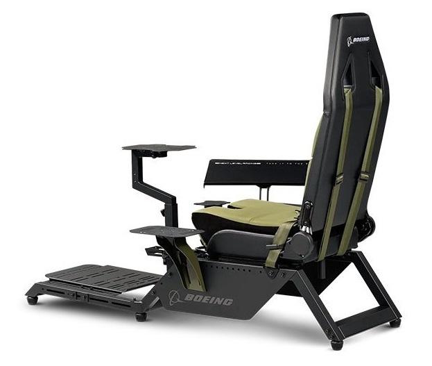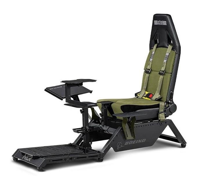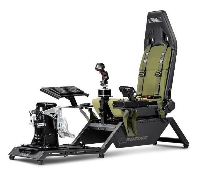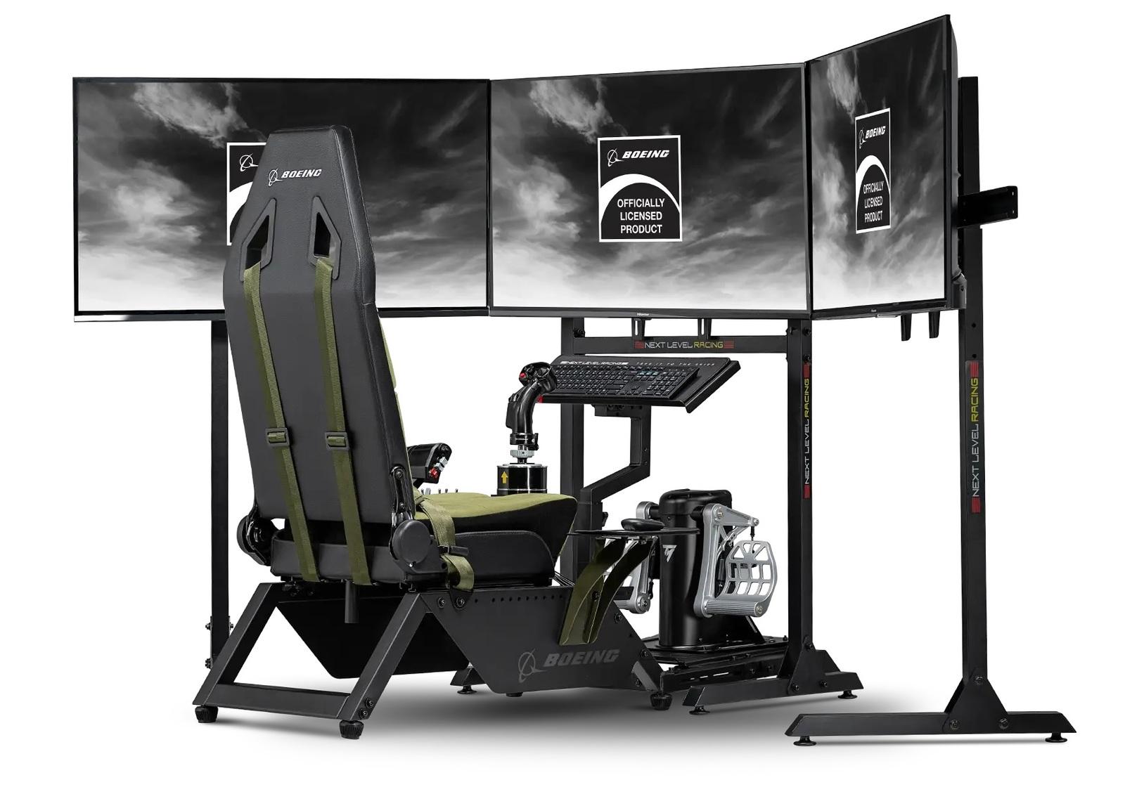 Takes it to the skies with the Next Level Racing Flight Simulator Boeing Military Edition, our first flight dedicated cockpit designed specifically for the aviation community in collaboration with The Boeing Company. Branded in Boeing components like the military inspired green canvas seat covering and Military Green highlights, the Boeing community can now interact with a flight a cockpit that is inspired by a military Boeing flight cockpit. The Next Level Racing® Flight Boeing Military Edition Cockpit offers a wide range of configurations to suit different class of flight, including Combat, Space, Commercial, and General Aviation. The Flight Simulator Boeing Military Edition Cockpit is compatible with a wide range of electronics such as yokes, joysticks, and throttles for all major brands.*DESIGNED SPECIFICALLY FOR FLIGHT*The Next Level Racing Flight Simulator Boeing Military Edition cockpit has been specifically designed and developed with flight users in mind. The Flight Simulator is the first flight cockpit that allows different flight configurations all in one station. With different components included with the Flight Simulator, the flight user can create a commercial flight configuration by attaching a wide range of yokes, rudders, and throttles directly to the cockpit. A military configuration is possible with a unique cut-out design of the seat to attach the Hotas center stick directly to the middle plate, providing a true-to-life combat experience.*WIDE RANGE OF ADJUSTMENTS*Built to suit different users, the Flight Simulator Boeing Military Edition boast a wide range of adjustments. In different categories of flight, the Flight Simulator cockpit provides adjustability in different components like the side arms with lateral adjustment of 300mm, and height adjustment of 75mm to get the perfect flight ergonomics for the user. The Centre Pole of the flight simulator offers a 150mm height adjustment for the position of the Yoke or the keyboard tray accessory. For Military and helicopter users, the Hotas center pole allows a 30mm range of height adjustment to ensure the right positioning for different size users.*COMPLETE THE BOEING EXPERIENCE*The Next Level Racing Flight Simulator Boeing Military Edition enables the Boeing community to interact with a brand they love and engage with the growing community of flight simulation. The seat is covered with a military inspired green canvas fabric to resemble a Boeing military flight cockpit and provide a comfortable flight experience during combat. For a visual brand experience, the Boeing logo is embroidered on the back of the flight seat, laser etched on the side panels, and military green highlights have been added.Features:* Dedicated flight cockpit for maximum simulation immersion* Official licensed product of The Boeing Company* Inspired Boeing inspired components like green canvas seat covering and military green highlights* Suited for Combat flight, General Aviation, Commercial flight, and Space Exploration users* Compatible with flight electronics such as yokes, joysticks, rudders, and throttles for all major brands* Wide range of adjustments to tailor your flight experience* Includes keyboard and mouse support for easy navigation with custom Next Level Racing keyboard and mouse pads* Compatible with Thrustmaster / Logitech / Saitek / Honeycomb/ Virtual Fly/ Crosswind and other flight accessory brands* Includes Buttkicker Adaptor, Next Level Racing Four-point harness, and Lumber SupportMotion Compatible with added accessories\*\*\*\*To make the Next Level Racing Flight Simulator Cockpit range motion compatible, users will require the Next Level Racing Motion Plus Platform Adaptor.*WHAT'S IN THE BOX** Next Level Racing Flight Simulator Boeing Military Edition Frame* Next Level Racing dedicated Boeing inspired Flight Seat* Four Point Next Level Racing Harness* Next Level Racing Custom Feet* Buttkicker Adaptor Mount* Seat Sliders* Custom Next Level Racing Keyboard and Mouse Pads* Next Level Racing Lumbar Cushion* Hardware for assembly with extra hardware for hard mounting peripherals* Digital assembly instructions and assembly videos available here: [http://bit.ly/…instructions](http://bit.ly/nlr-instructions)*SPECIFICATIONS** Supported Height – 120 –210 cm or 4ft – 6ft 9 inches* Supported Max Weight – 150 kg or 330 lbs* Product Dimensions – (L) 153 cm x (W) 99 cm or (H) 122cm /(L) 60.2 inches x W 39 inches x H 48 inches)* Product Weight – 49.5kg or 109.1 lbs* Box Dimensions: 100 cm (L) X 54cm (W) X 48cm (H)/ 39.4 inches(L) x 21.3 inches (W) x 18.9 inches(H)* Boxed Weight – 56.3 kg or 124.1 lbs* Part Number – NLR-S028*COMPATIBLE NLR PRODUCTS** Next Level Racing Free Standing Single Monitor Stand* Next Level Racing Free Standing Triple Monitor Stand* Next Level Racing Free Standing Keyboard and Mouse Stand* Next Level Racing Elite Free Standing Monitor Stand* Next Level Racing Elite Quad Monitor Stand* Next Level Racing Lockable Castor Wheels* Next Level Racing Floor Mat* Next Level Racing Motion Plus Adaptor (This allows the flight cockpit to be compatible with Next Level Racing Motion Plus Platform and Traction Plus PlatformPlease note: Wheel and pedal and other accessories are not included