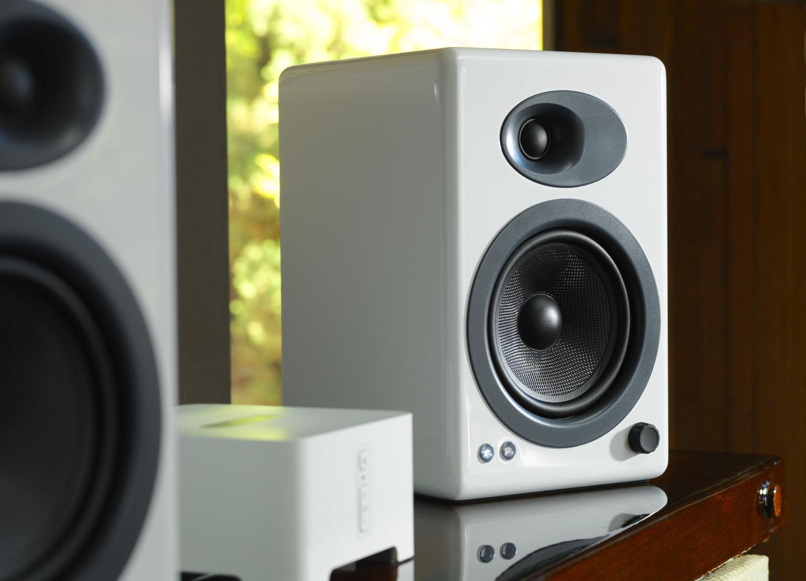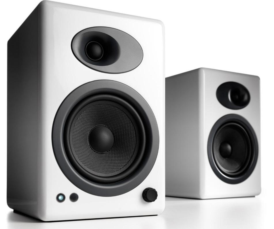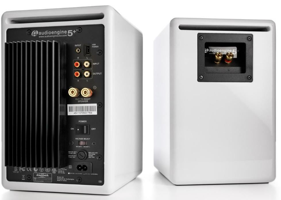 *Hear the Difference*The A5+ Powered Speakers are bookshelf speakers with sound that can fill any room. No network setup, passwords to enter, or buttons to push.You won’t hear any enhanced super-mega-hyper-monster boomy bass from these powered speakers. The low end from the A5+ Powered Speakers is real bass, very near to the originally-recorded music. From rap to classical to movies, you’ll get tight, punchy bass with an awesome growl that will make you smile – regardless of the volume level.Even if you’re not an audio enthusiast we guarantee your music will sound better!The A5+ Powered Speakers are bookshelf speakers that pack a big sound, filling any room. No network setup, passwords to enter, or buttons to push. Setting them up is so easy you’ll be rocking in no time.Clear, full and powerful audio that fills any room. The A5+ Powered Speakers are constructed with custom Audioengine components: aramid fiber woofers, silk tweeters, and built-in power amps wrapped in precision-tuned and hand-crafted cabinets.*Features:** 2-Speaker Stereo* Dual Analog Audio Inputs* Remote Control* Silk Tweeters & Aramid Fiber Woofers* Subwoofer Output * Desktop or stands * 5” woofers * Analog inputs * Connect a subwoofer * Wireless options * Remote control*Specifics:** *Type* – Powered speaker system* *Amplifier Type* – Class AB* *Power Output* –150 W peak power total (50 W RMS / 75 W peak per channel), AES* *Drivers* – 5″ aramid fiber woofers, 0.75″ silk dome tweeters* *Input* – 3.5 mm stereo mini-jack, RCA L/R* *Outputs* – RCA variable line-out, USB (power/charge)* *Input Voltages* – 115/240 V, 50/60 Hz manually switchable* *SNR* – >95 dB (typical A-weighted)* *THD+N* – <0.05% at all power settings* *Crosstalk* – <50 dB* *Frequency Response* – 50 Hz-22 kHz ±1.5 dB* *Input Impedence* – 10K ohms unbalanced* *Idle* – 10 W* *Mute* – 6 W* *Sleep* – 4 W* *Connector Type* – Standard USB* *USB Device Class* – USB 1.1 or above* *Left (active)* – 10.75″ (27 cm) x 7″ (18 cm) x 9″ (23 cm)* *Right (passive)* – 10.75″ (27 cm) x 7″ (18 cm) x 7.75″ (20 cm)* *Left (active)* – 15.4 lb (7 kg)* *Right (passive)* - 9.6 lb (4.4 kg)* *Operating temperature* – 32 degrees F to 95 degrees F* *Non-operating temperature* – –4 degrees F to 113 degrees F* *Relative humidity* – 5 – 95% non-condensing