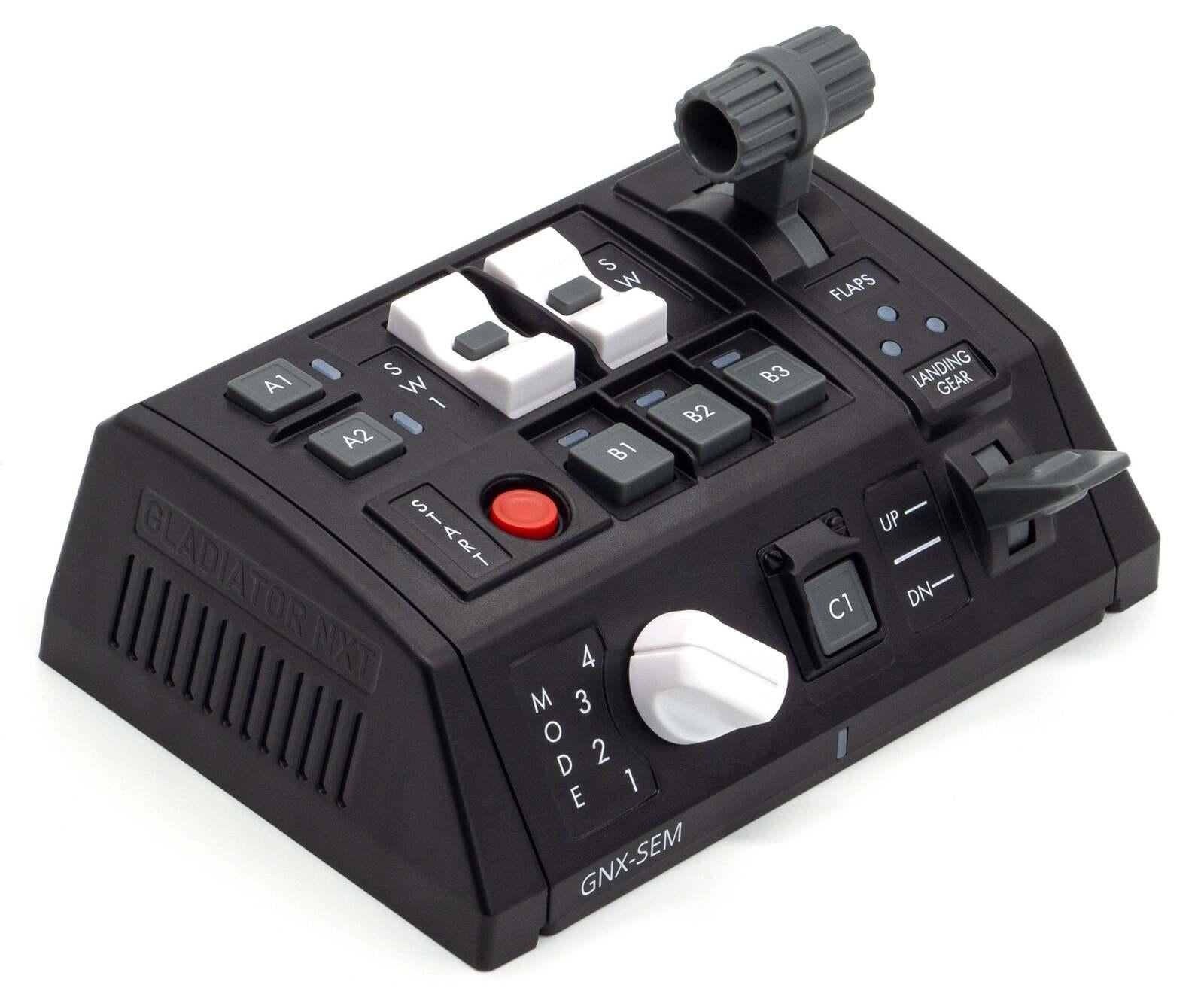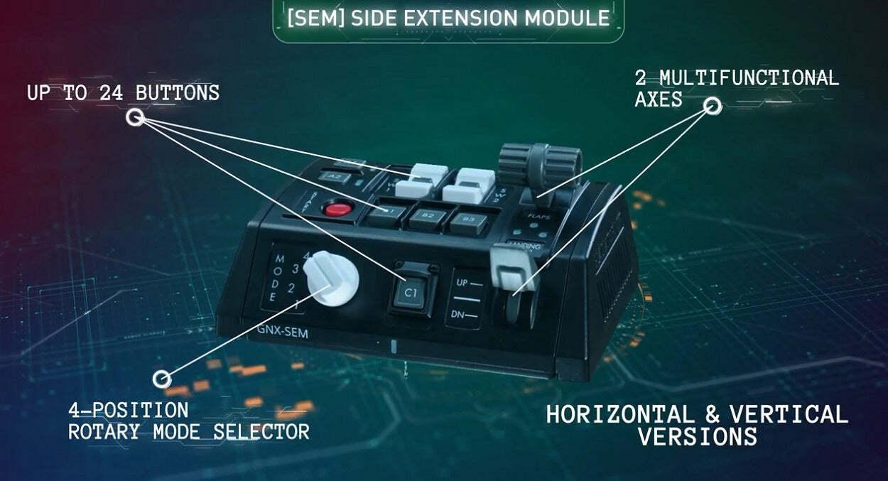 *GNX Side Extension Module (GNX-SEM)*The GNX Side Extension Module adds a new level of realism to the passionate flight and space pilot. While the GNX-SEM was designed with General Aviation pilots in mind, the module is highly configurable to suit any flight and space sim cockpit.*The SEM can be attached side-by-side to:** Gladiator NXT EVO Standard or Premium controller base (from either side)* SEM modules (max number of SEM modules in system – 4x)* THQ modules (max number of THQ modules in system – 4x)* Gladiator EVO Omni Throttle, but only on the opposite side of the throttle’s ‘elbow’. For example, a left-hand throttle only allows attachment on the right hand side. To overcome this limitation a USB Controller can be used which then allows the SEM to be connected to the PC and therefore placed independently of the controller* Up to 4 SEM modules can be accommodated in your cockpit.*Features** 1 Rotary switch* 2 Multi-function axis* 2 K-switches w/ central push button* 7 Push buttons* 8 Programmable, dual colour LEDs* Provides either a total of 24 logical buttons, or 17 logical buttons and 2 analogue axis (based on configuration)*Includes:** SEM* Plastic coupler* Type-C connector guard* Rubber pads & Plastic spacers* Interchangeable heads & detents* Internal “module-to-module” & “module-to-joystick” cable* Phillips & HEX Screw driver* Stickers with protective film*Connectivity:** GNX BUS Connection (included)* USB Connection – requires GNX USB Controller (HID-Main)_Important: Depending on your configuration of controller/s and GNX modules, you may require a GNX USB Controller_*Compatible with:** Gladiator NXT Standard or Premium* UCM Stronghold* GNX USB Controller (HID-Main)* Recommended GNX MFH (Multi Functional Holder) in order to mount module
