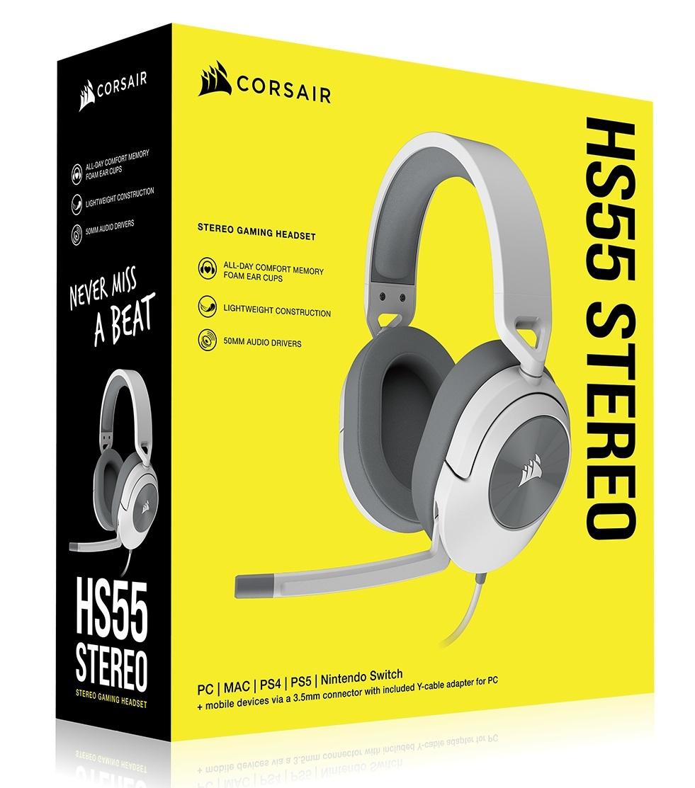 The CORSAIR HS55 STEREO Gaming Headset delivers essential all-day comfort and sound quality with memory foam leatherette ear pads, lightweight construction, and custom-tuned 50mm neodymium audio drivers.*READY TO GAME*HS55 STEREO is lightweight yet durable to comfortably wear for hours of gaming.*COMFORT*Comfortable soft memory foam and leatherette earcups.*LIGHTWEIGHT*Weighing in at just over half a pound (273g) with adjustable headband and ear cups.*INTUITIVE CONTROL*On-ear volume roller and flip-to-mute mic put control within easy reach.*IMMERSIVE AUDIO*High-quality, custom-tuned 50mm neodymium audio drivers deliver excellent sound with the range needed to hear everything on the battlefield.*CRYSTAL-CLEAR COMMUNICATION*Captures your voice with terrific clarity thanks to an omni-directional microphone with a flip-to-mute function, Discord Certified for crystal-clear communication and outstanding sound.*CONNECT TO VIRTUALLY ANY DEVICE*Easily connect to PC, console, or mobile devices with a 3.5mm audio jack.Tech Specs:Audio CUE Software – NoSurround Sound – NoDetachable Microphone – NoRechargble Battery – NoWeight – 0.284Headset Frequency Response – 20Hz – 20 kHzHeadset Battery Life – N/AHeadphone Sensitivity – 114dB (+/-3dB)Headset Wireless Range – N/AImpedance – 32k Ohms @ 1 kHzHeadset Type – WiredHeadset Drivers – 50mmCable Length – 1.8mColor – WhiteAudio – StereoLighting – NonePlatform – PC, Mac, PlayStation 4/5, Xbox One / Series X S, Nintendo Switch, Mobile devicesMicrophone Impedance – 2.2k OhmsMicrophone Type – Omni-directionalMicrophone Frequency Response – 100Hz to 10kHzMicrophone Sensitivity – –41dB (+/-3dB)View our Headphones Return Policy [Here](https://help.mightyape.co.nz/hc/en-nz/articles/115012111088-Returns-Policy)