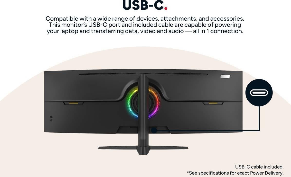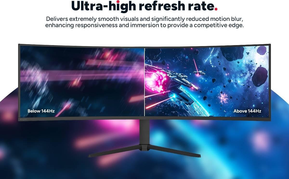 *Immerse yourself in the game with the Kogan™ Infinity 49” Curved Ultrawide DFHD 144Hz FreeSync USB-C Monitor, delivering seamless visuals, smooth refresh rates and versatile connectivity for a more productive and captivating experience.** 49” DFHD display. Ultrawide 3840 × 1080 dual-Full HD resolution for easy multitasking.* 1500R curved screen. Immersive view that matches your natural field of vision.* 144Hz refresh rate. Smooth motion for fast-paced games and media.* 8ms response time. Sharp performance with minimal blur or ghosting.* VA panel. Rich contrast and deep blacks for cinematic depth.* FreeSync technology. Eliminates screen tearing and stutter.* 350 nits brightness. Clear visuals with 85% NTSC colour coverage.* Versatile ports. USB-C, HDMI, DP, USB-A and audio for easy setup.* Fully adjustable stand. Height, tilt and swivel for all-day comfort.*Ultrawide dual-Full HD clarity*Enjoy an expansive 49” DFHD 3840 × 1080 resolution that gives you the real estate of two Full HD monitors in one uninterrupted screen. Whether you’re editing side-by-side documents, trading with multiple charts or running split-screen apps, you’ll get more done with fewer distractions.*Immersive 1500R curve*The 1500R curvature wraps around your natural field of vision, reducing eye movement and drawing you deeper into your content. It’s not just about looking better, but feeling better too, making long sessions more comfortable and immersive, whether you’re working or enjoying content.*Seamless 144Hz refresh rate*Fast-moving visuals stay smooth and sharp with a 144Hz refresh rate that keeps up with everything from watching movies to video editing. You’ll enjoy a more fluid experience that keeps pace with your every move.*Quick 8ms response time*An 8ms response ensures crisp performance without motion blur or image ghosting. Ideal for everyday use, casual gaming or professional tasks where clarity and timing matter, this display delivers dependable speed where it counts.*Deep contrast with VA panel*The vertical alignment (VA) panel offers impressive contrast and deeper blacks compared to traditional displays, helping your content pop. Whether you’re watching dark scenes in film or fine-tuning colours in creative software, every detail stands out.*Tear-free FreeSync experience*AMD FreeSync technology synchronises the monitor’s refresh rate with your GPU, eliminating screen tearing and minimising stuttering. This creates smoother frame delivery for more enjoyable navigation and cleaner visuals during video playback.*Brilliant brightness and colour*With 350 nits of brightness and 85% NTSC colour coverage, this monitor ensures vibrant, true-to-life visuals, even in brighter spaces. Work and play with colours that feel natural and lighting that doesn’t wash out the screen.*Customisable viewing comfort*The adjustable stand offers tilt, height and swivel movement to suit your setup. Whether you’re seated upright at a desk or lounging back in your chair, you can find the perfect angle for long-lasting viewing comfort.*All-in-one connectivity*Connect all your essentials with a range of ports including USB-C, HDMI, DisplayPort, USB-A and an earphone jack. The monitor even includes built-in speakers, so you can plug in and start using it right away without extra clutter.