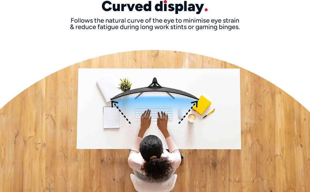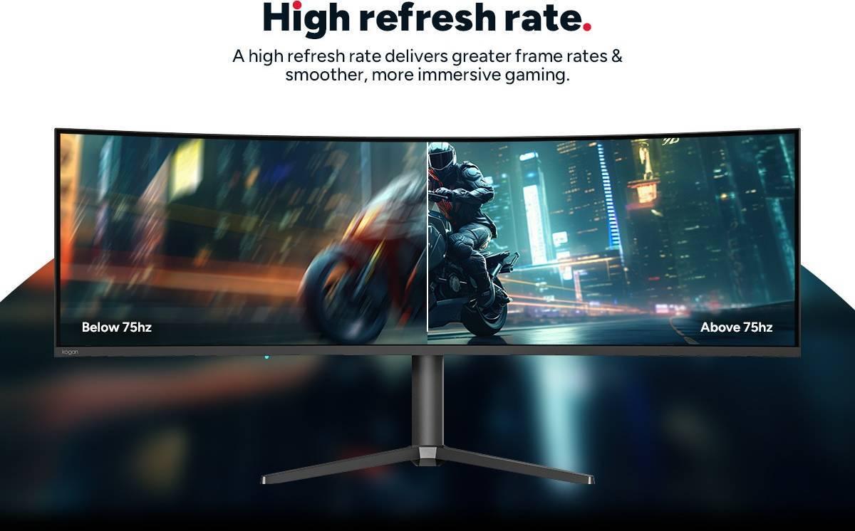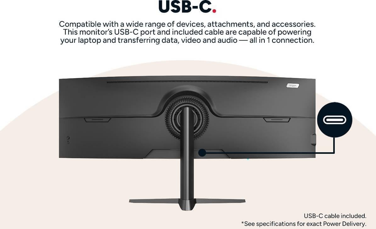 *Take your productivity and gameplay to new heights with a stunning Kogan™ Infinity 49” Curved Ultrawide Display that delivers breathtaking visuals, enhanced multitasking and a truly immersive experience – all in a single streamlined monitor.** Expansive 49” display. Dual QHD resolution in a 32:9 aspect ratio.* 1500R curved design. Enhances immersion and peripheral vision.* 5120 × 1440 resolution. Ultra-sharp visuals and detailed clarity.* 120Hz refresh rate. Smooth performance for gaming and content creation.* 1ms MPRT response. Fast-paced scenes with minimal blur.* FreeSync support. Eliminates screen tearing and stuttering.* 65W USB-C port. One cable for power, data and video.*Immersive ultrawide viewing*Designed to give you more screen real estate without the bezel interruptions of a dual-monitor setup, the expansive 49” panel delivers a true 32:9 aspect ratio. With Dual QHD resolution, you can view multiple windows, apps or timelines side-by-side—ideal for serious multitasking, creative work or immersive gaming.*Curved for comfort and focus*The 1500R curvature wraps around your field of view, drawing you into the centre of the action while reducing eye strain and enhancing peripheral awareness. Whether you’re gaming, editing or streaming, this curved display keeps you focused and fully engaged.*Vivid 5K visuals*With an ultra-crisp 5120 × 1440 resolution, every detail pops with clarity. Text looks sharper, colours appear richer, and images are remarkably lifelike, making it perfect for high-resolution content creation, video editing, or enjoying games as they were meant to be seen.*Fluid performance*A 120Hz refresh rate and rapid 1ms MPRT response time ensure ultra-smooth visuals with minimal motion blur. Combined with FreeSync technology, you’ll enjoy stutter-free gameplay and seamless transitions, even during the most intense action scenes.*Versatile USB-C connectivity*The integrated 65W USB-C port streamlines your workspace by delivering power, video and data through a single cable that is included with the monitor. Connect your laptop or other devices without extra clutter – perfect for professionals who value clean, efficient setups.*Customisable viewing comfort*Achieve the perfect viewing angle with tilt, pivot, and height adjustments to suit your preferences and maintain ergonomic comfort during long gaming or work sessions.
