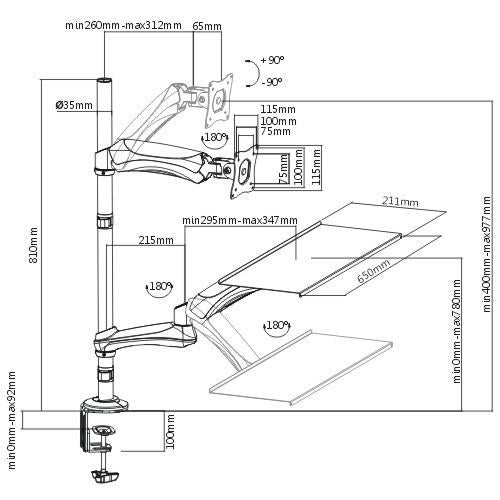 *Brateck: Single Monitor – Sit-Stand Workstation*Change from a sitting to a standing position whenever you want. The modular and flexible design of the sit-stand desk workstation fits most space while providing personalized ergonomic comfort. Counterbalanced adjustment points allow instantaneous, tool-free re-positioning while you work. Easily and independently lift keyboard and LCD screen to proper height for unsurpassed ergonomic comfort. This work style encourages healthy movement throughout the day.*Features** Easily and independently lift monitor and keyboard to proper height for allowing switch positions as you work* Effortlessly swivel, tilt and portrait-to-landscape rotation provide a wide range of motion* Gas spring structure offers perfect counterbalance presentation in all directions* Neat and efficient cable management* Both grommet and desk clamp mounting available*Specifications:** By Grade: Premium Series* Material: Aluminium, Steel* Surface Finish: Powder coating* Colour: Black* Product Size: 950×650×706MM* Installation: Clamp, Desk mount* Suggested Screen Size: 13"-27"* Screen Qty: 1* Rated Load: 9KG* VESA: 100×100;75×75* Tilt: –90°~+90°* Swivel: –90°~+90°* Rotate: 360°* Arm Extend: 668mm* Height: 800mm* Clamp Thickness: 10mm-88mm* Freely Height Adjustable: Yes* Cable Management: Yes* Anti-theft: No
