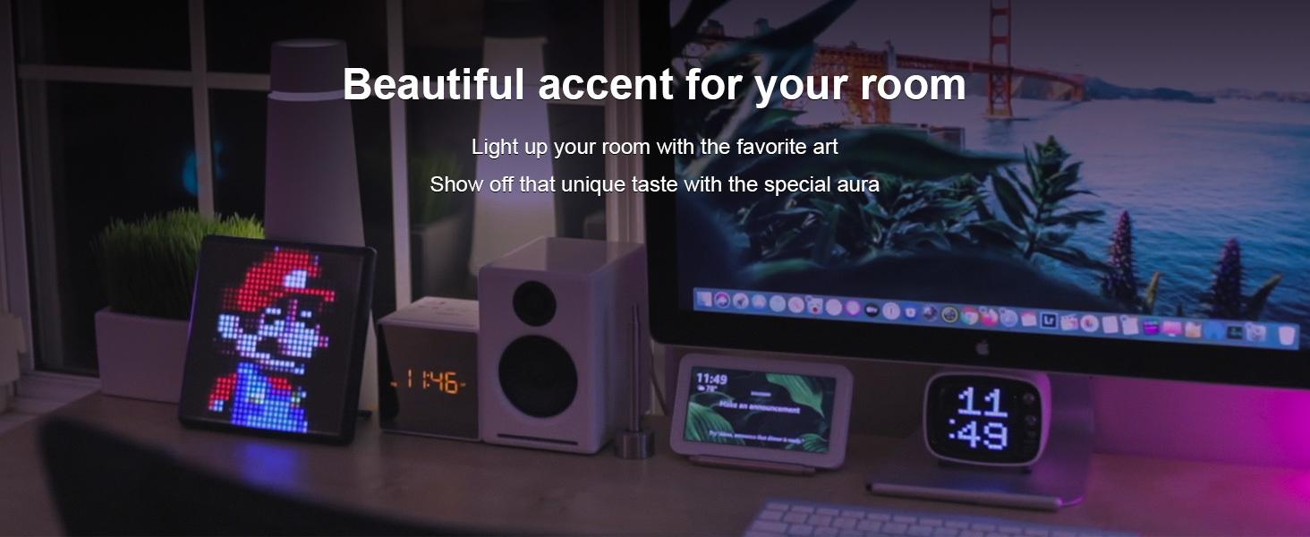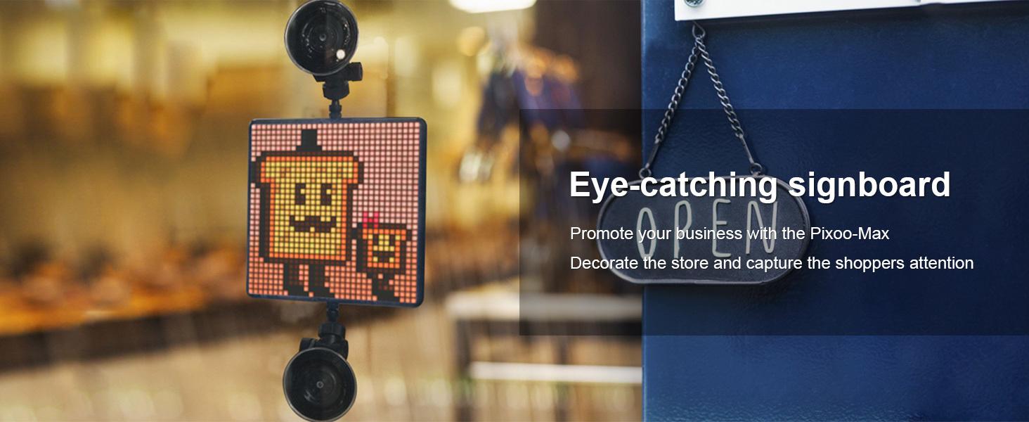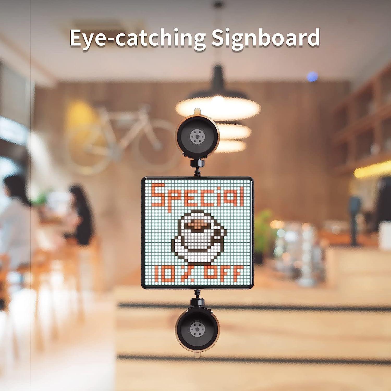 It is our most advanced pixel display board and has a 9.6” LED screen with a 32×32 pixel size.A big upgrade from the previous generation in terms of voice control function, which enables you to display images without being distracted on the road, by simply using a voice command.*Emoji Car Display*Comes with car-mount suction cups. Express yourself and get creative on the go! Send smileys out to considerate drivers, show your love for your favorite sports team, or send love hearts to that cutie in the car behind.*Design Pixel Artwork*This led display sign is an excellent way to exercise creativity. On the Divoom app, you are given the option of designing your own image, animation, and scrolling text message – all offering a large variety of options.*Great Room Decor*The breadth of different motifs is really great and a real eye-catching decor in every room, every gaming lounge, or just on the bedside table! If you are a huge video game fan, you can use the Pixoo Max to add another gaming accessories decoration on top of your computer setup. For non-gamers, there are a lot of options too, from calming sunsets to relaxing falling cherry blossoms.*More Practical Features*It is not only the signboard for shops, hotels, coffee, and bars to advertise and sales promotions but also a great wall clock or Halloween/Christmas led decor for a home or office. Support to get quick notifications from Twitter, Facebook, and Instagram, check the led screen of weather, thermometers, and noise meter.*What does it a Crystal LED Panels?*LED Panels for 32 X 32 Size Animation, then 16 X 16 LED Panels brighter, Crystal than others that have decided to use analog panels.Divoom Digital Picture Frame makes a big difference to watch in crisp as all the vibrant colors and intricate details will be noticeably better.*Why Choose Divoom Digital Frames?*Functional and stylish frame designs make a great addition to any room of your houseYour creat pixel animation will be displayed clearer and more vibrant on the 32 X 32 LCD panel.We allow more customized settings to meet your different needs, such as Brightness, etc.You can also put it on the wall with the wall mount hole on the back.Our Digital Frame's dedicated classic design makes it a beautiful decoration in your living space.*Technical Specifications** *_Dimensions:_* 172.8L x 172.8W x 19H mm* *_Weight:_* 495g* *_Frequency response:_* 100–20KHz* *_Signal-to-noise ratio:_* ≥78dB* *_Playback time:_* up to 10hrs* *_Battery capacity:_* 5000mAh* *_Battery voltage:_* 3.7V* *_Wireless range:_* up to 10 meters/33 feet* *_Bluetooth compliant:_* 5.0