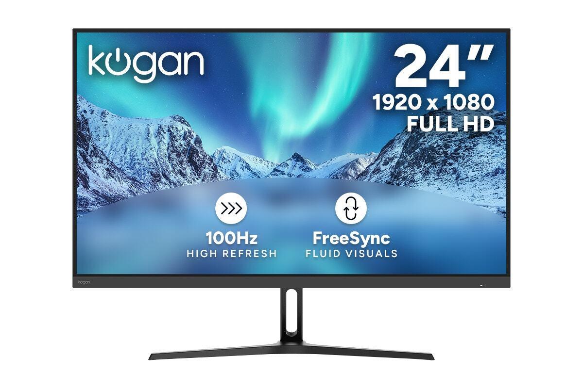 Experience smoother visuals and immersive clarity with the sleek Kogan™ 24" Full HD Monitor – perfect for work, study and entertainment. Enjoy fluid motion, vibrant colour and a frameless design that enhances both productivity and play.* _24" Full HD display._ Crisp 1920 × 1080 resolution for clear viewing.* _100Hz refresh rate._ Smoother transitions and reduced motion blur.* _FreeSync support._ Minimises screen tearing and input lag.* _Frameless design._ Clean, modern look with edge-to-edge visuals.* _16:9 aspect ratio._ Ideal for multitasking, media and gaming. Sharp, Full HD displayWith a 1920 × 1080 resolution, the Kogan 24" monitor delivers sharp, detailed visuals whether you're editing documents, watching videos or playing games. Its Full HD clarity ensures you don’t miss a single detail, while colours appear vivid and well-balanced for an exceptional viewing experience.Ultra-smooth 100Hz refresh rateEnjoy a more fluid experience with a 100Hz refresh rate that reduces motion blur and delivers smoother transitions. Whether you're gaming, scrolling or multitasking, the increased refresh rate enhances responsiveness and visual clarity across all your tasks.Tear-free FreeSync technologyEliminate screen tearing and stuttering during fast-paced scenes with built-in FreeSync support. By syncing your monitor’s refresh rate with your graphics card, it ensures smooth, uninterrupted visuals – ideal for gamers and content creators alike.Sleek frameless designThe minimalist, frameless design of this monitor not only looks great on any desk but also maximises screen real estate with edge-to-edge visuals. It’s ideal for dual-monitor setups and enhances your focus by reducing visual distractions.*Technical Specifications*Dimensions* VESA Wall Mount Pattern: 75 × 75mm* Weight: 2.9kg* With Stand: 538 × 186 × 413mm* Without Stand: 538 × 45 × 319mmDisplay* Brightness: 250cd/m²* Colour Depth: 8 bit* Colour Temperature: Warm: 6500K | Standard: 7500K | Cold: 9300K* Colours: 16.7M* HDR: Yes* Monitor Resolution: Full HD* Monitor Size: 24"* Native Aspect Ratio: 16:9* Panel Type: VA* Refresh Rate: 100Hz* Resolution: 1920 × 1080* Response Time: 14ms* Static Contrast Ratio: 4000:1* Viewing Angle: 178° (V) / 178° (H)* sRGB: 99%Features* Colour: Black* Flicker-free: Yes* FreeSync: Yes* Freesync Range: 48–100Hz* Low Blue Light: Yes* OnScreen Control (OSC): YesFunctions and Features* LED Indicator Light: YesGeneral* Design: Frameless design* Type: MonitorInputs* HDMI: 2 × 2.1Outputs* Headphone Jack: YesPerformance* Tilt Angle: –5° ~ 15°Power* Output: 12V, 2.5A* Power Consumption: 24W* Power Supply: 100–240V, 50/60Hz* Standby Consumption: < 0.5WWarranty* Manufacturer Warranty: 1 Year