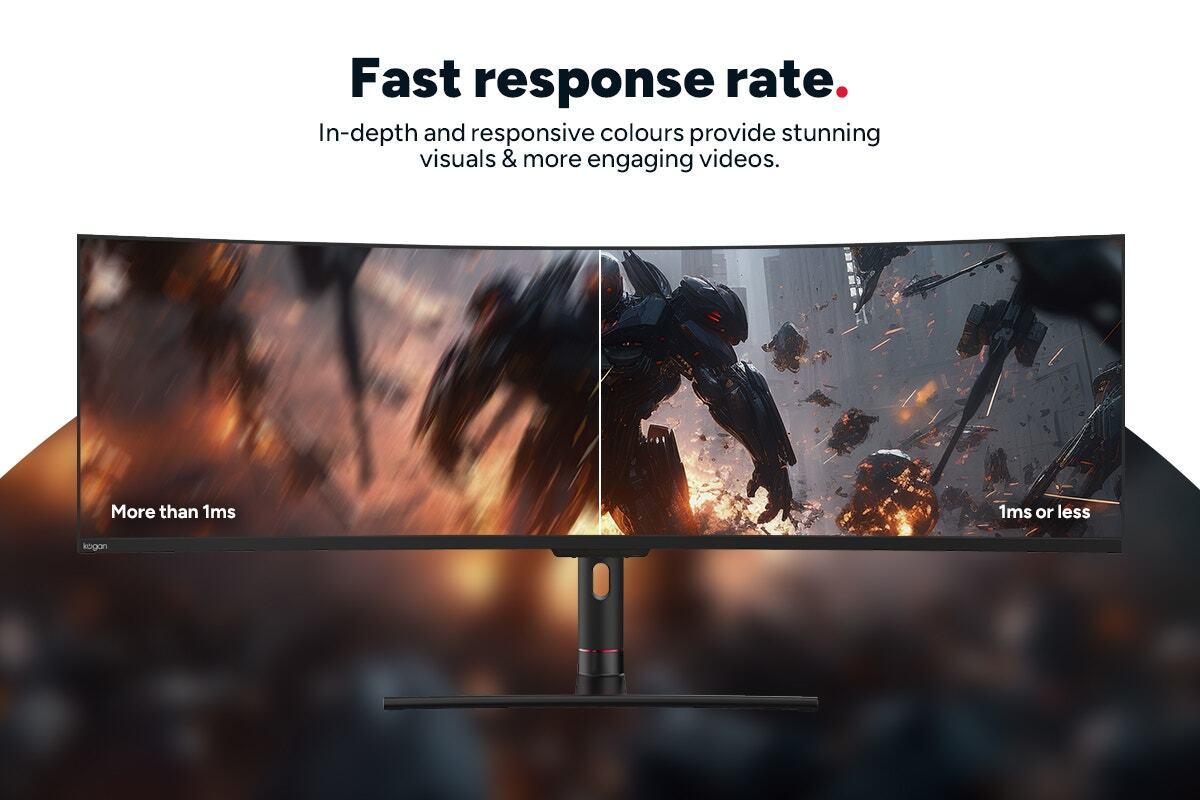 Immerse yourself in your virtual world with the Kogan™ Infinity 49" Curved Ultrawide DFHD 144Hz 1ms FreeSync USB-C Gaming Monitor, designed to deliver breathtaking visuals, seamless gameplay and ultimate captivation.* _Ultrawide 49" DFHD display._ Expansive screen for immersive viewing.* _1800R curved screen._ Wraparound viewing helps to reduce eyestrain.* _USB-C connectivity._ Versatile and convenient single-cable connection.* _144Hz refresh rate._ Smooth, tear-free gameplay.* _3840 × 1080 resolution._ Crisp and detailed visuals.* _HDR400 support._ 16.7 million colours and deep contrast.* _1ms MPRT response time._ Fast response for competitive gaming.* _Height adjustable stand._ Positions to suit your gaming setup.*Immersive ultrawide display*The Kogan Infinity 49" Curved Ultrawide DFHD Monitor offers an expansive 49-inch display with a 32:9 aspect ratio, providing an ultra-wide field of view that draws you deeper into your games.*Rapid 144Hz refresh rate*With a 144Hz refresh rate and 1ms MPRT response time, this monitor is built for fast-paced gaming. Whether you're exploring open worlds or engaging in competitive multiplayer, you'll enjoy smooth, responsive gameplay that keeps you in control.*Lag-free gaming with FreeSync technology*Experience ultra-smooth visuals with FreeSync technology, which synchronises the monitor's refresh rate with your GPU. This eliminates screen tearing and stuttering, ensuring a seamless, uninterrupted gaming experience.*Wraparound 1800R curvature*The 1800R curved screen ensures a wraparound viewing experience, making you feel like you’re right in the middle of the action. The curvature matches your eye’s natural viewing arc, helping to reduce eyestrain during extended gaming sessions.*Versatile USB-C connectivity*Simplify your setup with USB-C connectivity, allowing you to connect your devices with a single cable. This versatile port not only transmits video and audio but also powers your devices, reducing clutter and keeping your gaming area neat and organised.*Specifications:*Audio* Audio Output: Yes* Speakers: 2 × 3WConnectivity* Ethernet (RJ45): YesDimensions* VESA Wall Mount Pattern: 75 × 75mm* Weight: 11.5kg* With Stand: 120 × 29 × 56.6cm* Without Stand: 120 × 15.9 × 37.6cmDisplay* Actual Contrast Ratio: 3000:1(ANSI)* Brightness: HDR: 400nits | SDR: 320nits* Colour Depth: 8-bit* Colours: 16.7M* Curvature: 1800R* HDR: HDR400* Monitor Colour Gamut: NTSC 87% | sRGB 122% | Adobe RGB 91% | DCI-P3 96%* Monitor Resolution: Dual FHD* Monitor Size: 49"* Monitor Size: 49"* Native Aspect Ratio: 32:9* Panel Type: VA* Pixel/Dot Pitch: 0.1038mm (H) x 0.3114mm (V)* Refresh Rate: 144Hz* Resolution: 3840 × 1080* Response Time: MPRT: 1ms* Type: Curved ultrawide display* Viewing Angle: 178° (V) / 178° (H)Features* Colour: Black* Flicker-free: Yes* FreeSync: Yes* Freesync Range: 48–120Hz* Low Blue Light: Yes* OnScreen Control (OSC): Yes* Over Drive: Yes* PBP: YesGeneral* Height Adjustable Stand: Yes (95mm)* Resolution: DFHD* Type: Gaming MonitorInputs* DisplayPort: 1 × 1.4* HDMI: 1 × 2.0* USB: 2 x Type-A | 1 x Type-B* USB Type-C: 1 (65W)Performance* Swivel Angle: –15° ~ 15°* Tilt Angle: –5° ~ 15°Power* Power Consumption: Typical: 70W | Maximum: 180W* Standby Consumption: < 0.5WWarranty* Manufacturer Warranty: 1 Year
