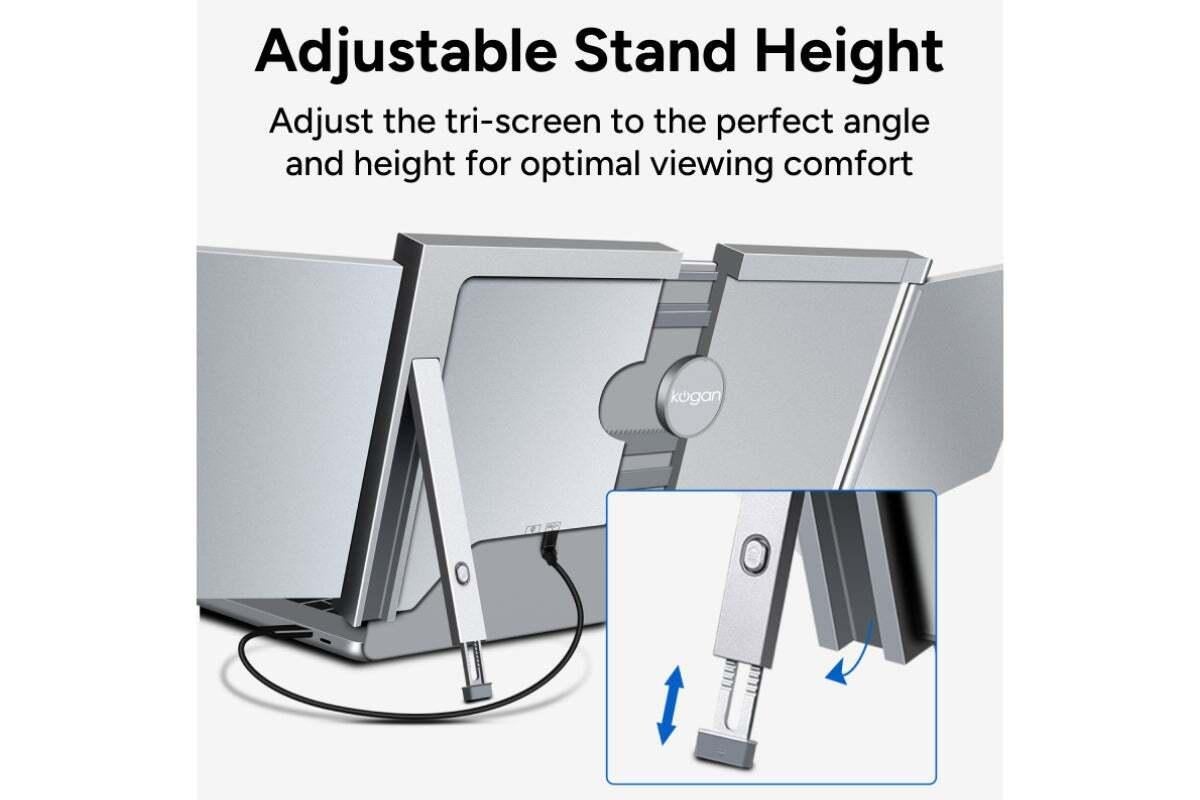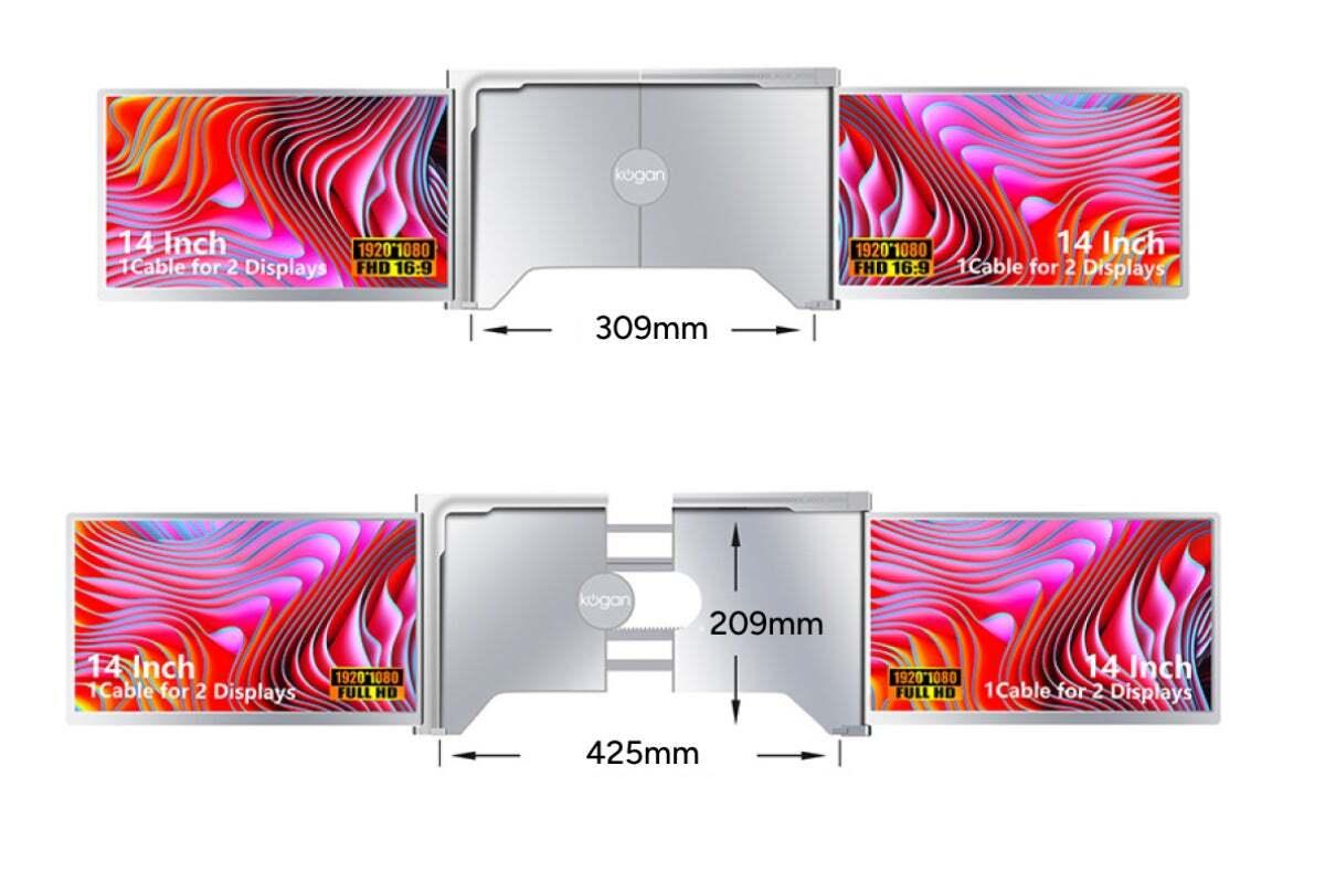 Unlock your productivity potential with the Kogan XPRESSO 14" Full HD Pro Dual Screen Tri-Fold Portable Monitor. Elevating your work-on-the-go experience, this innovative device redefines efficiency through its dual-screen capabilities, lightweight design, and the travel-friendly convenience of foldability.* Dual 14” IPS Displays. Expand your visual workspace with vibrant clarity* Full HD Resolution. Sharp, clear visuals to enhance your work and play* Laptop Compatibility. Works seamlessly with 14” – 17.3” Mac and Windows laptops* Travel-Friendly Design. Lightweight, foldable, and perfect for the professional on the go* Connectivity Made Simple. Includes a USB-C cable for easy setup*_Depending on your Mac’s capabilities, multi-display support may be limited. Before making a purchase, please refer to the Apple official Website to verify whether your computer is compatible with multiple displays._** *Work smarter, not harder*With the Kogan XPRESSO 14” FHD Pro Dual Screen Tri-Fold Portable Monitor, prepare to unlock new productivity peaks. End the hassle of window-switching with the luxury of extended displays, enabling you to view more, do more, and achieve more, whether you’re analysing data or weaving creative narratives. Plus, its USB-C power and display outputs ensure a seamless setup, so you can focus on your work without any interruptions.* *Compact and portable*Designed for the dynamic professional, this monitor redefines what it means to work on the move. Weighing just over 1kg and easily fitting into your travel bag, it ensures your optimum setup travels with you, making every space a potential office. Plus, with its adjustable stand, you can achieve the perfect viewing angle for unmatched comfort and productivity.* *Foldable convenience*Embrace the convenience of its tri-fold design, a testament to modern ingenuity tailored for the travelling professional. This monitor is not just an accessory, it’s a game-changer, making setup and pack-down effortless, ensuring you’re ready to work in any environment, from busy airports to quiet coffee shops.*Specifications** Dimensions: 360 × 29 × 221mm* Weight: 1.42kg* Actual Contrast Ratio: 800:1(ANSI)* Brightness: 250cd/m²* Monitor Colour Gamut: 45%* Monitor Resolution: Full HD* Monitor Size: 14"* Panel Type: IPS* Refresh Rate: 60Hz* Resolution: 1920 × 1080* Response Time: 25ms* Type: Dual Tri-Fold Display* Colour: Grey* Compatability: 14” – 17.3” Mac and Windows laptops* Type: Portable Monitor* USB Type-C: 2* Manufacturer Warranty: 1 Year*In the box** 1 x Kogan XPRESSO 14” Full HD Pro Dual Screen Tri-Fold Portable Monitor for 14” – 17” Laptops (1920 × 1080)* 2 x Type-C Cables* 1 x User Manual