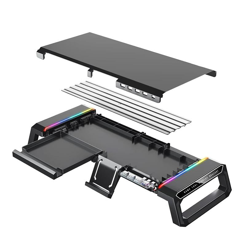*_RGB Gaming Computer Monitor Stand Lifter with Drawer – Black_**_Enhance your gaming setup and optimize your workspace_*This versatile monitor lifter not only elevates your monitor to a more ergonomic viewing height, it also features a built-in phone and tablet stand and a convenient storage drawer. Integrated RGB lights add a pop of vibrancy, making your desk setup more compact and visually appealing.*_Versatile Design:_*Combines a monitor lifter, phone/tablet stand, storage drawer, and RGB lighting, making it a comprehensive solution for your desktop needs.*_Sturdy Construction:_*Made of sturdy ABS, this stand can support up to 30kg without mounting, ensuring stability for your monitor and accessories.*_Convenient USB Ports:_*Equipped with 4 USB ports for fast data transfer and more.*_Ergonomic Height Raise:_*Raise your monitor to a comfortable viewing angle to reduce neck strain and improve posture during extended use.*_Stylish RGB Lighting:_*Add a colourful, customizable glow to your setup and enhance the aesthetics of your gaming or work environment.*Technical Specifications**Colour:* Black*Material:* ABS*Unfolded dimensions:* 53.5 × 20 × 7.5 cm*Folded dimensions:* 41 × 20 × 7.5 cm*Weight:* 1.81 kg*Package Contents:*1 x Monitor Stand1 x USB Cable1 x User Manual