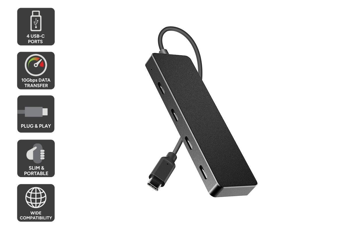 Maximise your device's potential with the Kogan™ 10Gbps 4 Ports USB-C Splitter. This sleek and portable splitter provides high-speed data transfer and multiple USB-C ports, allowing you to connect multiple devices simultaneously.* _10Gbps data transfer._ Lightning-fast transfers to keep your workflow smooth.* _4 additional USB-C ports._ Connect multiple devices simultaneously.* _Plug and play._ Just plug in and start using – no extra wires or software needed.* _Slim and portable design._ Ideal for travelling, ensuring you stay connected on the go.* _Wide compatibility._ Works with most USB-C devices, including both Windows & Apple. Seamless connectivity on-the-goWith the Kogan 10Gbps 4 Ports USB-C Splitter, you can expand your device's connec­tivity options instantly. Whether you're transferring data, connecting to external monitors or charging devices, this splitter handles it all with ease. The high-speed 10Gbps data transfer ensures your files move quickly, reducing wait times and keeping your work efficient.Effortless setupForget about complicated setups. The plug-and-play design means you simply connect the splitter to your device and start using it right away. No additional software or wires are required, making it an intuitive solution for any tech setup.Compact and travel-readyDesigned with portability in mind, this slim splitter is easy to carry wherever you go. Whether you're working from a café, travelling for business or simply need a reliable tool on the move, the Kogan USB-C Splitter ensures you’re always prepared.Universal compatibilityThis splitter is compatible with most USB-C devices, making it a versatile addition to your tech arsenal. Whether you use it with laptops, tablets or smartphones, you’ll enjoy seamless connectivity across all your devices.*Technical Specifications*Dimensions* Dimensions: 10.1 × 1 × 3cm* Power Cable Length: 15cm* Weight: 32gFeatures* Colour: BlackGeneral* Compatible Devices: Laptops, tablets, smartphones, etc. (including both Windows & Apple devices)* Design: Plug-and-play design* Material: ABS material* Portable: Yes* Type: SplitterInputs /Outputs* USB Type-C: 4 x USB 3.2 (Gen 2)Performance* Data Transfer Speed: 10GbpsWarranty* Manufacturer Warranty: 1 Year