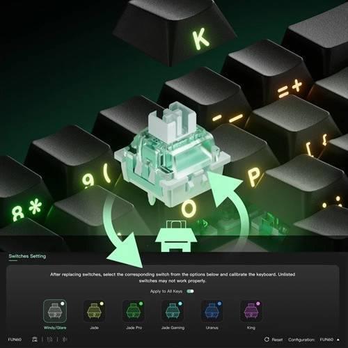 Introducing MonsGeek FUN Series: FUN60 Ultra Magnetic Switch Aluminum Keyboard!It’s time to be revolutionary and make something different.*Features:** Cross-compatible with Major Magnetic Switches* Hot-swappable with 5-Pin Mechanical Switches (MagMech Compatible, TMR Version only)* 0.01mm RT for Superior Gaming*Cross-Compatible with Mainstream Magnetic Switches*The FUN60 Series Rapid Trigger Keyboard offers cross-compatibility with 5 third-party magnetic switches. Users can select the corresponding switch from the list in the MonsGeek Driver and easily calibrate the keyboard after replacement. You can also mix and match them in different keys simultaneously.*RT0.01mm*Achieve ultra-accurate 0.01mm Rapid Trigger and adjustable actuation distance in 0.01mm step. This allows users to fine-tune their typing or gaming experience, ensuring optimal actuation for faster response times with enhanced precision, ideal for competitive gaming.*Turbo Mode for Rapid Trigger*Turbo Mode can be enabled for quick recognition and easy management. Keys with Turbo Mode activated are marked with a “flash” icon, so they’re easy to spot at a glance.For example, assigning Turbo Mode to WASD enhances responsiveness and improves the overall gaming experience.*Arm Cortex-M4 CPU*The powerful CPU delivers enhanced processing power with low energy consumption. It features automatic calibration between –20°C and 80°C, ensuring faster performance and extended battery life (for wireless models only).*ARGB at a 500Hz Refresh Rate*FUN60 Series Magnetic Keyboard features ARGB(addressable RGB) with individually controlled LEDs for smooth, flicker-free lighting. With Alpha channel integration and a 500Hz refresh rate, it offers richer dynamic effects and reduces visual fatigue—perfect for gaming and aesthetic builds.*RT Stabilizer*This “RT Stabilizer” mode is especially useful when set to a Rapid Trigger precision of 0.01mm, as magnetic switch keyboards may experience unintended inputs or disconnection from slight hand tremors, which can disrupt the overall gaming experience.It can be activated via the MonsGeek Driver with 4 different filtering levels.