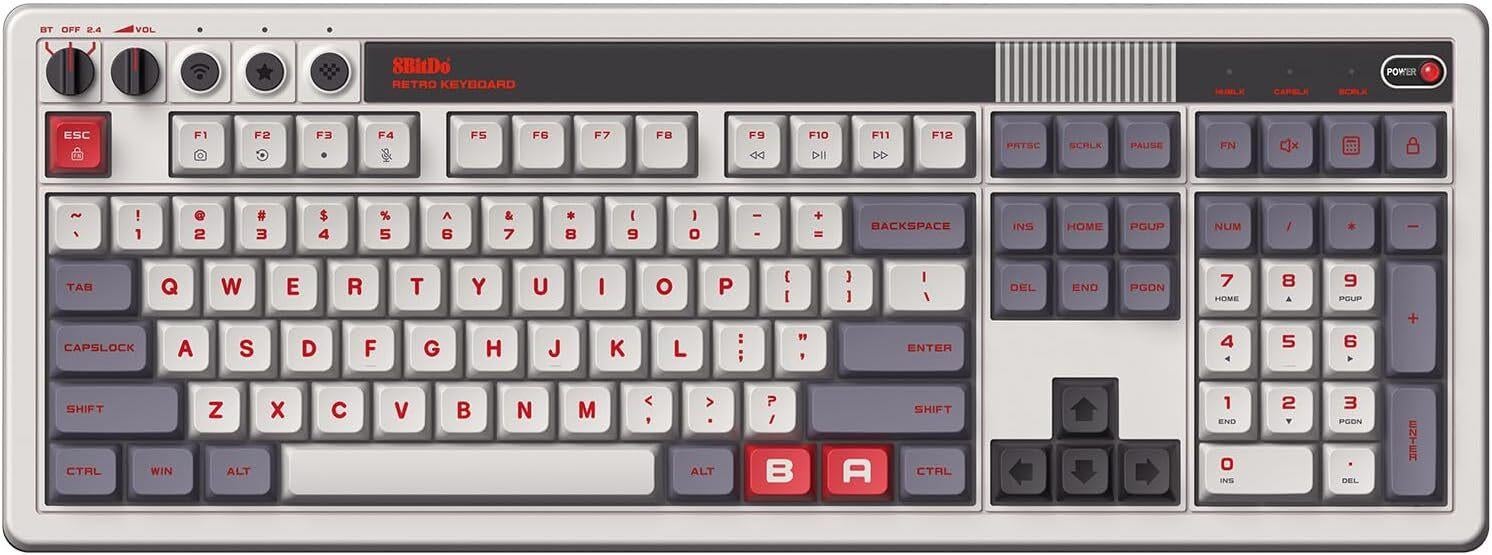The Retro Mechanical Keyboard in full layout. Compatible with Windows and Android. Available in N and Fami editions.*Ultra-compatibility*Connect via Bluetooth, 2.4G wireless, or wired. With PBT dye-sublimation keycaps and a consistent feel from the top-mount structure, it combines durability with a seamless typing experience.*Simplicity at its best*Connections, volume adjustment, button mapping… Say goodbye to complex shortcuts. Enjoy effortless operation with just a turn and a click.*Integrated Numpad and Function Key Shortcuts*Enhance your gaming and productivity with added Windows shortcuts, Calculator, Function Lock, and Screen Lock.*Game Changer: Dual Super Buttons*The specially designed 8BitDo Dual Super Buttons offer large, programmable keys. Set macros to the Super Buttons, or map anything to them instantly without using software. Connect up to 4 sets (1 set included).*Compatible with all 8BitDo Keyboard Extensions*Create your own keyboard setup with the 8BitDo Super Stick, Super Button, and Super ABXY — sold separately.*8BitDo Ultimate Software on PC*Our Ultimate Software lets you effortlessly configure your programmable keys. Switch key mappings on the fly and take advantage of powerful macro functions for a personalized performance.Features:* 108 keys* Kailh Box White Switches V2* Hot-swappable PCB* Function key shortcuts* Support n-key rollover* Support 8BitDo Ultimate Software* Dye-sublimation PBT keycaps with MDA-like height* Programmable buttons* Fast-mapping on programmable buttons (no software needed)* Top mount styleCompatibility* Windows 10(1903) and above* Android 9.0 and aboveConnectivity* Wireless 2.4G* Bluetooth Low Energy* Wired USBDimension / Weight* Keyboard: 458.7_169.7_47.8mm / 1350g* Dual Super Buttons: 160.2_74.6_32.3mm / 270gBattery Type / Battery Life* 2000mAh Li-on battery, rechargeable* 200 use hours with 4 hours charging timeIncludes* 8BitDo Retro 108 Mechanical Keyboard x 1* 8BitDo Dual Super Buttons x 1* USB cable x 1* 2.4G adapter x 1* Instruction manual x 1* 8BitDo Fun Stickers x 2