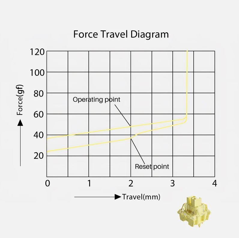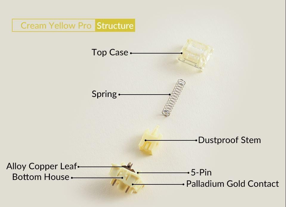 Creamy Yellow Pro is an upgraded version of Creamy Yellow.* Linear switch with smooth travel* 5-Pin switches and Dustproof stems for better stability* Palladium gold contacts* Alloy copper* Lubed rail to reduce friction*Technical Specifications:** *Type:* Linear* *Operating Force:* 50gf ± 10gf* *Total Travel:* 3.3mm* *Pre Travel:* 2.0 ± 0.6mm* *Tactile Position:*N/A* *Tactile Force:* N/A