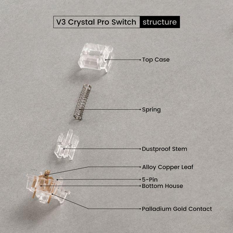 Akko Crystal Pro has upgraded the regular Crystal with a dustproof structure, with additional lubes on the rails, providing better out-of-box experiences;Akko’s full polycarbonate switches;45gf classic actuation force with 18mm extension spring.*Features:** Linear switch with smooth travel* Factory lubricated rail to reduce friction* Dust-proof to protect against dust* Cherry MX compatible stem fits most keycaps*Technical Specifications**V3 Crystal Pro Keyboard Switch** *Type:* Linear* *Operating Force:* 45±5gf* *Total Travel:* 3.8mm* *Pre Travel:* 2.0 ± 0.5mm* *Tactile Position:* N/A* *Tactile Force:* N/A* *Compatibility:* Compatible with any Cherry style switches PCB. 5 pins can be adjusted to 3 pins by clipping off 2 extra pins if needed.