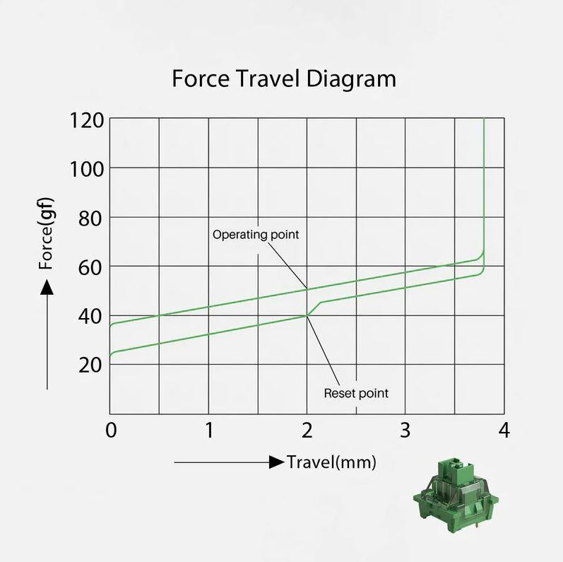 Akko Matcha Green Pro has upgraded the regular Matcha Green with dustproof structure, with additional lubes on the rails, providing better out-of-box experiences;The 50gf actuation force for Matcha Green Pro is heavier than regular Matcha Green and is a great option for users who are in favor of smooth linear switches but prefer stronger feedback and deeper sound;*Features:** Linear switch with smooth travel* Factory lubricated rail to reduce friction* Dust-proof to protect against dust* Cherry MX compatible stem fits most keycaps*Technical Specifications**V3 Matcha Green Pro Switch** *Type:* Linear* *Operating Force:* 50gf ± 5gf* *Total Travel:* 3.8mm* *Pre Travel:* 2.0 ± 0.5mm* *Tactile Position:* N/A* *Tactile Force:* N/A