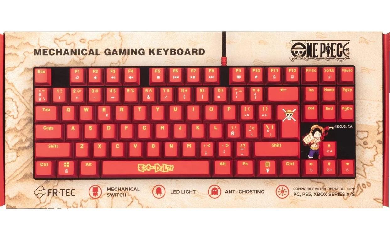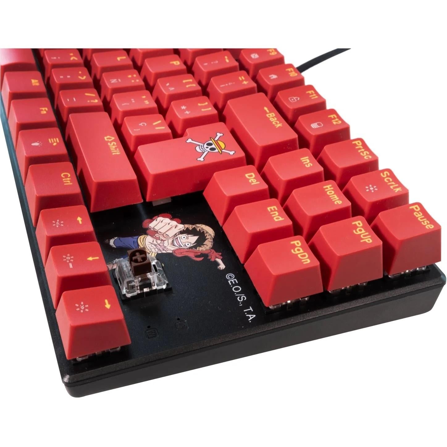*TKL mechanical keyboard with anti-ghosting*Compact design with brown tactil switch keys featuring Luffy’s colours. Anti-ghosting keyboard prevents key conflicts when multiple keys are pressed at once.*Backlit keys*Allows viewing of letters or symbols in low light or darkness. Users can choose from over 9 different modes to light up keys in a stunning red colour.*Tangle-free braided cable*Prevents annoying knots with the nylon coating of the cable, making connections safer and more durable.* Official One Piece license* Different lighting modes* Plug and play* Anti-ghosting keys* Mechanical keyboard with brown “tactile” switchesSpecs:Accessory type – KeyboardsConsole compatibility – PC GamingMechanical keyboard – YesKeyboard size – 75% (Compact tenkeyless)Keyboard layout – StandardKeycaps colour – RedCase colour – BlackSwitch type – TactileSwitch brand & colour – BrownBacklit keyboard – YesConnectivity – WiredPower Supply – USB PoweredProduct Height (mm) – 30Product Width (mm) – 350Product Depth (mm) – 125Product Weight (kg) – 0.551
