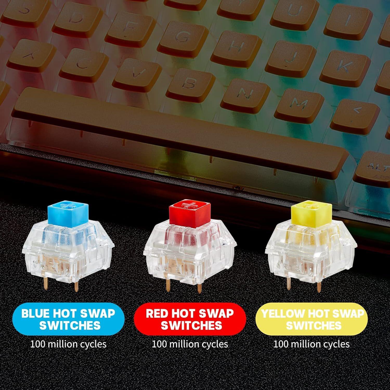 *_Hexgears Soda Orange 65% RGB Clicky Mechanical Wireless Gaming Keyboard – Orange_** *18 RGB backlit and SODA Vibe*The appearance of this Soda mechanical keyboard is soda/cola vibe which is unique and more than cool. The Soda transparent keyboard uses high quality PC material – Acrylic to make the translucent case and all keycaps which make it capable of good light transmittance. Additionally, the soda RGB backlit keyboard has 18 backlight cycling effects and 8 backlight colors to switch between. You can also adjust the backlight brightness and backlight change rate.* *Premium Tactile & auditory Experience*The Soda mechanical keyboard uses Kailh BOX mechanical switches which provides accurate tactile and audio responses, allowing you to execute every keystroke with lightning-fast precision. The clicking sound is also pleasant to the ear. Double-shot PBT keycaps ensures the legends are clear and does not fade easily so that the 2-layer keycaps design achieves both Shine-through appearance and unparalleled typing experience.* *68-Key Mechanical Keyboard: Compact and Comfortable*The Soda wireless mechanical keyboard adopts ultra-compact 68 keys layout which retains all necessary keys and support multiple FN key combination function that strikes the perfect balance between functionality and portability. Besides, the OPEN-SOURCE FIRMWARE allows you to remap your favorite keys and create macros with any key which means endless possibilities for keyboard layouts, shortcuts, backlight effects, and etc.* *Tri-mode Connection: USB-C Wired, Bluetooth & 2.4GHz Available*The Soda mechanical keyboard supports Bluetooth, 2.4 GHz wireless, wired TYPE-C and USB connections to connect your devices like PC, tablet or mobile phone as you like. Just press FN+TAB one key to switch different connection modes at any time easily.The magnetic top cover comes with the keyboard is dustproof and impact resistant which can also be used as a hand rest or a phone holder.* *High Durability*Kailh switches for maximum durability, giving this soda mechanical keyboard a lifespan of up to 100 million keystrokes, Besides, hot swap switches allow you to change switches as you wish to experience different feelings and sounds. This soda rechargeable mechanical keyboard has a battery life of up to 300 hours. In wireless mode, stop using for one minute to enter power saving mode that turn off the backlight and for 10 minutes to enter hibernation mode.*Highlights*• Space-saving design packed with personality: 65% gaming keyboard that is ultra-compact and boasts great ergonomics for excellent stability, ideal for both gaming setups and the office.• Programmable RGB backlight & macros: Unlock gaming excellence with macro capabilities and personalized lighting using our user-friendly software for style and precision.• Superb illumination: The Soda Orange RGB gaming keyboard features a robust transparent gasket and double-shot pudding PBT keycaps; for a visually stunning and colorful ambiance.• Premium low-latency performance: Elevate your game with low latency that is vital in every battle. Featuring 1k polling rate for fast speeds, and ultra-responsive hot-swappable switches.• Multi-purpose dust cover: The Soda Orange features a magnetic dust cover which doubles as a wrist rest. The cover also features two stoppers designed for holding your smartphone for easy viewing.• Accuracy meets precision: The Soda Orange features N-key rollover, an absolute essential function that registers complex key presses precisely, and accurately, during intense gaming*Specifications** Keyboard type: Soda Orange Three-mode Mechanical Keyboard* Connection mode: Bluetooth, 2.4GHz Wireless, Type-C USB* Switch: Custom Kailh® BOX Switch* Switch type: Clicky* Switch lifespan: 100 million Clicks* Polling rate: 1000Hz (wired mode)* Backlight: RGB* Cable material: USB Cable braided wire* Compatibility: Windows OS, MacOS, Android* Function keys: FN combination key* Key layout: 68 Keys* Keycap material: PBT* Battery capacity: 2900mAh* Input voltage / current: 5v / 500mA* Transmission distance: 10 meters* Keyboard size: 313 × 104 × 50 mm* Keyboard weight: 1008 grams*In the Box*✅Soda Orange 65% Mechanical Wireless Gaming Keyboard✅Keycap Puller✅Switch Puller✅User Manual✅Dust cover / Wrist rest