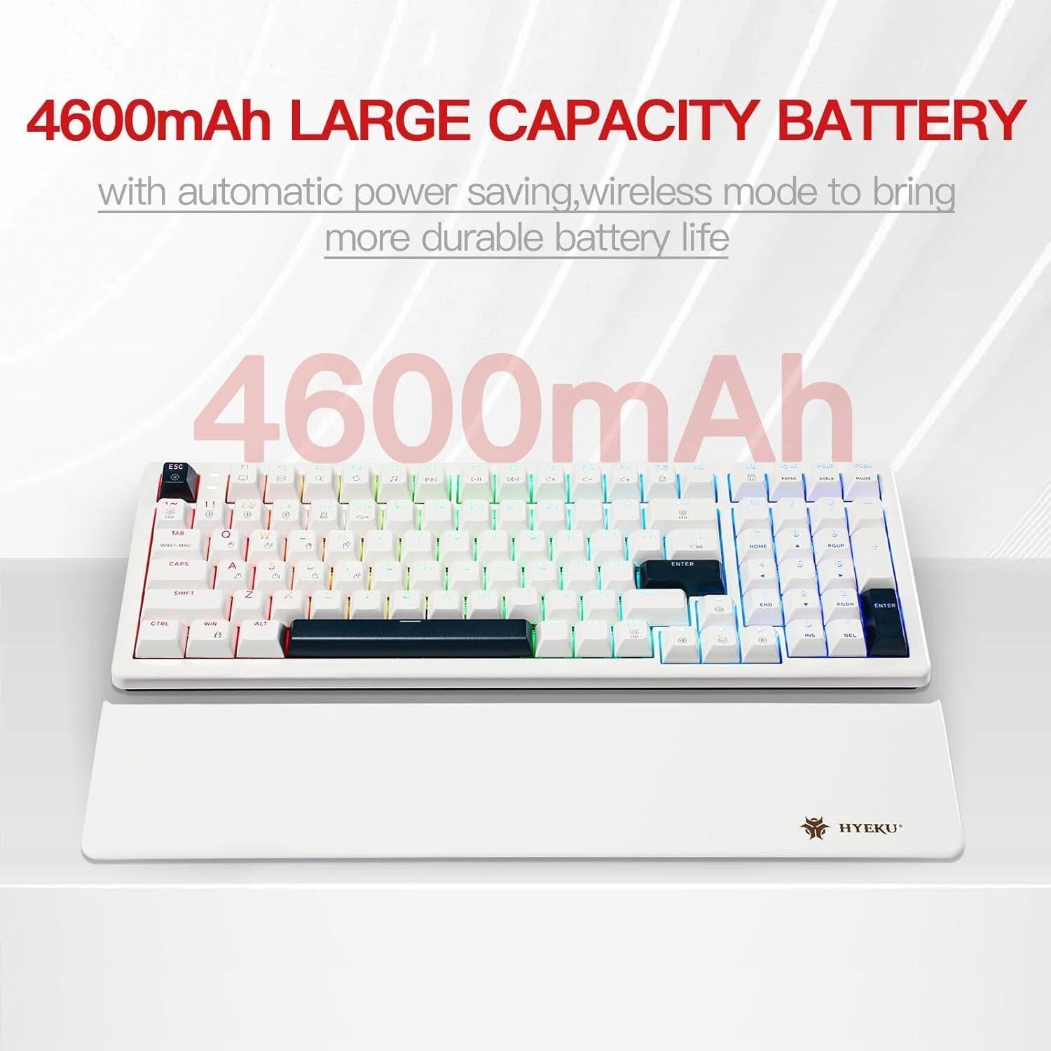 *_Hexgears Synergy WarpSpeed E4 Pro 99-Key RGB Wireless Mechanical Gaming Keyboard – White_** *Triple-mode Connection*Hexgears E4 Pro supports Bluetooth, 2.4G connection and detachable Type-C wired connection, easy to switch, and various ways to meet diverse work and entertainment needs. In addition, all three mode support full keys without punching, and press any number of keys in any order to accurately realize the required functions.* *Full Key Hot-Swappable GASKET Structure*You can freely change the switches and match them with a keyboard that suits your habits. Moreover, the E4 Pro keyboard uses a customized whole-piece silicone pad, which fits seamlessly with various internal parts, making the mechanical keyboard feel more uniform and effectively reducing noise caused by tapping on the shaft switch, ensuring a pure and comfortable feel and sound of the keyboard.* *Durable PBT Keycaps & Magnetic Wrist*Hexgear once again improves SA height, providing a more comfortable typing feeling. PBT dual color injection molding is wear-resistant and non-oiling, with a delicate touch and long-lasting wear resistance. The scientific ergonomic curved design of keycaps and magnetic wrist keeps your hands in their most natural state, providing maximum comfort and making them a great choice for gaming and office work.* *RGB Full Color Backlight*RGB is paired with a high gloss transparent PVC positioning board to make the keyboard appear brighter. This Gaming keyboard can be set to solid or RGB colors and supports multiple backlight modes. Even without lighting, games can be played well at night. You can also adjust the brightness of the backlight and breathing speed according to your preferences.* *4600 mAh High-capacity Battery*This wireless mechanical keyboard with auto power saving, ultra-long usage time so you don't have to worry about frequent charging, auto hibernation function will automatically enter hibernation state when you don't perform any operation, just click any key to activate, charging through type-c, you can use while charging.*Highlights*• World-class connectivity: Switch seamlessly between work and gaming mode on multiple devices, and enjoy reliable speeds, and fast responsiveness with the WarpSpeed E4 Pro gaming keyboard.• Enjoy none-stop gaming: The WarpSpeed E4 Pro mechanical gaming keyboard is built with a 4600 mAh re-chargeable battery. Enabling you to power through up to 40 hours of gameplay.• 99-Key premium ergonomics: Built to maximize comfort for long-lasting use. The WarpSpeed E4 Pro full size gaming keyboard conforms to your hands, and includes a magnetic wrist rest for pinnacle typing comfort.• Play with speed: The WarpSpeed E4 Pro gaming keyboard offers quicker keystrokes thanks to the patented Kailh® BOX Switches; enabling you to register key presses with speed and accuracy for total gaming domination.• Precision crafted PBT keys: The WarpSpeed E4 Pro mechanical keyboard features ultra-durable translucent PBT keycaps. Ensuring long-lasting perfection for intense gaming, and typing.• Vibrant RGB lighting effects: Illuminate your touch with the WarpSpeed E4 Pro wireless mechanical keyboard's RGB backlight, and choose from multiple lighting effects to get into Warp-Speed gaming.*Specifications** Keyboard type: Three-Mode Mechanical Keyboard* Connection mode: 2.4GHz Wireless, Bluetooth, Type-C USB Wired* Switch type: Kailh mechanical BOX switches (Linear: Scarlet Clouds)* Keyboard polling rate: 1000Hz (Wired mode)* Backlight: RGB* Key layout: 99-key Ergonomic compact design* Keycap material: Double-shot PBT Keycaps* Battery capacity: 2300mAh x2* Input voltage / current: 5v / 1000mA* Wireless distance: 10 meters* Keyboard size: 395 × 142 × 44 mm* Weight: 1270 grams* Cable: Type-C USB data cable*In the Box*✅WarpSpeed E4 Pro Wireless Mechanical Keyboard✅Keycap Puller✅Switch Puller✅User Manual✅Dust Cover