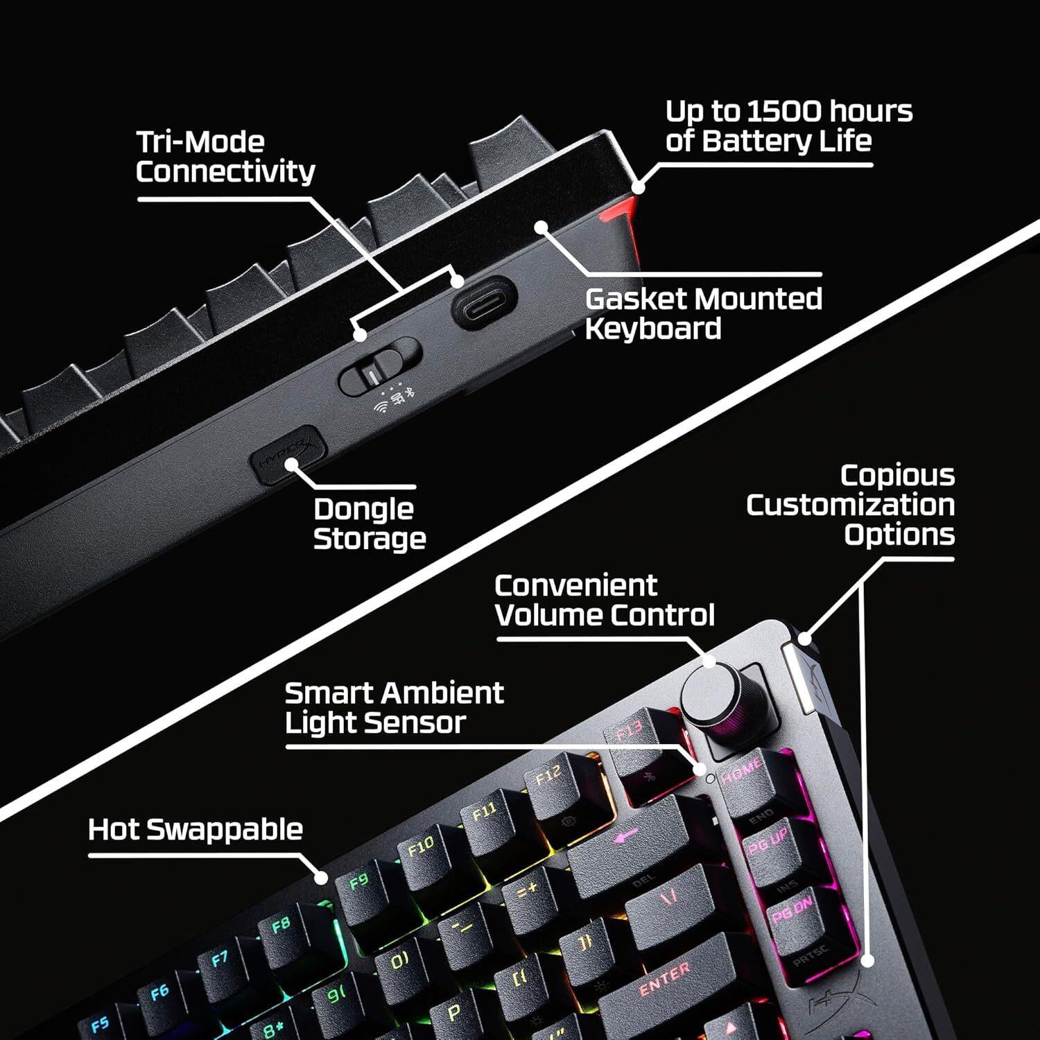 With the longest battery life on a backlit dual-wireless gaming keyboard on the market1, never fear adventures getting cut too short with the HyperX Alloy Rise 75 Wireless Gaming Keyboard. Dive into non-stop gaming excitement with 80 hours of backlit, immersive gameplay, or push the limits to a staggering 1500 hours with the backlighting off.Pick between a seamless 2.4GHz wireless connection or switch between up to 3 devices via Bluetooth. Personalize your adventures with the most customizable gaming keyboard; Not only can you hot-swap in key switches, but also magnetic top plates, badges, and more.Upgrade your gaming setup with our sleek 75% form factor, providing a great balance between compactness and function with its dedicated arrow keys, navigation keys, F keys, and rotary volume knob. This keyboard features a lightning-fast 1k polling rate for rapid keypress detection using our pre-lubed HyperX Linear Switches, rated for up to 80 million keypresses.You’ll also enhance your gaming ambiance thanks to the ambient light sensor, which auto-adjusts brightness based on your lighting environment.*Up to 1500 hours of battery life*Bask in up to 80 hours of electrifying gameplay with backlighting on or push your endurance up to 1500 hours with backlighting off.*Tri-mode connectivity*Select a smooth 2.4GHz wireless connection or switch between up to 3 devices with Bluetooth. Need a wired option? Simply connect via USB-C cable. Your connectivity, your call.*Copious customization options*With swappable toolless top plates, badges, and rotary knobs, you’ll have a wealth of ways to show off your own individual style. Rise up!*Gasket mounted keyboard*This keyboard is gasket mounted, pairing that feature with smooth, easy-actuating HyperX Linear Switches to make your typing an even more comfortable experience.*Hot-swappable key switches*Take keyboard personalization even further with the ability to hot-swap your key switches of choice into the board.*Ambient light sensor*The game at any time seamlessly with the ambient light sensor, dynamically adjusting the backlighting of your RGB to your environmental lighting conditions. Just tweak your preferences in NGENUITY and you’re set!*Superior keypress stability and reliability*HyperX Linear Switches have a half-wall POM stem for better stability of the preinstalled HyperX PBT Keycaps. They're also factory-lubed for smooth actuation and rated for up to 80 million keypresses.*Convenient volume control*Take control of your audio entertainment with a dedicated rotary knob to adjust or mute the volume.Specifications:Keyboard* Switch: HyperX Red – Linear* Actuation Point: Mechanical* Backlight: RGB (16,777,216 colors)* Light effects: Per key RGB lighting and 5 brightness levels* Onboard memory: 10 profiles* Connection type: Wireless* Anti-ghosting: 100% anti-ghosting* Game mode: Yes* Battery Life: Up to 80 hours with backlighting on or 1500 hours with backlighting off* Battery Type: >6000mAh Li-ion polymer batteryDimensions* Width: 330.8 mm* Depth: 142.2 mm* Height: 48.9 mm* Weight: 2.25 lb (with cable)* Cable Type: USB-C to USB-A, Braided* Cable Length (imperial) and type: 5.9 ft | USB-C to USB-A, BraidedWhat’s Included in the Box* HyperX Alloy Rise 75 Wireless* Detachable USB-C cable* Key Switch/Keycap Puller* Quick Start Guide
