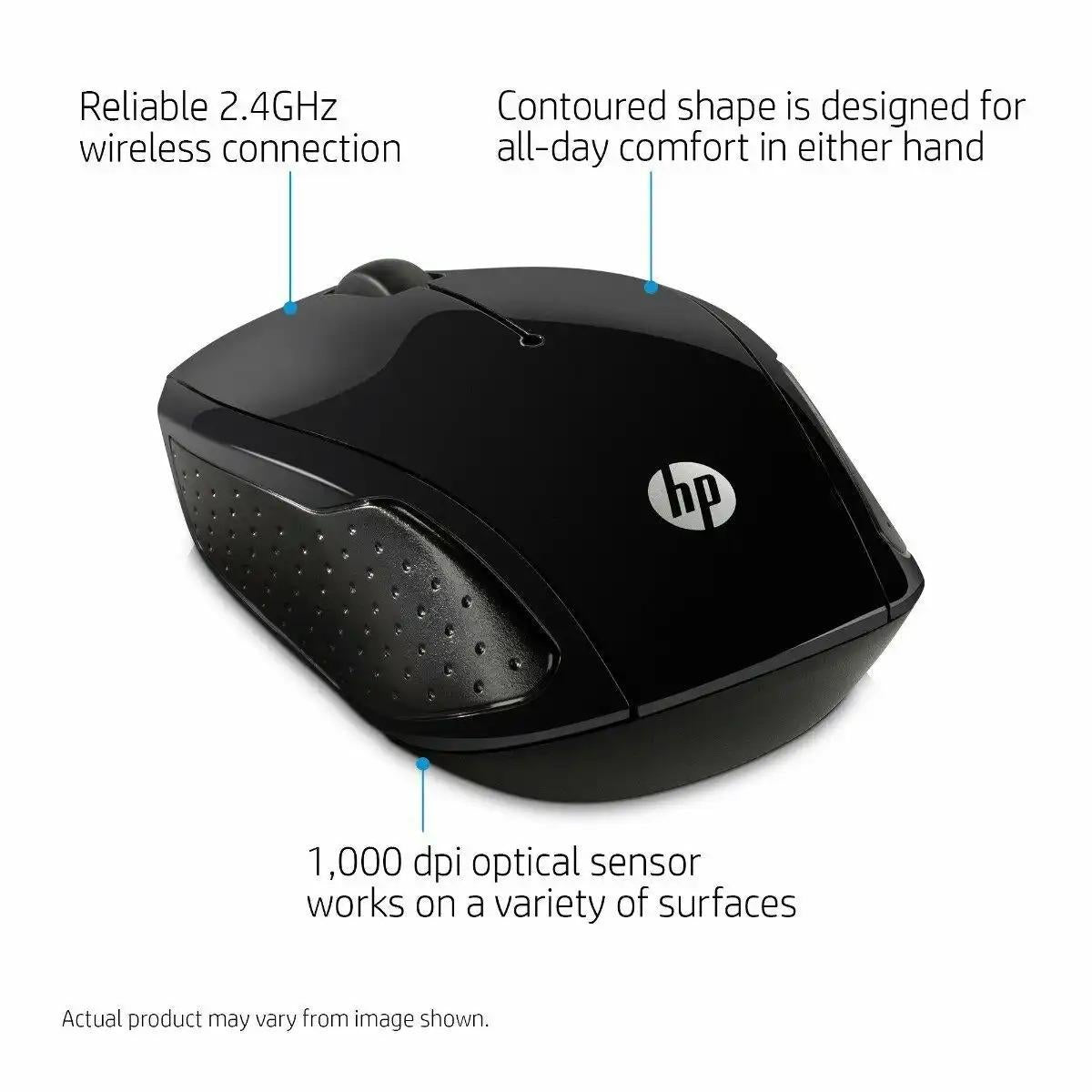 This affordable wireless mouse offers you more than a low price. It gives you the freedom to create without wires to tie you down. And our wireless mouse is contoured for either hand, so increasing your productivity is more effortless. It’s never been easier to go wireless for less.* *Wireless convenience:* No more wires with the reliable 2.4GHz wireless connection.* *Built to last:* Strict HP standards and guidelines ensure long-lasting quality.* *Contoured comfort:* A contoured shape designed for all-day comfort in either hand.* *Good to go:* With 2 AAA batteries included and no software to install you’re good to go.* *Reliability you can count on:* Red LED technology and a 1,000 dpi optical sensor gives you exceptional accuracy and speed across a wide range of surfaces.*Technical Specifications** *Advanced scroll wheel:* Normal* *Battery life:* Up to 12 months* *Battery type:* 2 x AAA* *Buttons:* 3* *Compatibility:* Available USB port* *Compatible Operating Systems:* * Windows 7 * Windows 11 * Windows 10 * Windows 8 * macOS * Chrome OS™* *Connection type:* 2.4 GHz wireless connection* *Indicator light:* Battery* *Manufacturer Warranty:* 1 Year Limited Warranty* *Minimum System Requirements:* Windows 7 and above, Mac OS 10.x and above, and Chrome OS* *Product subgroup:* Mouse* *Registration required:* No* *Resolution:* Up to 1000 dpi* *Sensor technology:* Red optical tracking* *UNSPSC code:* 43211612* *What's in the box:* * HP Wireless Mouse 200 * 2.4 GHz wireless dongle * 2 AAA batteries * Quick Start poster * Product notices * Warranty card* *Wireless range:* Up to 10 m in open area