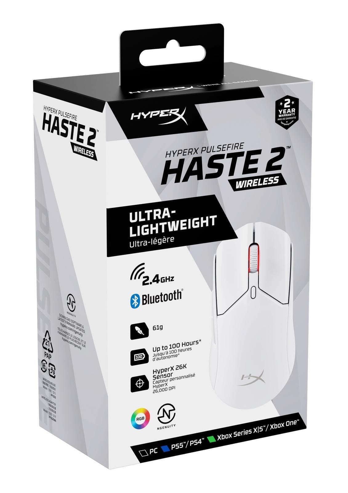 The HyperX Pulsefire Haste 2 Wireless has a solid upper shell, but keeps the 61g weight and 100 hour\*\* battery life of the original Pulsefire Haste Wireless. It adds dual mode wireless to switch between 2.4GHz wireless and Bluetooth connections. We’ve also included our high performance HyperX custom components, highlighted by the HyperX 26K Sensor which detects 26,000 DPI natively and custom HyperX Switches rated for up to 100 million clicks. You’ll also enjoy superior physical control of your mouse with virgin PTFE skates and grip tape.Features:* Up to 100 hours of battery life* Ultra-lightweight 61g design* Dual wireless connectivity modes* Precision HyperX 26K Sensor* Custom HyperX Switches* Virgin PTFE Skates and Grip Tape* Seamlessly switch to wired mode* Customizable with HyperX NGENUITY SoftwareMouse Specifications* Shape: Symmetrical* Sensor: HyperX 26K Sensor* Resolution: Up to 26000 DPI* Speed: 650 IPS* Buttons: 6* Left / Right Button Switches: HyperX Switch* Left / Right Button Durability: 100 million clicks* Light Effects: Per-LED RGB lighting\** Onboard Memory: 1 profile* Connection Type: 2.4GHz Wireless / Bluetooth 5.0 / Wired* Charging Type: USB-C* Polling Rate: 1000HzBattery Specifications* Battery Type 370mAh Li-ion polymer battery* Battery Life Up to 100 hours\*\*Physical Specifications* Length: 124.3 mm* Width: 66.8mm* Weight: 60 g / 61 g* Cable Type: Detachable HyperFlex 2 USB-C to USB-A Cable* Cable Length:: 1.8 m / 5.9 ft\*Per-LED RGB lighting customizable with HyperX NGENUITY software\*\*Tested under continuous usage with lighting disabled. Battery life varies based on usage and computing conditions