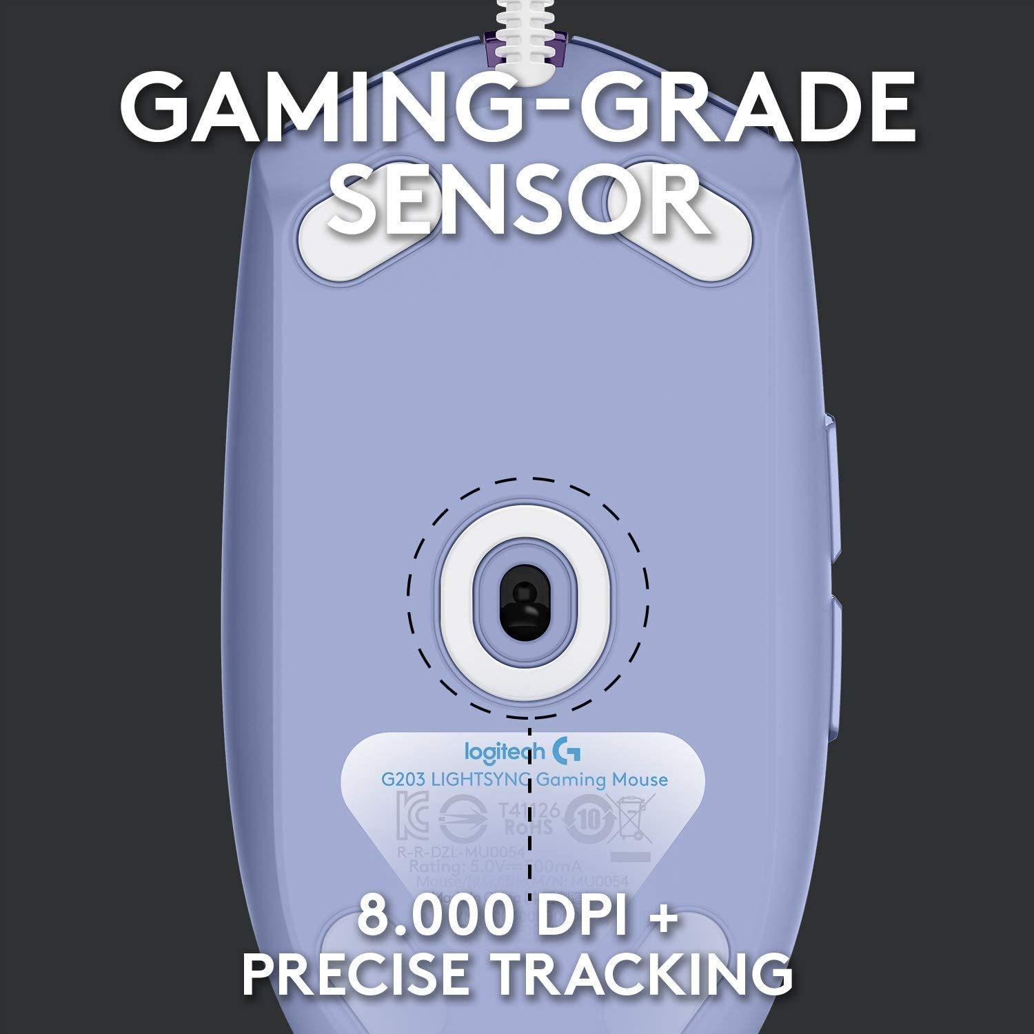 G203 LIGHTSYNC is ready to play with an 8,000 DPI sensor and customizable, vibrant LIGHTSYNC RGB. LIGHTSYNC RGB can be customized with color wave effects or patterns across ~16.8 million colors to suit your play style, setup, and mood. \* A classic 6-button design gets you right into the game and can be programmed to simplify tasks. G203 is designed to maximize the fun in your game.\* LIGHTSYNC RGB can be customized with color wave effects or patterns across ~16.8 million colors to suit your play style, setup, and mood.*Features:** 8,000 DPI gaming-grade sensor responds precisely to movements. Customize your sensitivity settings to suit the sensitivity you like with Logitech G HUB gaming software and cycle easily through up to 5 DPI settings.* Play in color with our most vibrant LIGHTSYNC RGB featuring color wave effects customizable across ~16.8 million colors. Install Logitech G HUB software to choose from preset colors and animations or make your own. Game-driven, audio visualization and screen mapping options are also available.* Play comfortably and with total control. The classic and simple 6-button layout and classic gaming shape is a comfortable time-tested and loved design. Each button can be customized using Logitech G HUB software to simplify tasks.* Primary buttons are mechanical and tensioned with durable metal springs for reliability, performance and excellent feel. The crisp clicks and precise feedback delivers a great precision feel to maximize your fun in game.*Tech spec's:** LIGHTSYNC RGB lighting 6 programmable buttons* Resolution: 200 – 8,000 DPI* USB data format: 16 bits/axis* USB report rate: 1000 Hz (1ms)* Microprocessor: 32-bit ARM*System Requirements*Windows® 8, Windows 8.1, Windows 7 or Windows Vista®Powered USB portInternet connection and 100MB hard drive space (for optional software download)