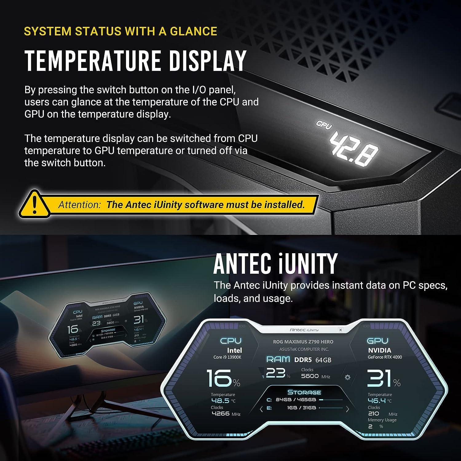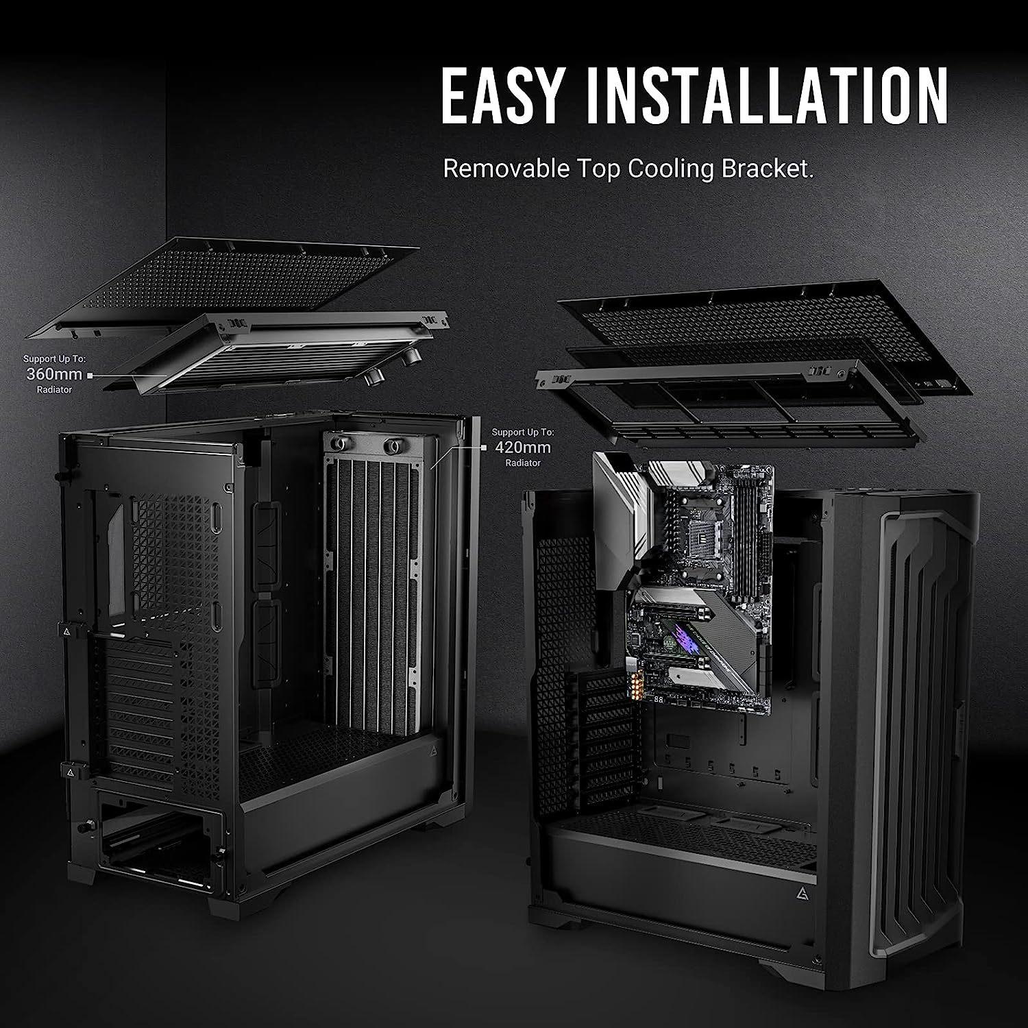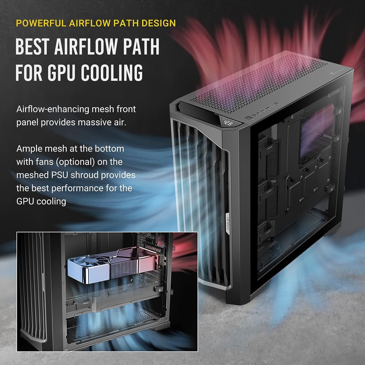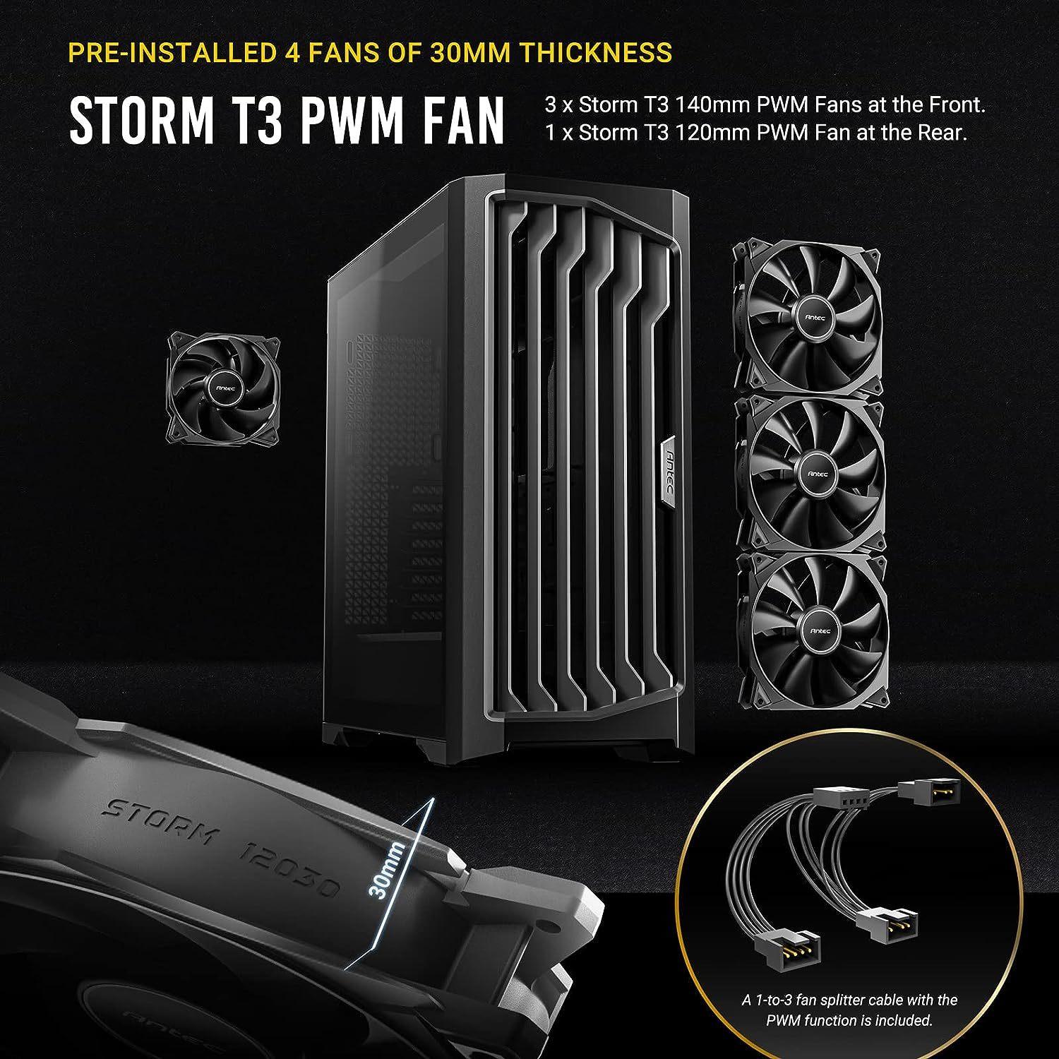 *System Status with a Glance** *Temperature Display:* By pressing the switch button on the I/O panel, users can glance at the temperature of the CPU and GPU on the temperature display. The temperature display can be switched from CPU temperature to GPU temperature or turned off via the switch button.* *I/O Panel* * Including the mainstream Type-C(10Gbps) port for high-speed transfer * Included dust plugs for dust prevention. * Mic/Audio 2-in-1 port.* *4mm Tempered Glass Side Panel:* Both side panels adopt tempered glass for better PC showcase visual effects.* *Cable Management on Point:* 2 cable covers are included for beautifying the cable management area.* *Ten sets of hook & loop straps for easy cable management:* * 1. Three sets of hook & loop straps for fan & I/O cable routing. * 2. Five hook & loop straps for hardware and power supply cables. * 3. Two hook & loop straps at the rear for rear I/O cable routing.* *Storm T3 PWM Fan:* The Storm T3 Fan of 30mm thickness comes with thicker and longer fan blades, efficiently increasing the air intake. The PWM function easily reaches the balance between cooling and silence.* *Exquisite Steel Mesh:* The mesh front panel adopts the 1.2mm vent holes and the magnetic & clip-on design with easy access.* *Best Airflow Path for GPU Cooling:* Airflow-enhancing mesh front panel provides massive air. Ample mesh at the bottom with fans (optional) on the meshed PSU shroud provides the best performance for the GPU cooling.* *Supports RTX 40 Series Graphics Cards:* Full-tower PC case in 230mm width supports the up-to-date 40 Series GPUs and high-end PC components.* *Best Cooling Design:* Support a 420mm radiator at the front. (When installing a 420mm radiator at the front, the radiator at the top must be less than 360mm.). Supports 360mm radiators at the front and top simultaneously. Up to 10 fans simultaneously.*Technical Specifications** *Main Specs* * *_Dimensions:_* 522 × 230 × 522 mm (DWH) * *_Form Factor:_* Full Tower * *_Materials:_* Steel + Plastic + Glass * *_Mainboard Support:_* E-ATX, ATX, Micro-ATX, ITX * *_Front Access & Controls:_* Power, Reset , USB 3.0 × 2, Type-C 10Gbps x 1, Headphone/Mic Combo Jack, Temp. Display Switch x 1 * *_Side Panel:_* 4mm Tempered Glass(Both Sides)* *Drive Bays* * *_Expansion Slots:_* 8 * *_3.5" / 2.5":_* 2/2 * *_2.5":_* 3* *Fan Support* * *_Front:_* 3 × 120mm / 3 X 140mm * *_Top:_* 3 × 120mm / 3 × 140mm * *_Power Supply Shroud:_* 3 × 120mm * *_Rear:_* 1 × 120mm * *_Included Fan(s):_* 3 × 140 × 30mm PWM fans in front + 1 × 120 × 30mm PWM fan in rear, Pre-installed Storm T3 PWM fan specs vary from the retail version* *Radiator Support* * *_Front:_* 120 / 140 / 240 / 280 / 360 / 420mm * *_Top:_* 120 / 140 / 240 / 280 / 360mm * *_Rear:_* 120mm* *Clearance* * *_Max GPU Length:_* ≤ 400mm * *_Max CPU Cooler Height:_* ≤ 175mm * *_Max PSU Length:_* (Include cable) ≤ 245mm(with HDD), (Include cable) ≤ 440mm(without HDD)* *Miscellaneous* * *_Dust Filter:_* Front/Top/Bottom * *_Net Weight:_* 12.55Kgs * *_Gross Weight:_* 14.85Kgs
