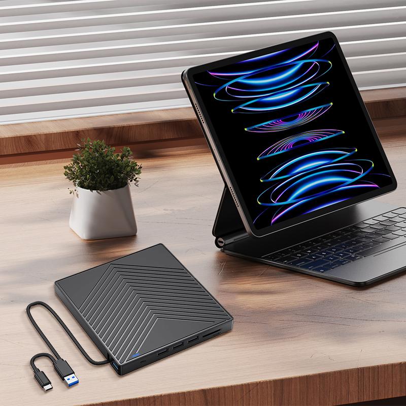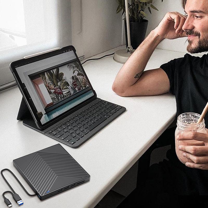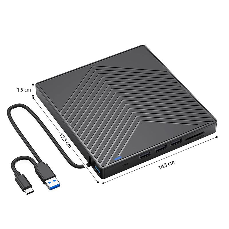 *_CD DVD Drive, Ultra Slim CD Burner USB 3.0 with 4 USB Ports and 2 TF/SD Card Slots_**_Experience the ultimate convenience_*Designed for laptops and desktops without built-in CD/DVD drives, this multifunctional external drive allows you to listen to music, watch movies, back up data, and install software effortlessly. Featuring plug-and-play functionality, you won’t need any additional drivers to get started. With strong error correction and anti-skid capabilities, this CD ROM external drive ensures quiet operation while you work.*_Features:_**_External CD Drive for Laptops:_*Ideal for modern laptops lacking built-in CD/DVD drives, this external drive allows you to enjoy your favourite CDs and DVDs without hassle.*_USB 3.0 High-Speed Data Transfer:_*Enjoy lightning-fast data transfer rates of up to 5 Gigabits per second with USB 3.0 technology. Backward compatible with USB 2.0 and 1.1, it offers Max 8× DVDR Read Speed and Max 24× CD Write/Read speed.*_Support for CD & DVD Burning:_*This optical drive supports a wide range of formats including CD±R/RW, DVD±R/RW, and DVD-RAM. Compatible with devices such as MacBook, iMac, notebooks, desktops, and laptops, it works seamlessly with Windows 11/10/8/7/XP and Mac OS 10.6 or above.*_8-in-1 USB Hub:_*More than just a CD/DVD drive, this device doubles as a USB hub with 1 USB 3.0 port, 3 USB 2.0 ports, 1 TF slot, 1 SD card slot, and 1 USB-C port (Used to supply power when power is insufficient), making it versatile for connecting various peripherals.*_Ultra Slim & Portable Design:_*Lightweight and compact, this external disk drive features an embedded data cable for easy organization and a skip-proof rubber pad to prevent sliding. Perfect for home, office, or on the go.*_Specifications:_**_Colour:_* Black*_Material:_* ABS*_Power Supply:_* USB port plug-in*_Input:_* DC5V*_Output:_* DC5V*_Voltage:_* 2V1a*_Package Size:_* 16.5 × 16.5 × 2.5 cm*_Weight:_* 0.35 kg*_Package Contents:_*1 x CD DVD Drive1 x USB Cable1 x User Manual
