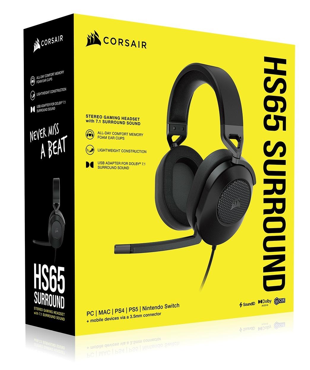 The CORSAIR HS65 SURROUND Gaming Headset delivers all-day comfort and sound with memory foam leatherette ear pads, lightweight aluminium-reinforced construction, and Dolby Audio 7.1 surround sound on PC and Mac.*SOUND PERFECTED FOR YOU*Get the best listening experience in gaming and music on HS65 SURROUND with SoundID from Sonarworks. Integrated into CORSAIR iCUE software, SoundID easily customizes the audio profile of the gaming headset to fit your unique hearing preferences. No more messing with complex sliders, simply take an intuitive preference test to create your perfect sound profile.*READY TO GAME*HS65 SURROUND is made from premium materials for long-lasting comfort, reinforced with metal construction and details for a quality look and feel while weighing in at only 282g.*PLUSH COMFORT*Adjustable headband with breathable microfiber and leatherette-wrapped memory foam ear pads.*PREMIUM MATERIALS*Durable metal construction and soft-touch exterior.*INTUITIVE CONTROL*On-ear volume roller and flip-to-mute mic to put control within easy reach.*IMMERSIVE SURROUND AUDIO*High-quality, custom-tuned 50mm neodymium audio drivers deliver excellent sound with the range needed to hear everything on the battlefield. The included USB adapter enables multi-channel Dolby Audio 7.1 surround sound\*, putting you right in the middle of your game.\*Dolby Audio is only available using CORSAIR iCUE software on PC and Mac*CRYSTAL-CLEAR COMMUNICATION*Captures your voice with terrific clarity thanks to an omni-directional microphone with a flip-to-mute function, Discord Certified for crystal-clear communication and outstanding sound.*CONNECT TO VIRTUALLY ANY DEVICE*Use the included USB adapter to enable SoundID and Dolby Audio 7.1 surround sound and access other features via CORSAIR iCUE software on PC or Mac. Alternatively, use the 3.5mm jack to easily plug into PC, console, or mobile devices to quickly get into the game.*EFFORTLESS CONTROL*Powerful CORSAIR iCUE software enables custom audio equalizer settings, SoundID personalized audio, Dolby Audio 7.1 surround sound, and more.Tech Specs:Audio CUE Software – YesSurround Sound – YesDetachable Microphone – NoRechargble Battery – NoWeight – 0.282Headset Frequency Response – 20Hz – 20 kHzHeadset Battery Life – N/AHeadphone Sensitivity – 114dB (+/-3dB)Headset Wireless Range – N/AImpedance – 32k Ohms @ 1 kHzHeadset Type – WiredHeadset Drivers – 50mmCable Length – 1.8mColor – BlackAudio – Dolby AudioLighting – NonePlatform – PC, Mac, PlayStation 4/5, Xbox One / Series X S, Nintendo Switch, Mobile devicesMicrophone Impedance – 2.2k OhmsMicrophone Type – Omni-directionalMicrophone Frequency Response – 100Hz to 10kHzMicrophone Sensitivity – –41dB (+/-3dB)View our Headphones Return Policy [Here](https://help.mightyape.co.nz/hc/en-nz/articles/115012111088-Returns-Policy)