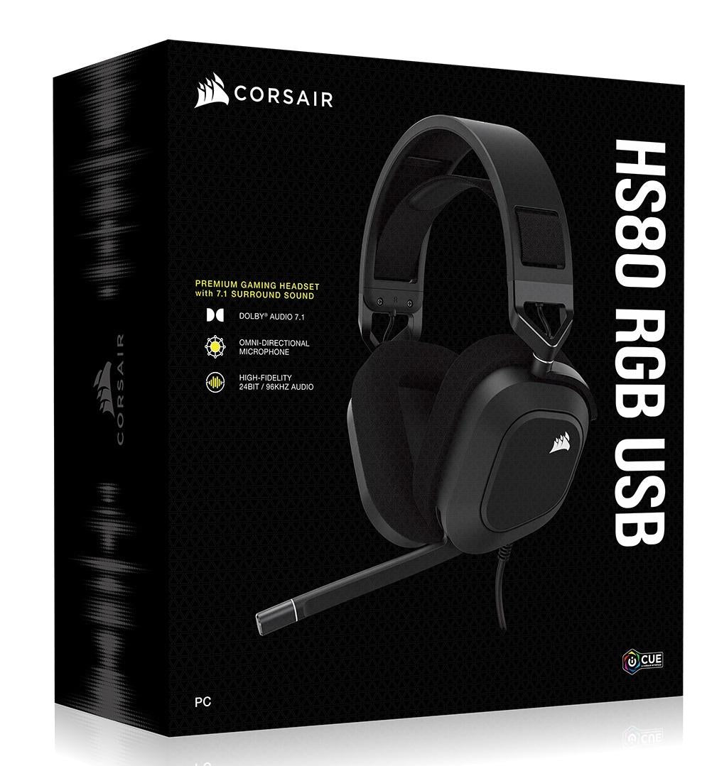 The CORSAIR HS80 RGB USB Gaming Headset delivers incredibly detailed sound through custom-tuned 50mm neodymium audio drivers. Dolby Audio 7.1 surround sound puts you in the middle of the action, while a broadcast-grade omni-directional microphone captures your voice with outstanding clarity. Play in plush comfort with memory foam earpads and a stress-free floating headband design, with years of durability thanks to sturdy construction reinforced with aluminium.A USB wired connection offers high-fidelity 24bit/96kHz sound. Powerful CORSAIR iCUE software enables in-depth customization of audio settings and RGB lighting, letting you hear every shot, step, and shout like never before.Features:* Live the Game: The HS80 RGB USB merges iconic CORSAIR design, superb sound, and trusted build quality.* Dolby Audio 7.1 Surround Sound: Brings your game to life, putting you directly in the middle of the action.* Catch Every Sound: From a faint whisper to a resonating blast, a pair of custom-tuned 50mm high-density neodymium audio drivers deliver sound in exquisite detail with a massive frequency range of 20Hz-40,000Hz.* Hours of Long-Lasting Plush Comfort: Equipped with memory foam earpads with a breathable microfiber cloth exterior and a stress-free adjustable floating headband design.* Broadcast-Grade Omni-Directional Microphone: Captures your voice with the utmost clarity, with a flip-up mute function and a built-in LED mute indicator.* High-Fidelity 24bit/96kHz Sound: Experience true high-fidelity audio over a USB wired connection.* Durable Construction: Reinforced with aluminium to withstand years of competitive gaming.* On-Ear Volume and Mute Controls: Enable on-the-fly adjustments to your audio without pulling you out of the game.* Dynamic RGB Lighting: Customize your look with a near-limitless array of colors.* Powerful CORSAIR iCUE Software: Enables sidetone control, RGB lighting synchronization with compatible CORSAIR devices throughout your setup, and more.Tech Specs:*Headphones*Frequency Response: 20Hz – 40 kHzImpedance: 32 Ohms @ 1kHzSensitivity: 116 dB (± 3 dB)Drivers: Custom 50mm Neodymium*Microphone*Type: Omnidirectional broadcast-gradeImpedance: 2.2k OhmsFrequency Response: 100Hz – 10kHzSensitivity: –40 dB (± 3 dB)Included:* CORSAIR HS80 RGB USB Headset* Quick Start Guide* Warranty CardView our Headphones Return Policy [Here](https://help.mightyape.co.nz/hc/en-nz/articles/115012111088-Returns-Policy)