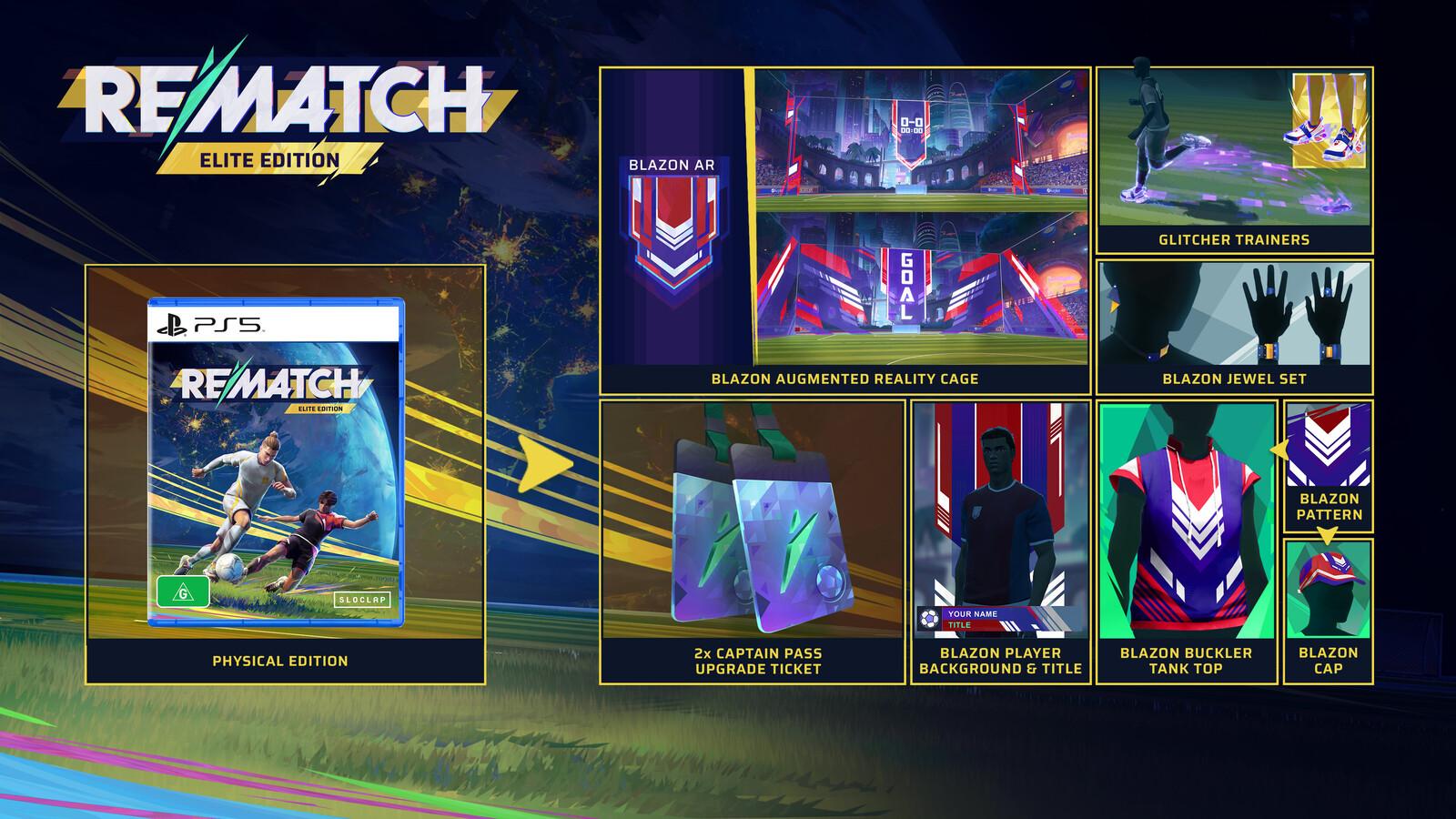 *Make Your Mark*Step onto the pitch from a fresh perspective with the physical edition of Rematch. Take control in fast-paced 5v5 football where every move counts. Feel like a true athlete, rise with your team, and unlock the full Elite Edition game.*Content:** Base game* 2 x Captain Pass Upgrade Ticket – Double the rewards, double the swag.* Blazon Player Background & Title – Showcase your identity with an epic design that makes a statement as unique as you are.* Blazon Buckler Tank Top – Classic tank top rebellion with blazon elegance, crafted for those who show their strength and shape their destiny with every match.* Blazon Pattern (for Top & Bottom clothes) – Infuse your outfit with a seamless epic design that truly reflects your unique identity—perfect for those who want their style to tell their story.* Blazon Jewel Set – Crafted from folded leather, each piece designed to shine on and off the field.* Glitcher Trainers – Step into the future with every stride. Who says errors can't be aesthetic?* Blazon Augmented Reality Cage – Brings each match to life with a vibrant blazon display that celebrates every goal.* Blazon Cap – It's more than just a cap—it's a declaration of status, identity, and conviction.*A new perspective on football*_Third person action_ – Tackle, dribble, aim, and shoot; dive into the heart of the action from an immersive viewpoint._One player control_ – Observe the action, position yourself, execute perfectly: every decision matters, and relying on your teammates is essential to prevail._Skill-based gameplay_ – In a level playing field, with no player stats, victory is only about player skill and tactical coordination.*Intense action & deep tactics*_Credible football, with an arcade twist_ – Feel like an amazing athlete, easily performing all the iconic moves of football._Non-stop action_ – No fouls, no offsides, no pauses… no time to rest._Accessible mechanics with a lot of depth_ – Just like real football, winning requires both accuracy, fast reactions as well as flawless team collaboration.*An online team-based experience*_Team-based online gameplay_ – Designed from the ground up as an online multiplayer experience, Rematch offers split-second gameplay response that always feels fair._Competitive modes_ – Challenge yourself and your mates to reach the top leagues._Seasonal content_ – There’s always something new around the corner. Seasons will bring fresh content — whether it’s a new game mode, player customisation, AR environments, or something else entirely.