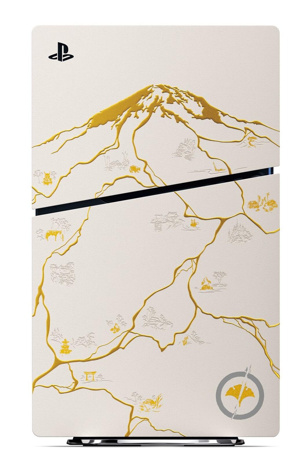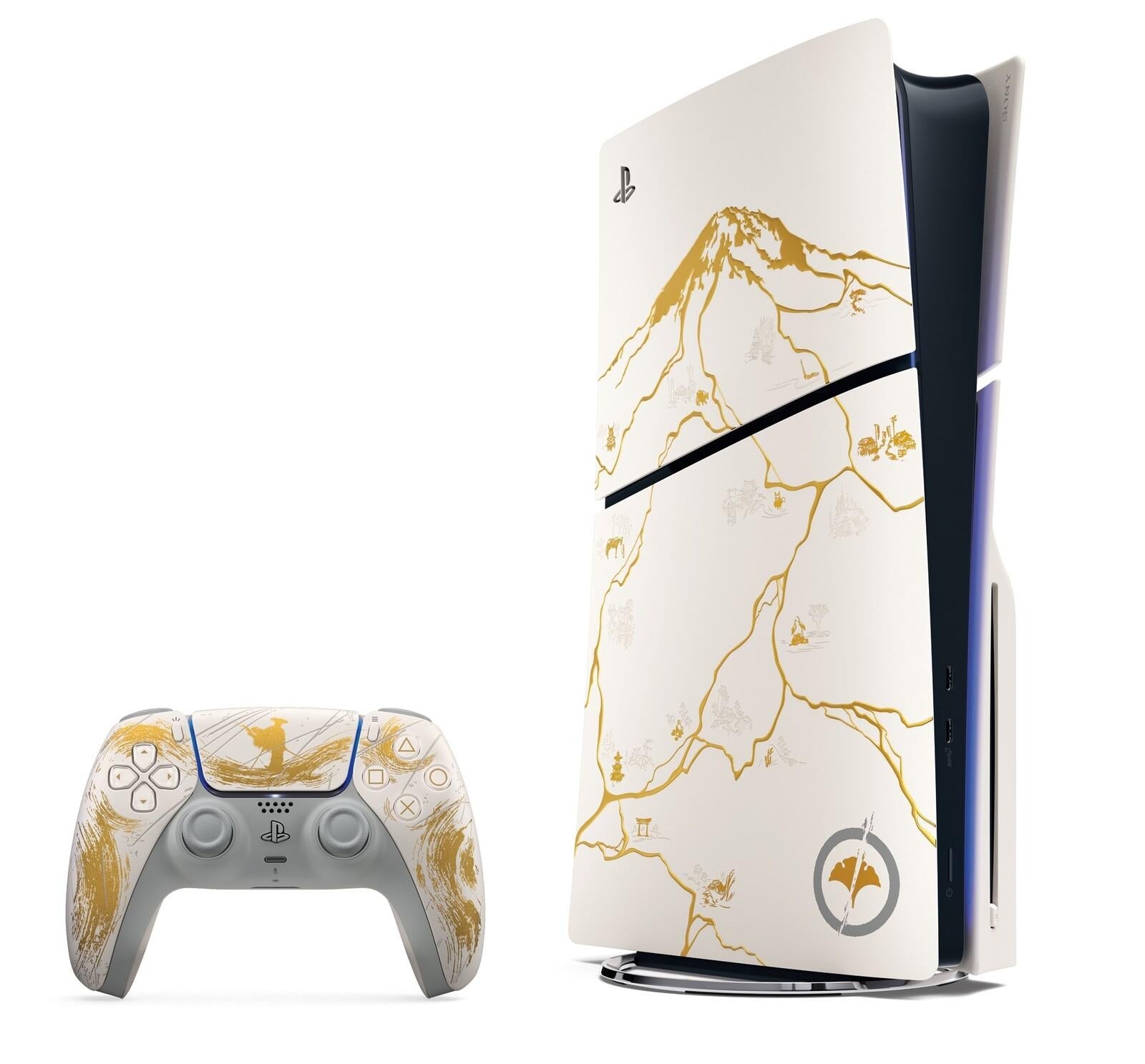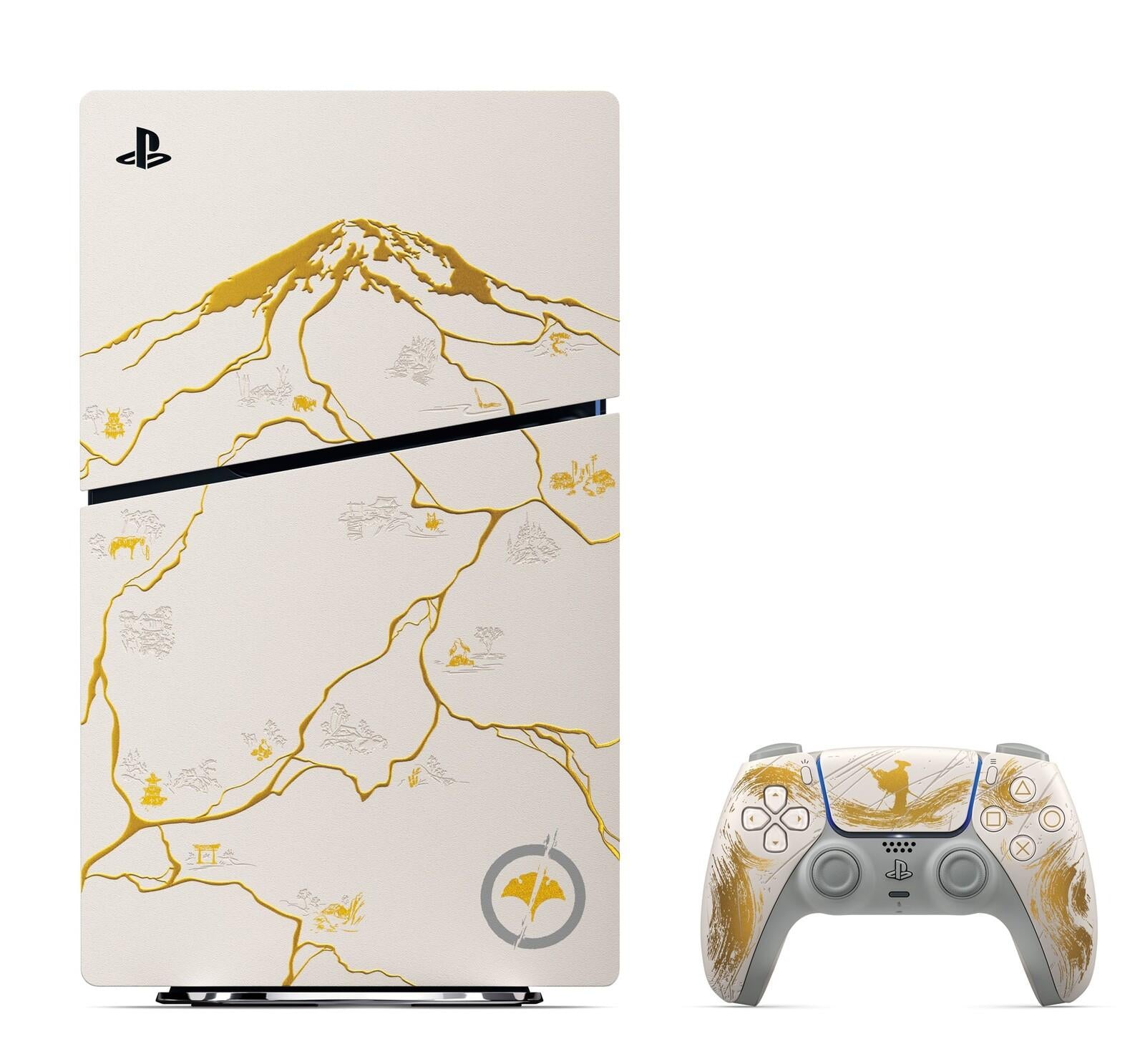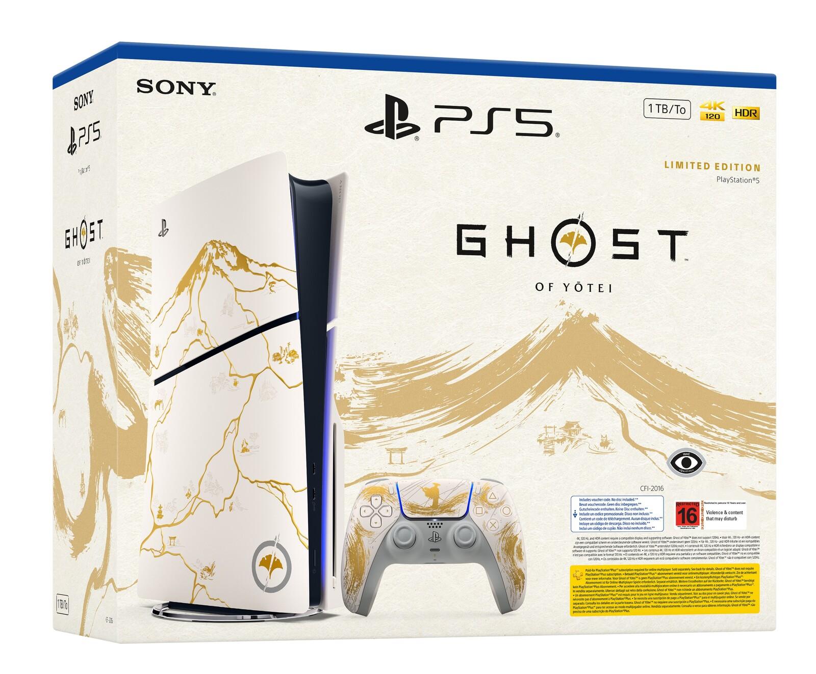 *Same immersive power. New slimmer size. The same features, packed into a form factor 30% smaller.*PS5 Console Ghost of Yōtei Gold Limited Edition Bundle includes:* Limited Edition PS5 console (Vertical stand sold separately)* Limited Edition DualSense wireless controller* Ghost of Yōtei full game voucher^ (includes pre-order digital content)* 1TB SSD* Disc Drive (attached to console)* 2 Horizontal Stand Feet* HDMI cable* USB cable* AC power cord* Printed materials* ASTRO’s PLAYROOM (Pre-installed game)^Account for PlayStation Network and internet connection required to redeem voucher.Discover a bold, new story of a warrior in Japan who is on a mission of vengeance all her own.Set 300 years after the critically acclaimed Ghost of Tsushima, Ghost of Yōtei is a standalone experience set in 1600s rural Japan. The story follows a haunted, lone mercenary named Atsu. Thirsty for revenge, she travels through the beautiful, rugged landscapes of northern Japan, hunting those who killed her family many years earlier.Sixteen years after her family’s death, Atsu's quest across Ezo brings her to unexplored lands in search of a gang of six outlaws, but she finds much more than vengeance.Throughout her journey, Atsu will discover unlikely allies, and greater bonds than she could have imagined.Experience lightning-fast loading with an ultra-high-speed SSD, deeper immersion with support for haptic feedback, adaptive triggers and 3D Audio, and an all-new generation of incredible PlayStation games. Keep your favorite games ready and waiting for you to jump in and play with 1TB of SSD storage built in.^^^*Ultra-High Speed SSD*Maximize your play sessions with near instant load times for installed PS5 games.*Integrated I/O*The custom integration of the PS5 console's systems lets creators pull data from the SSD so quickly that they can design games in ways never before possible.*Up to 120fps with 120Hz output*Enjoy smooth and fluid high frame rate gameplay at up to 120fps for compatible games, with support for 120Hz output on 4K displays*HDR Technology*With an HDR TV, supported PS5 games display an unbelievably vibrant and lifelike range of colors.*Tempest 3D AudioTech*Immerse yourself in soundscapes where it feels as if the sound comes from every direction. Your surroundings truly come alive with Tempest 3D AudioTech^^ in supported games.*Haptic Feedback*Experience haptic feedback via the DualSense wireless controller in select PS5 titles and feel the effects and impact of your in-game actions through dynamic sensory feedback.*Adaptive Triggers*Get to grips with immersive adaptive triggers, featuring dynamic resistance levels which simulate the physical impact of in-game activities in select PS5 games.*Includes ASTRO’S Playroom*Explore four worlds, each one showcasing innovative gameplay using the versatile features of the DualSense wireless controller, in this game included for all PS5 console users.*Backwards Compatibility & Game Boost*The PS5 console can play over 4,000 PS4 games. With the Game Boost feature, you can even enjoy faster and smoother frame rates in some of the PS4 console’s greatest games.*Vertical stand sold separately*^PS5 console (CFI-2000 model group – slim)^^3D audio via built-in TV speakers or analog/USB stereo headphones. Set up and latest system software update required.^^^A portion of the SSD is reserved for system software and other functions so the available SSD capacity may vary.^^^^Internet connection required to pair Disc Drive and PS5 console upon setup