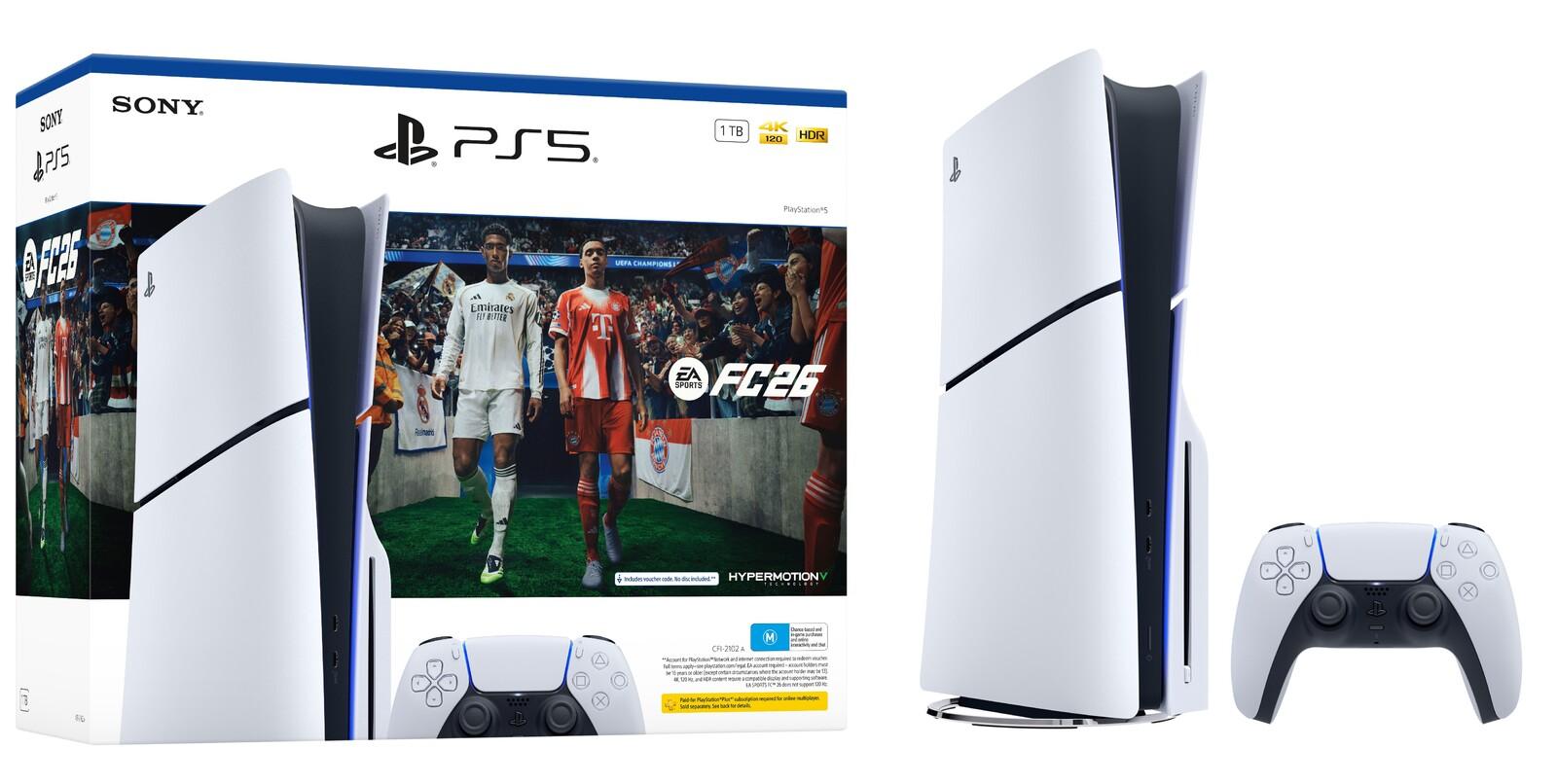 *Same immersive power. New slimmer size. The same features, packed into a form factor 30% smaller.*Includes:* EA SPORTS FC 26 full-game voucher^^^^^* 1 x DualSense wireless controller* 1TB SSD* Disc Drive^^^^* 2 Horizontal Stand Feet* HDMI cable* AC power cord* USB cable* Printed materials* ASTRO’s PLAYROOM (Pre-installed game)Experience lightning-fast loading with an ultra-high-speed SSD, deeper immersion with support for haptic feedback, adaptive triggers and 3D Audio, and an all-new generation of incredible PlayStation games. Keep your favorite games ready and waiting for you to jump in and play with 1TB of SSD storage built in.^^^*Ultra-High Speed SSD*Maximize your play sessions with near instant load times for installed PS5 games.*Integrated I/O*The custom integration of the PS5 console's systems lets creators pull data from the SSD so quickly that they can design games in ways never before possible.*Up to 120fps with 120Hz output*Enjoy smooth and fluid high frame rate gameplay at up to 120fps for compatible games, with support for 120Hz output on 4K displays*HDR Technology*With an HDR TV, supported PS5 games display an unbelievably vibrant and lifelike range of colors.*Tempest 3D AudioTech*Immerse yourself in soundscapes where it feels as if the sound comes from every direction. Your surroundings truly come alive with Tempest 3D AudioTech^^ in supported games.*Haptic Feedback*Experience haptic feedback via the DualSense wireless controller in select PS5 titles and feel the effects and impact of your in-game actions through dynamic sensory feedback.*Adaptive Triggers*Get to grips with immersive adaptive triggers, featuring dynamic resistance levels which simulate the physical impact of in-game activities in select PS5 games.*Includes ASTRO’S Playroom*Explore four worlds, each one showcasing innovative gameplay using the versatile features of the DualSense wireless controller, in this game included for all PS5 console users.*Backwards Compatibility & Game Boost*The PS5 console can play over 4,000 PS4 games. With the Game Boost feature, you can even enjoy faster and smoother frame rates in some of the PS4 console’s greatest games.*Vertical stand sold separately*^PS5 console (CFI-2000 model group – slim)^^3D audio via built-in TV speakers or analog/USB stereo headphones. Set up and latest system software update required.^^^A portion of the SSD is reserved for system software and other functions so the available SSD capacity may vary.^^^^Internet connection required to pair Disc Drive and PS5 console upon setup^^^^^Account for PlayStation and internet connection required to redeem voucher.*EA Sports FC 26*The Club is Yours in EA SPORTS FC 26.Play your way with an overhauled gameplay experience powered by feedback from the FC Community. The new Authentic Gameplay preset delivers our most true-to-football experience ever in Career, while the Competitive Gameplay preset—driven by refined fundamentals, added consistency, and enhanced responsiveness—is tailor-made for play in Football Ultimate Team and Clubs.Put your dream squad to the test in Football Ultimate Team with Tournaments and Live Events, as well as a refreshed Rivals and Champs experience. Tournaments will test your skills with up to four rounds of knockout football, while Live Events add more variety with themed competitions and content all season long. New Bounties allow you to earn additional rewards or accelerate your weekly progress. Additionally, EA SPORTS FC 26 launches a new second-tier weekend competition, Challengers, designed for players in lower Divisions.Experience Manager Career like never before with all-new Manager Live Challenges. Take on a variety of real-world scenarios and alternative storylines throughout the new season—ranging from a few minutes of play to multiple seasons—and earn rewards including Season Points, Vanity, and ICONs and Heroes to use in modern-day clubs. Additionally, for the first time ever, movement in the Manager Market sees team tactics transform over time as new managers take the helm, changing the dynamics of every new season. Plus, experience unexpected events throughout your Career, managing short and long-term matters which shape the future of your club.Archetypes inspired by greats of the game introduce new classes to Clubs and Player Career, bringing even more individuality to your player customisation and progression. Develop your abilities throughout the season by upgrading attributes and unlocking new Archetype Perks to give your player a distinct feel on the pitch.Play solo or with Clubmates in Clubs Rush Live Events, introducing a range of exciting new knockout Tournaments to Clubs in EA SPORTS FC 26. With varying entry requirements and gameplay rules, Tournaments deliver fresh experiences with new objectives and exciting rewards throughout the season—connecting Clubs to ongoing campaigns across EA SPORTS FC 26.Experience unrivalled authenticity in EA SPORTS FC 26, featuring 20,000+ players across 750+ clubs and national teams, in over 120+ stadiums and 35+ leagues. EA SPORTS FC 26 is the only place you can play the iconic UEFA Champions League, UEFA Europa League, UEFA Europa Conference League, CONMEBOL Libertadores, Premier League, Bundesliga, and LALIGA EA SPORTS in the same game, alongside the Google Pixel Frauen-Bundesliga, Liga F Moeve, Barclays Women’s Super League, Arkema Premiere Ligue, National Women's Soccer League, and the UEFA Women's Champions League.