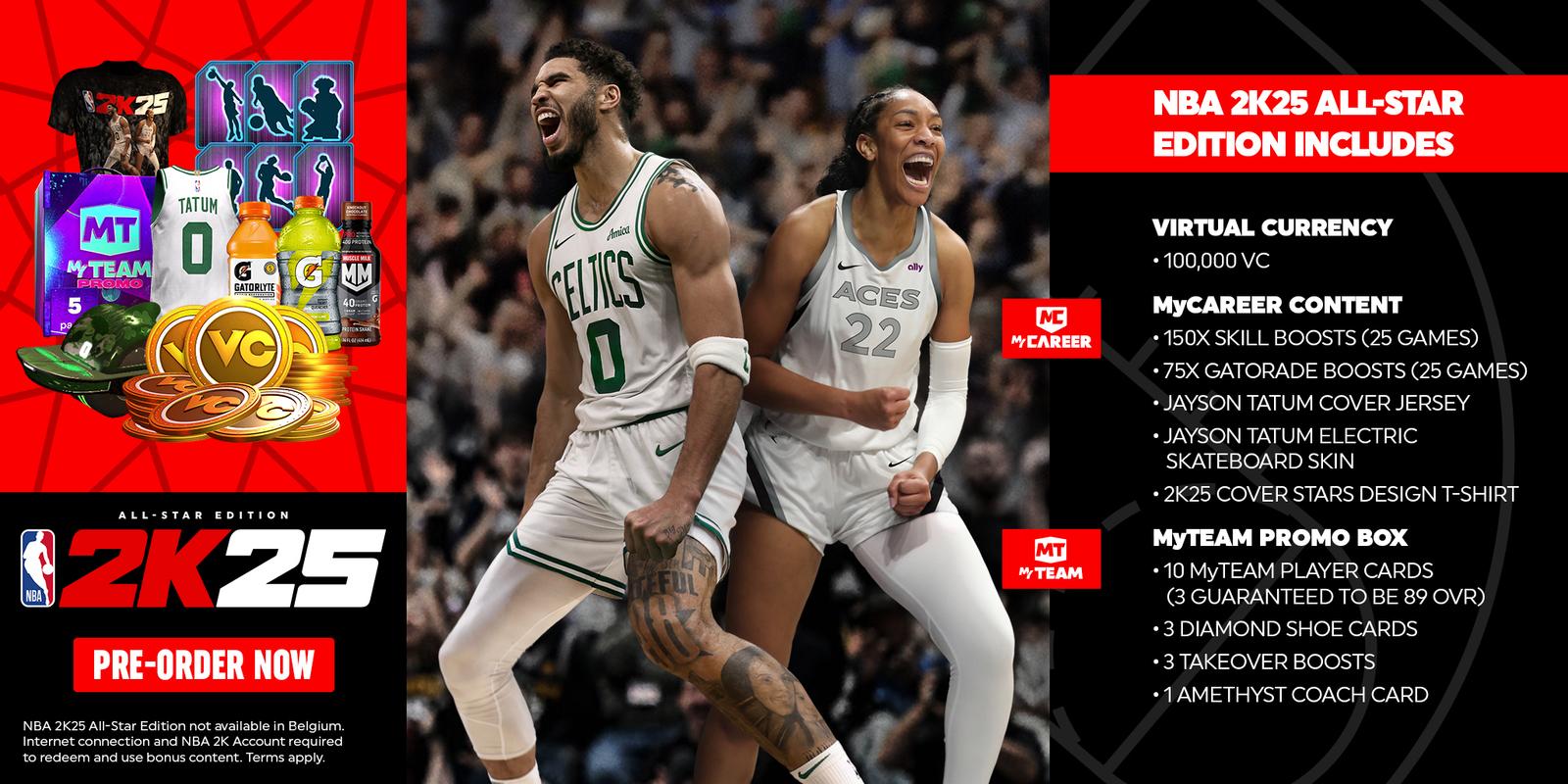 NBA 2K25 All-Star Edition includes:* Virtual Currency – 100,000 VC* MyCAREER Content: * 150× Skill Boosts (25 Games) * 75× Gatorade Boosts (25 Games) * Jayson Tatum Cover Jersey * Jayson Tatum Electric Skateboard Skin * 2K25 Cover Stars Design T-Shirt* MyTEAM Promo Box: * 10 MyTEAM Player Cards (3 guaranteed to be 89 OVR) * 3 Diamond Shoe Cards * 3 Takeover Boosts * 1 Amethyst Coach CardStack wins, raise banners, and make history in NBA 2K25. Command every court with authenticity and realism Powered by ProPLAY, giving you ultimate control over how you compete. Play anywhere, as you define your legacy in MyCAREER, MyTEAM, MyNBA, and The W. Express your personality with an extensive array of customization options and explore an all-new City, where opportunity awaits behind every door.*POWERED BY ProPLAY*Bring your game to life with ProPLAY, immersive technology that directly translates NBA footage into engaging gameplay. Get up close and personal with your favorite NBA superstars and immerse yourself in clutch moments, as ProPLAY powers the most authentic NBA experience to date.*COMPETE IN THE CITY*The City is the ultimate proving ground; hit the park for some competitive streetball fun and compete at various new venues. Pay homage to legends of the game in MyCAREER as you eclipse their milestone achievements and usher in the greatest dynasty basketball has ever seen. Let your talents shine in a bustling City and etch your name among the greats.*BUILD YOUR DYNASTY*Build a dynasty that transcends eras and redefine what it means to be the best as a General Manager in MyNBA. Explore the unique challenges that come with overseeing an NBA front office and cherish the ultimate reward of winning a championship, or multiple. Choose from six Eras, including an all-new Era, and become the next mastermind to change the game forever.*YOUR MyTEAM, YOUR WAY*Competition thrives in MyTEAM. Challenge rival lineups with your all-time MyTEAM roster, and clash with other elite players in the weekly King of the Court. Go head-to-head and showcase why you deserve to be crowned the best of the best in this exclusive event. Collect new cards, master the fundamentals, and earn great rewards. The goal is winning, but where will you start?*BECOME A WNBA LEGEND*Strive for G.O.A.T. status in The W and create legendary moments throughout the course of your career. Honor all-time players past and present as you ascend to the highest tier and etch your name in the record books. Lead the next generation of WNBA stars and take on world-class talent in The W Online.Play Now, MyNBA, and The W are available offline. All other game modes and features require Internet connection and may require online account registration (varies 13+).