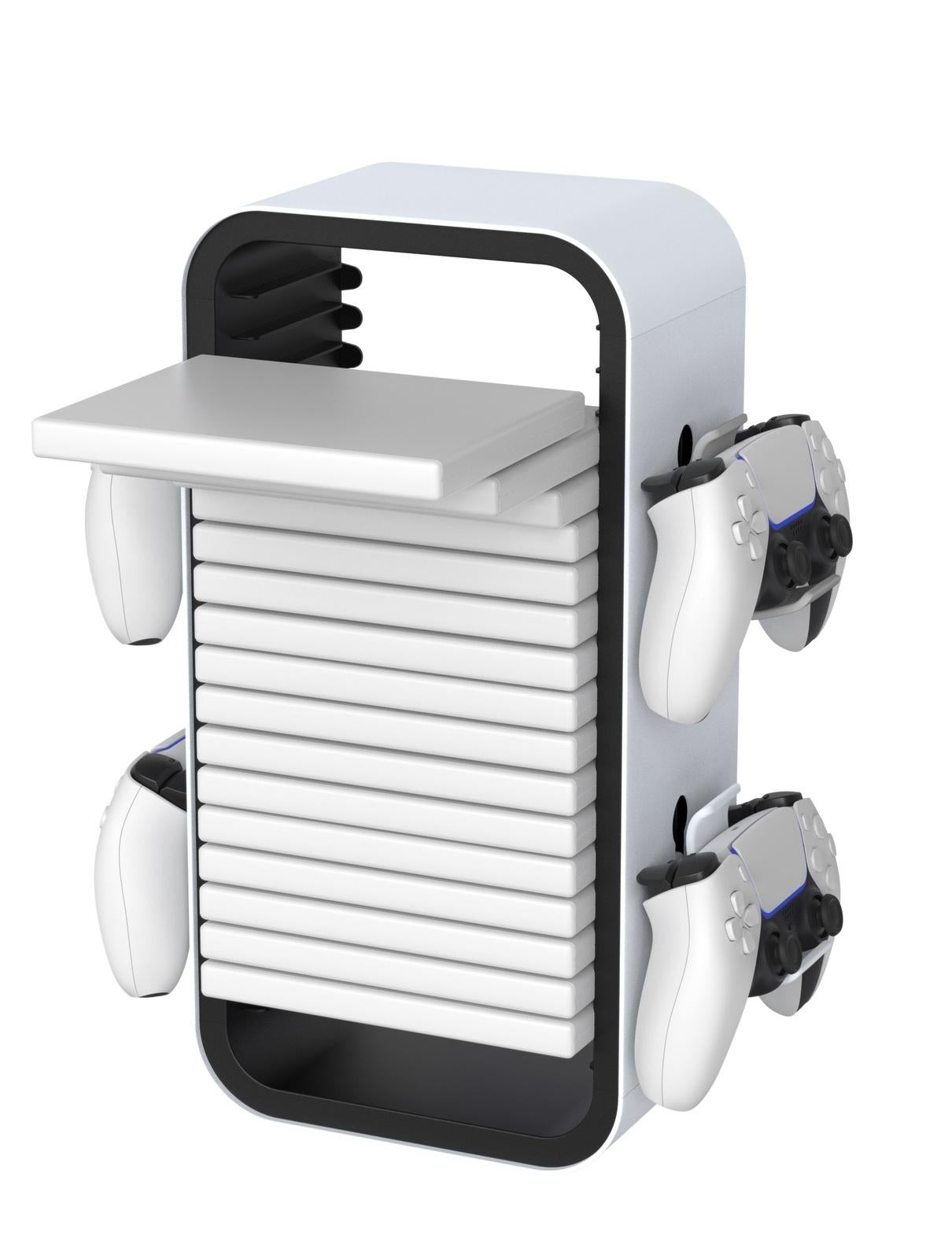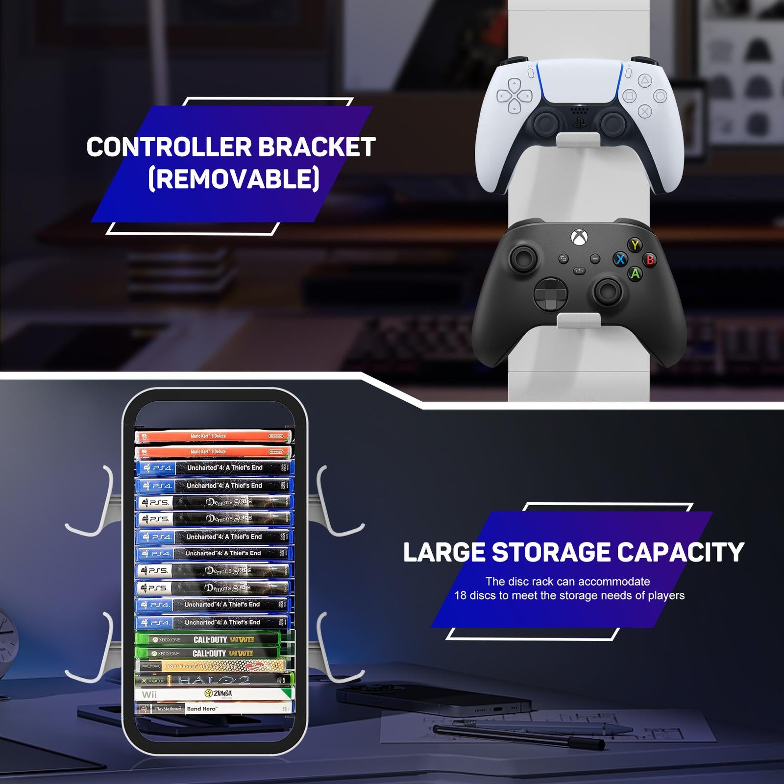 *NOTE – GAMES, HEADSET, CONTROLLERS AND OTHER ACCESSORIES NOT INCLUDED.*GAME DISC RACK: Holds up to 18 Games, will help you saves pace and display your favourite game discs.CONTROLLER HOLDER: Can hold up to 4 controllers such as the Switch Pro controller, PS5/ PS4 controller, XBOX One / Series X controller.UNIQUE DESIGN: The modern curved edge design blends into any home or game room and catches attention.VERY COMPATIBLE: Controller holders can be used for PS5, PS4, Switch Pro, XBOX controllers & middle slots are compatible with PS5, PS4, Switch, XBOX Series game discs and Movies.STURDY STRUCTURE: Made of premium ABS plastic, it’s sturdy structure ensures that all your favourite game discs and game controllers stay firmly in place without risk of falling.MATERIAL: ABS plasticDIMENSIONS: 33cm_40cm_12cm