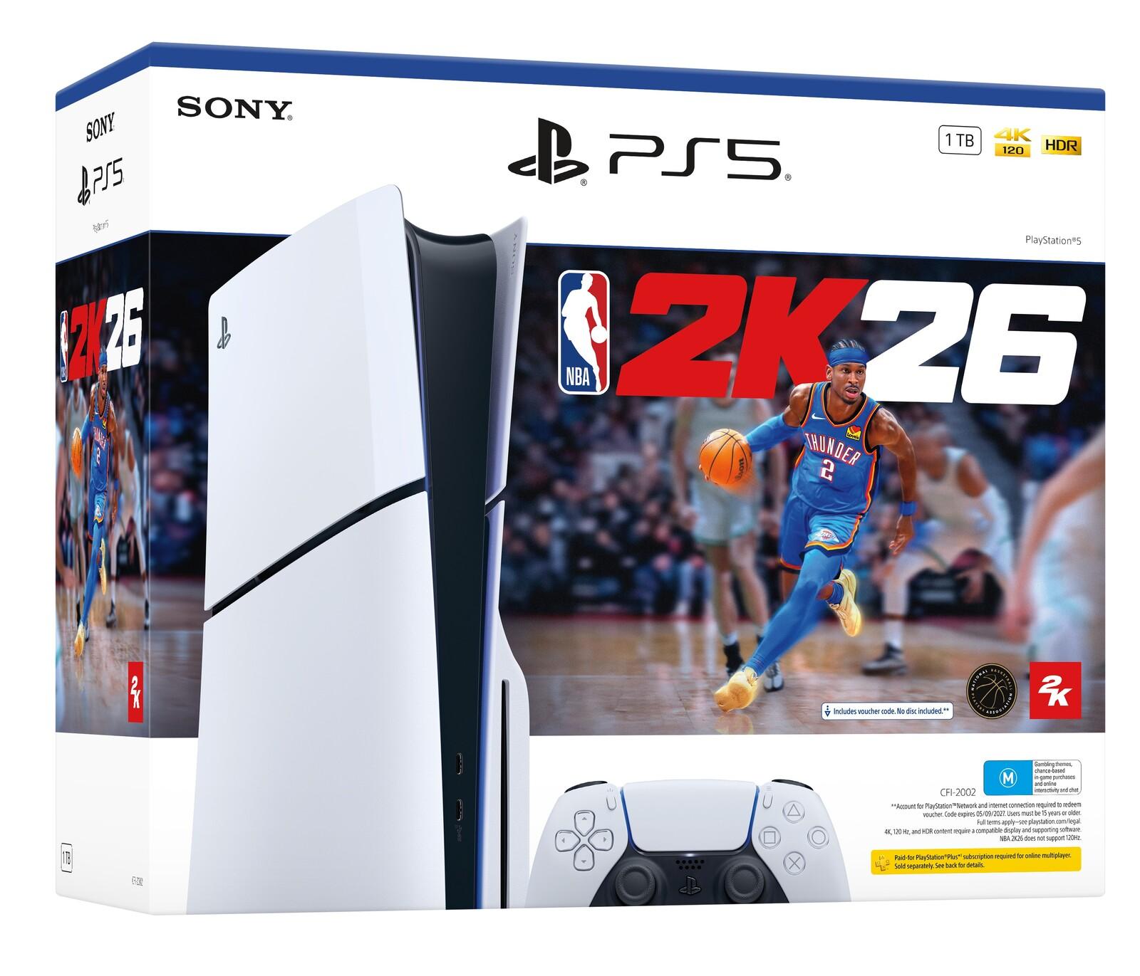 *Same immersive power. New slimmer size. The same features, packed into a form factor 30% smaller.*Includes:* NBA 2K26 full-game voucher^* 1 x DualSense wireless controller* 1TB SSD* Disc Drive^^^^* 2 Horizontal Stand Feet* HDMI cable* AC power cord* USB cable* ASTRO’s PLAYROOM (Pre-installed game)\*Account for PlayStation Network and internet connection required to redeem voucher.Experience lightning-fast loading with an ultra-high-speed SSD, deeper immersion with support for haptic feedback, adaptive triggers and 3D Audio, and an all-new generation of incredible PlayStation games. Keep your favorite games ready and waiting for you to jump in and play with 1TB of SSD storage built in.\*\*\**Ultra-High Speed SSD*Maximize your play sessions with near instant load times for installed PS5 games.*Integrated I/O*The custom integration of the PS5 console's systems lets creators pull data from the SSD so quickly that they can design games in ways never before possible.*Up to 120fps with 120Hz output*Enjoy smooth and fluid high frame rate gameplay at up to 120fps for compatible games, with support for 120Hz output on 4K displays*HDR Technology*With an HDR TV, supported PS5 games display an unbelievably vibrant and lifelike range of colors.*Tempest 3D AudioTech*Immerse yourself in soundscapes where it feels as if the sound comes from every direction. Your surroundings truly come alive with Tempest 3D AudioTech^^ in supported games.*Haptic Feedback*Experience haptic feedback via the DualSense wireless controller in select PS5 titles and feel the effects and impact of your in-game actions through dynamic sensory feedback.*Adaptive Triggers*Get to grips with immersive adaptive triggers, featuring dynamic resistance levels which simulate the physical impact of in-game activities in select PS5 games.*Includes ASTRO’S Playroom*Explore four worlds, each one showcasing innovative gameplay using the versatile features of the DualSense wireless controller, in this game included for all PS5 console users.*Backwards Compatibility & Game Boost*The PS5 console can play over 4,000 PS4 games. With the Game Boost feature, you can even enjoy faster and smoother frame rates in some of the PS4 console’s greatest games.*Vertical stand sold separately*^PS5 console (CFI-2000 model group – slim)^^3D audio via built-in TV speakers or analog/USB stereo headphones. Set up and latest system software update required.^^^A portion of the SSD is reserved for system software and other functions so the available SSD capacity may vary.^^^^Internet connection required to pair Disc Drive and PS5 console upon setup