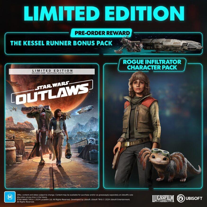 Star Wars Outlaws Limited Edition includes:* Star Wars Outlaws Base Game* The Rogue Infiltrator Character Pack includes cosmetics for Kay and Nix.Experience the first-ever open world Star Wars game and explore distinct planets across the galaxy, both iconic and new. Risk it all as Kay Vess, an emerging scoundrel seeking freedom and the means to start a new life. Fight, steal, & outwit your way through the galaxy’s crime syndicates as you join the galaxy’s most wanted.If you’re willing to take the risk, the galaxy is full of opportunity.*DISCOVER A GALAXY OF OPPORTUNITY*Explore distinct planets with bustling cities and cantinas before racing across sprawling outdoor landscapes on your speeder. Each planet brings new adventures, unique challenges, and enticing rewards if you’re willing to take the risk.*EXPERIENCE AN ORIGINAL SCOUNDREL STORY*Live the high-stakes lifestyle of an outlaw. With Nix by your side, turn any situation to your advantage: fight with your blaster, overcome enemies with stealth and gadgets, or find the right moments to distract enemies and gain the upper hand.*EMBARK ON HIGH-STAKES MISSIONS*Take on high-risk, high-reward missions from the galaxy’s crime syndicates. Steal valuable goods, infiltrate secret locations, and outwit enemies as one of the galaxy’s most wanted. Every choice you make influences your ever-changing reputation.*JUMP INTO THE PILOT SEAT*Pilot your ship, The Trailblazer, as you engage in thrilling dogfights with The Empire and other foes, finding the right opportunities to chase, evade, and attack to get the upper hand.\*\*Internet required to install game