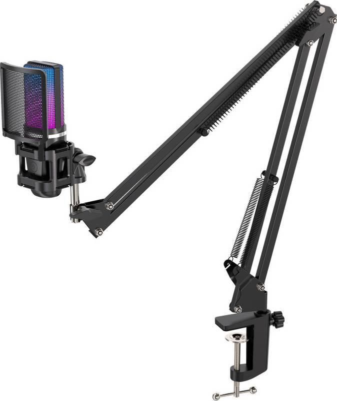 Playmax RGB Black Microphone with arm and TripodFeatures:* RGB Light effect: 6 colour changes automatically on rotation.* Tap to mute button: Mute your microphone instantly with the easy tap to mute button* Volume Control: Instantly control the volume of your microphone with the volume control scroll wheel at the time of recording.* Cardioid Polar Pattern: Cardioid cartridge ensures high sensitivity for main sound source & noise cancellation. Best for music studio recording, chatting, streaming, or podcasting.* Durable and portable: your microphone is equipped with a stable and sturdy tripod stand which has anti-slip and a boom arm.Specs:* Polar Pattern:Cardioid* Max Sampling rate:96KHz/24Bit* Frequency Response:* 20Hz-20kHz* Sensitivity:-40dB+3dB* S/N Ratio:89dB* Max. SPL:110dB* USB Cable LengthUSB:2mIncludes:1× Microphone1× Foldable Tripod1× Pop Filter1× Boom Arm1× USB cable1× Integrated Desktop base