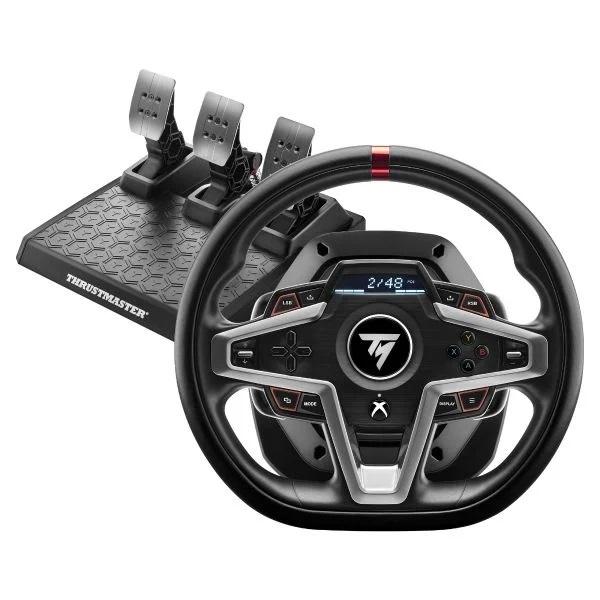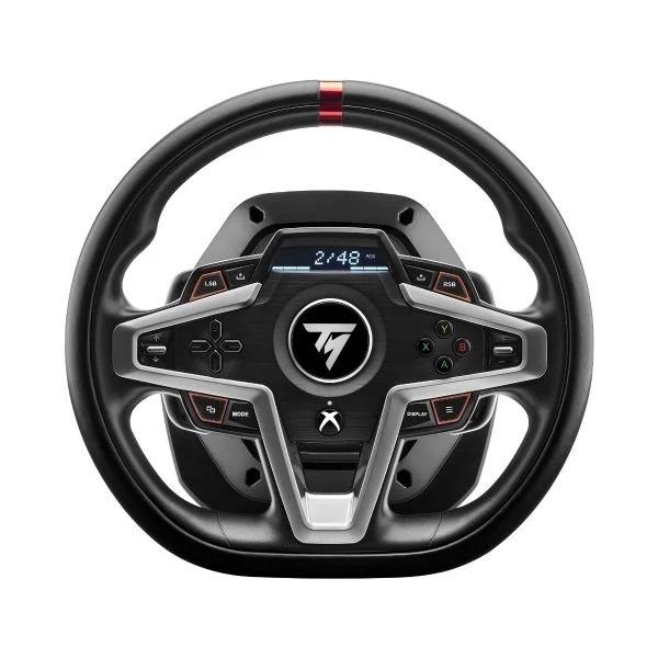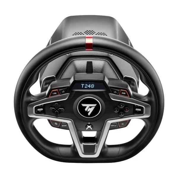 T248 features a new optimized HYBRID DRIVE system with a mixed belt and gear mechanism for powerful, realistic and versatile Force Feedback.T248 delivers 70% more power (compared with previous Thrustmaster TMX series hybrid racing wheels) and adds cutting-edge new features including Force Feedback presets that can be changed on the fly in games, magnetic paddle shifters, an interactive screen with more than 20 different displays, and a magnetic pedal set with 4 pressure modes on the brake pedal.T248 has been designed for all gamers looking for performance and immersion — including those keen to free themselves from their keyboard, mouse or gamepad, and users who want to take their racing to the next level after having started out with a wheel aimed at beginners. This brand-new racing wheel is officially licensed for Xbox Series X|S, Xbox One, and is compatible with PC.Features:* Premium design with leather wrapping on the outer-facing portion of the wheel* Versatile wheel shape, well-suited to all racing game styles* Up to 25 action buttons including 2 dual-position encoders on PC* Interactive race dashboard with a selection of more than 20 different displays on the wheel’s screen* Dynamic Force Feedback: on-the-fly Force Feedback level adjustment (3 preset modes included) via the screen, compatible with all games* Magnetic paddle shifters (patented H.E.A.R.T technology) for instant responsiveness, and a super-clear gear shifting feel* Magnetic pedal set (patented H.E.A.R.T technology) for incredible 12-bit resolution precision that won’t decrease over time* 4 distinct pressure modes on the central pedal for optimized braking according to the configuration and gaming setup (desk, cockpit, stand, etc.)* Next-generation HYBRID DRIVE system delivering 70% more power than other Thrustmaster hybrid racing wheels (TMX series)* Officially licensed for Xbox; compatible with Xbox Series X|S, Xbox One and PC