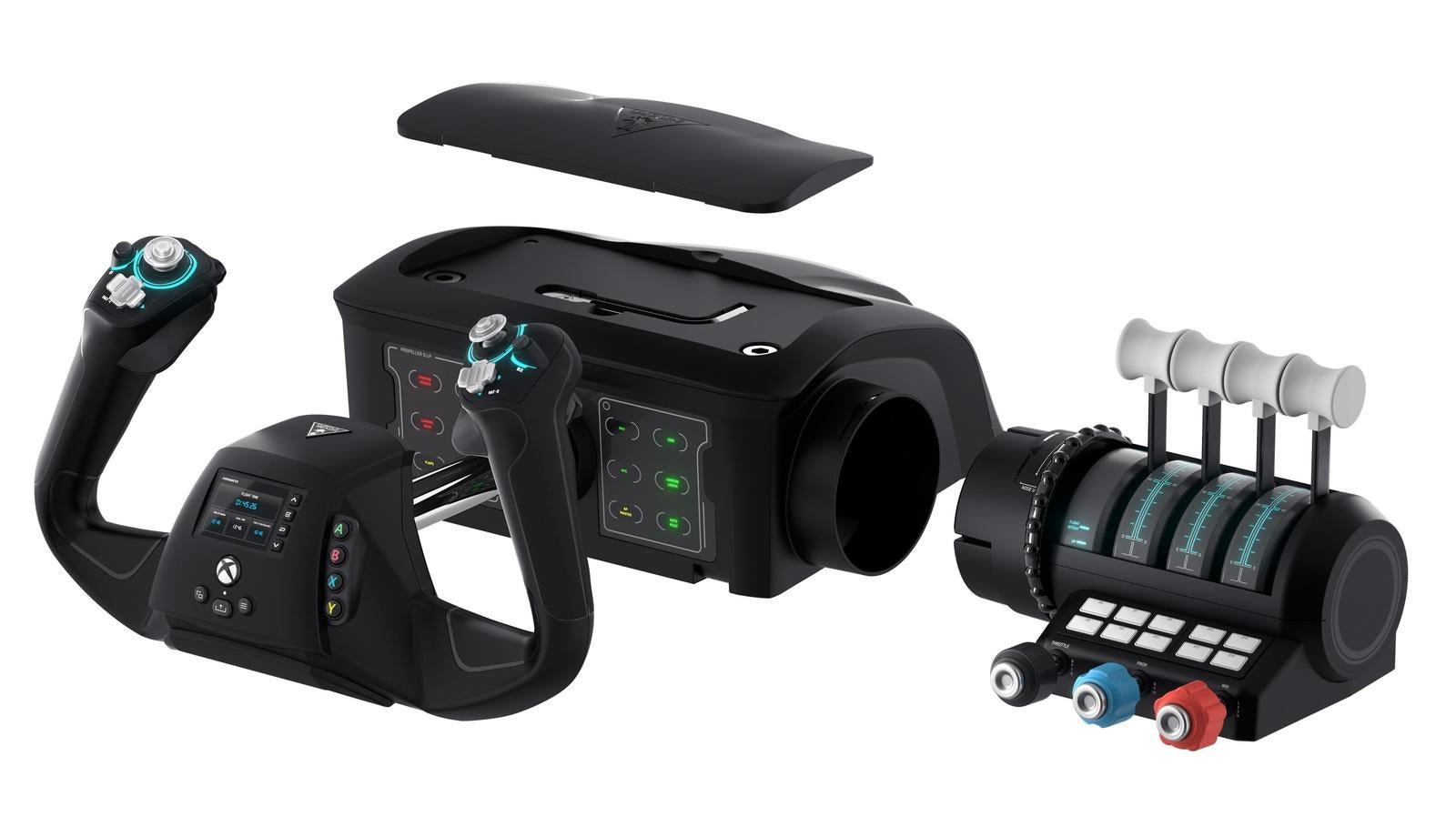Developed by world-class aeronautical engineers and pilots, the Turtle Beach VelocityOne Flight Universal Control System offers the most immersive, authentic flying experience on the market. A true-to-life 180° yoke handle with built-in rudder controls provide precise, long lasting control of any aircraft. The modular throttle quadrant with integrated trim wheel and included custom lever handles offers at-home aviators enhanced customization for both light and heavy aircrafts. The Flight Management Display delivers on-the-fly information, while the status indicator panel provides real- time alerts on supported simulation titles for Xbox & PC. Setup is easy with a simple USB connection for Xbox Series X|S & Xbox One or Windows.*UNIVERSAL DESIGN*VelocityOne Flight includes everything you need to get off the ground. The Included throttle quadrant with dedicated trim wheel, and a realistic yoke with integrated rudder controls equips every home-pilot with a full suite of controls right out of the box. Plus, experience immersive audio and coordinate your flight through the integrated headset audio jack.*Realistic Yoke Handle*True to life 180° yoke handle rotation tuned for smooth and precise adjustments of any aircraft. Built to last with a non-contact hall effect sensor in the yoke shaft, you’ll have smooth control over long-term usage.*Modular Throttle Quadrant*Dual lever and vernier controls along with 10 programmable buttons and an integrated pitch trim wheel provide a realistic experience for both light aircrafts and heavy jets. Customize your throttle controls with included swappable throttle tops to match your preferred flight experience.*Flight Management Display*The full color display with dedicated controls helps you learn and configure the system on the-fly. Easily switch between input modes, time your flight and use the training feature to familiarize yourself with each control so you spend less time on the tarmac, and more time in the air.*Integrated Rudder Controls*Taxi, land and turn with ease using integrated rudder controls and toe brake buttons at your fingertips. Execute coordinated turns in the sky with ease and stay straight during takeoff and landing with dedicated rudder controls and make precise taxi maneuvers with integrated brakes.*Comprehensive Controls*Flight is equipped with 12 analog axes, two POV switches and two 4-way HAT switches. The axes provide precise control of essential control surfaces and engine systems, and the POV switches ensure you can intuitively change view and focus on critical cockpit information. With an additional 18 assignable buttons, you have everything you need to navigate any aircraft in confidence and remap controls to your preference.*Authentic Status Indicator Panel*Receive real-time status alerts and monitor essential cockpit, navigation, and engine systems from supported flight simulation titles for both Xbox & PC. Customize the color of the ambient light, or swap to a panel with preset warning indications, plus monitor the auto chronometer*Pitch Trim Wheel*The dedicated trim wheel enables fine adjustment of aircraft control surfaces and removes the need to maintain pressure on the yoke, for hands-free-flying.*Custom Lever Handles*Customize your throttle & lever controls to match your selected aircraft. Use the black, red & blue tops for prop planes, or swap to all white tops for jet aircrafts.*Secure Clamping System*The tight mounting system ensures stable integration into your home setup.*Designed for Xbox*VelocityOne Flight is designed for Xbox and Windows titles like Microsoft Flight Simulator 2020\*, X-Plane, Elite Dangerous, War Thunder and more\*\*.\*Xbox One and Xbox Cloud Gaming versions of Microsoft Flight Simulator 2020currently do not support VelocityOne Flight.\*\*Supported features may vary by game. Titles other than MSFS 2020 may requiremanual control mapping like any other normal USB sim controller or joystick.*3.5mm Headset Port*Connect your 3.5mm headset for immersive audio and coordinate your flight.Specifications:* Xbox Software Compatibility: Microsoft Flight Simulator (not compatible with Xbox Cloud Streaming)* PC Software Compatibility: Microsoft Flight Simulator 2020, Elite Dangerous, Ace Combat DCS World, X-Plane 11 & 12, War Thunder, Everspace 2 and Star Citizen* Input Connectivity: 2M USB-A to USB-C Cable to console or PC* Audio Connectivity: 1× 3.5mm audio port for stereo audio and microphone* Axes: 12 Axes. Hall effect sensor on main yoke axis. Optical encoder (trim wheel) and variable resistor (levers)* Buttons: (2) 8-way POV switches, (2) 4-way HAT switches, (6) front-facing push buttons, (2) rear-facing push buttons, Xbox system buttons, (10) quadrant buttons* Screen: Flight Management Display – Full color, 320 × 230 with adjustable backlight* Lighting: RGB LEDs, adjustable via VelocityOne Flight Management Display* Status Indicator Panel: (12) RGB LEDs with (3) included swappable backlit status panels* Desk Clamp: Included* Dimensions: L 483mm (19.01”) x W 496mm (19.5”) x H 183mm (7.2”)